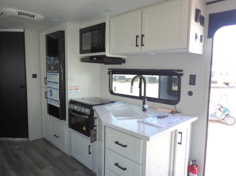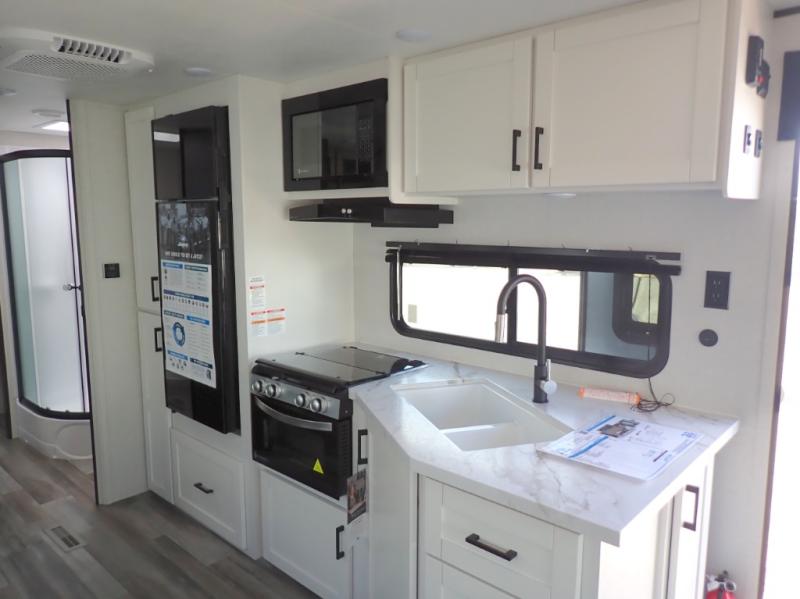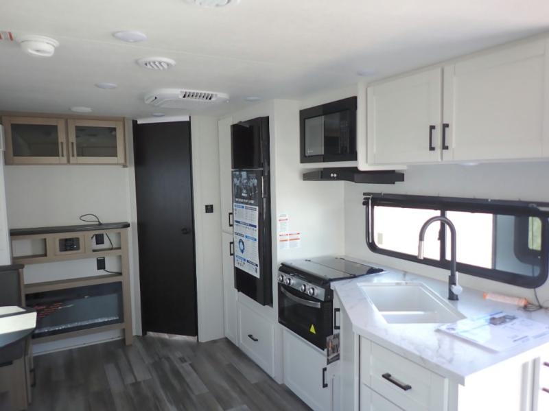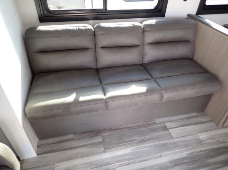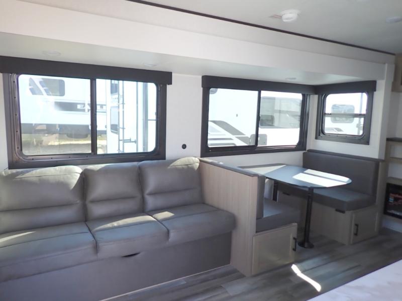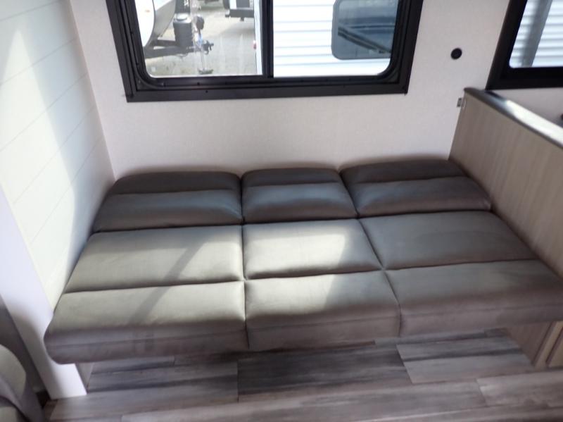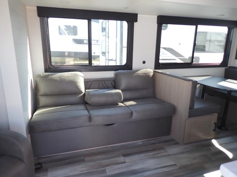 You can comfortably sleep up to six people in this trailer thanks to the RV queen bed in the front bedroom, plus the booth dinette and jack-knife sofa in the main living area! The chef of your crew will have a three burner cooktop and microwave oven to prepare meals, and everyone can store their favorite drinks in the 8 cu. ft. 12V refrigerator. The walk-through bath is spacious and includes a radius shower, toilet, a sink, and linen closet and is the full width of the unit. The outside storage will let you bring along camp chairs and games, fishing poles and more, plus the 18' 3" power awning with LED lights will create a nice place to gather in the evenings!