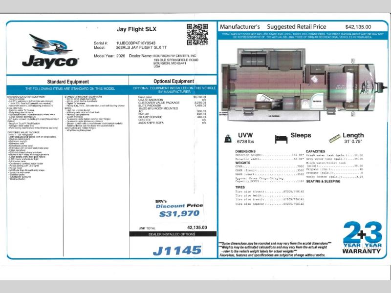 Not too big, and not too small! The Jay Flight 262RLS is the perfect size RV for a couple. Enough room to be comfortable when it's just the two of you, plus a little extra for when the grandkids tag along! This is a rear living room floorplan. Half-ton towable.