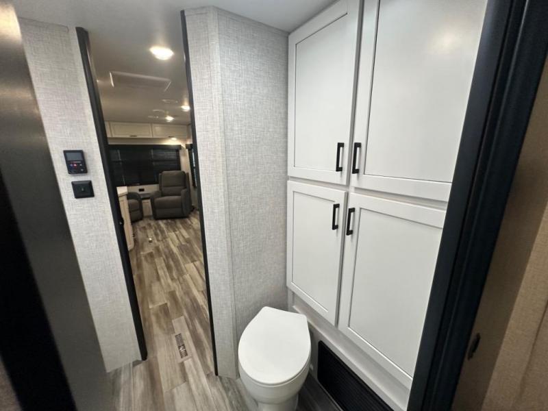 You can comfortably sleep up to six people in this trailer thanks to the RV queen bed in the front bedroom, plus the booth dinette and jack-knife sofa in the main living area! The chef of your crew will have a three burner cooktop and microwave oven to prepare meals, and everyone can store their favorite drinks in the 8 cu. ft. 12V refrigerator. The walk-through bath is spacious and includes a radius shower, toilet, a sink, and linen closet and is the full width of the unit. The outside storage will let you bring along camp chairs and games, fishing poles and more, plus the 18' 3" power awning with LED lights will create a nice place to gather in the evenings!