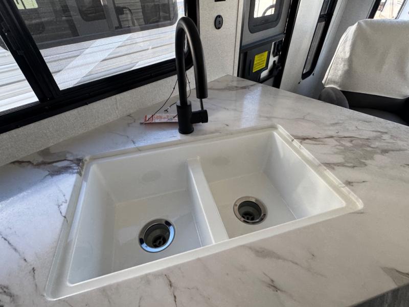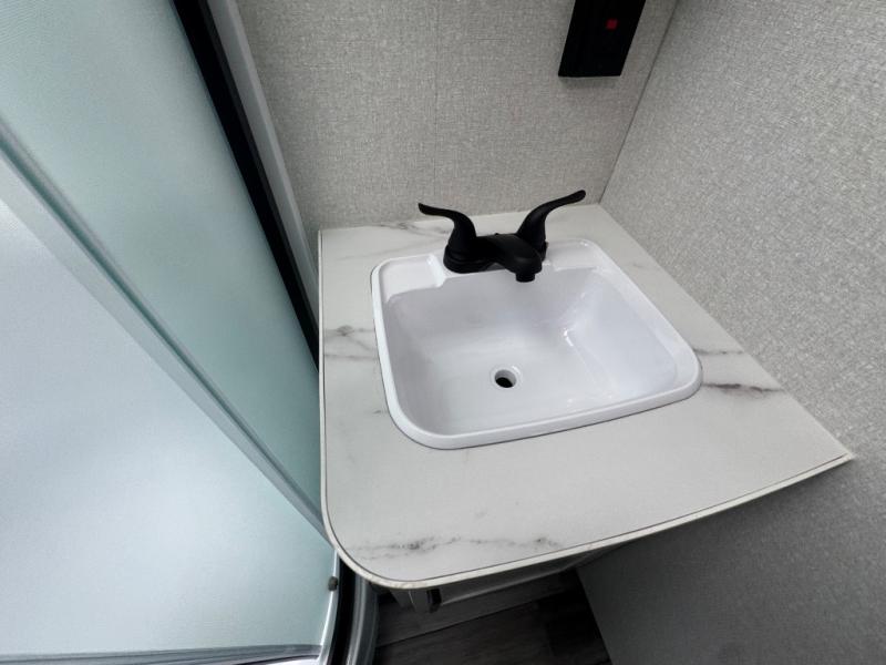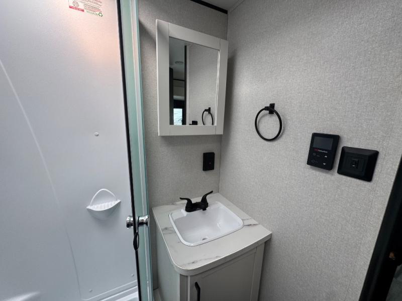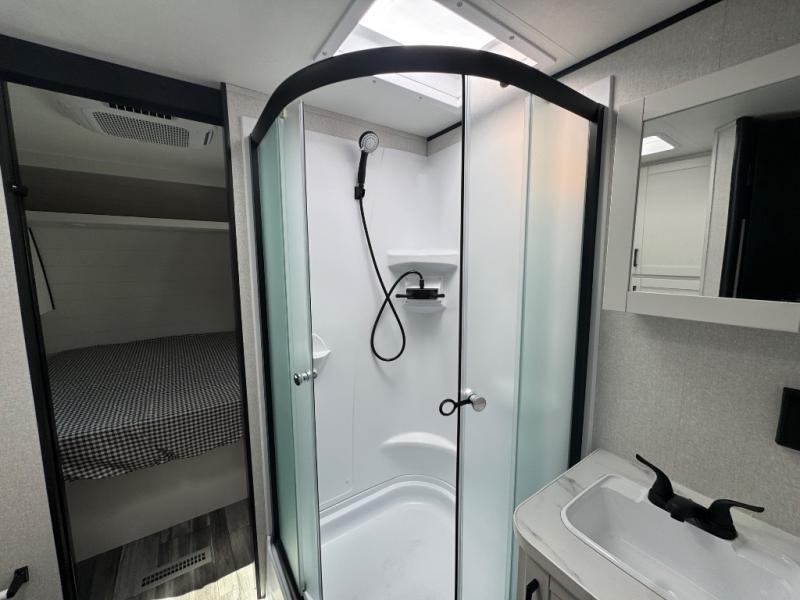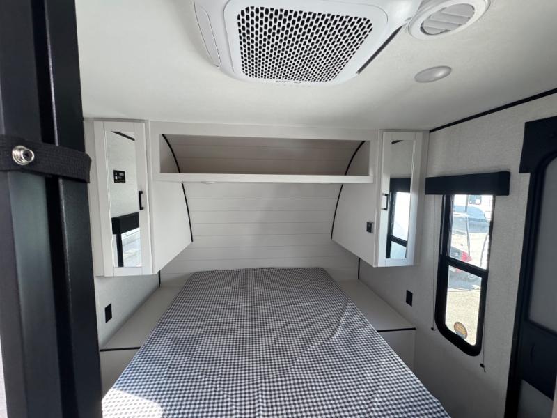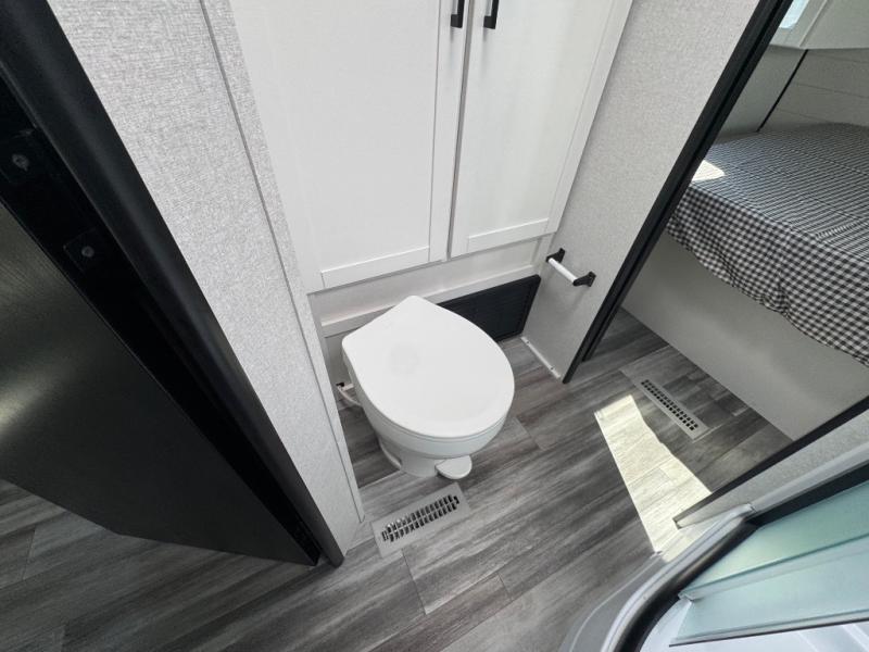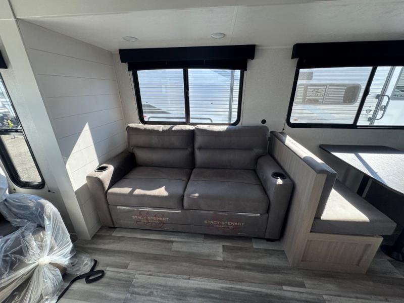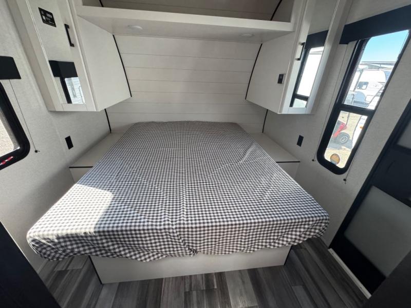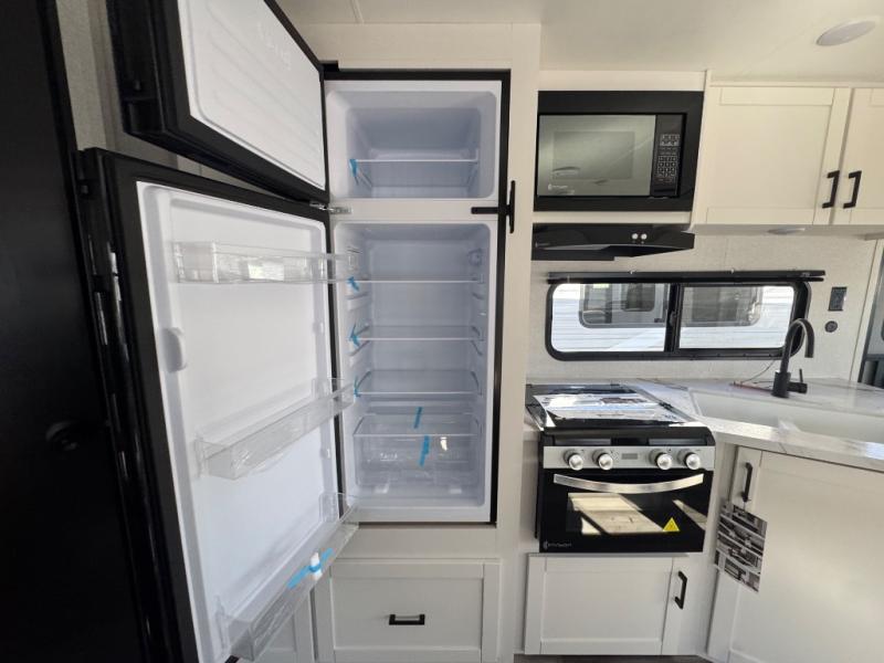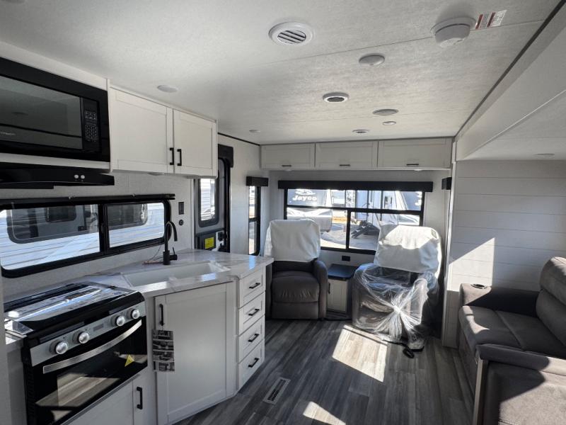 You can comfortably sleep up to six people in this trailer thanks to the RV queen bed in the front bedroom, plus the booth dinette and jack-knife sofa in the main living area! The chef of your crew will have a three burner cooktop and microwave oven to prepare meals, and everyone can store their favorite drinks in the 8 cu. ft. 12V refrigerator. The walk-through bath is spacious and includes a radius shower, toilet, a sink, and linen closet and is the full width of the unit. The outside storage will let you bring along camp chairs and games, fishing poles and more, plus the 18' 3" power awning with LED lights will create a nice place to gather in the evenings!