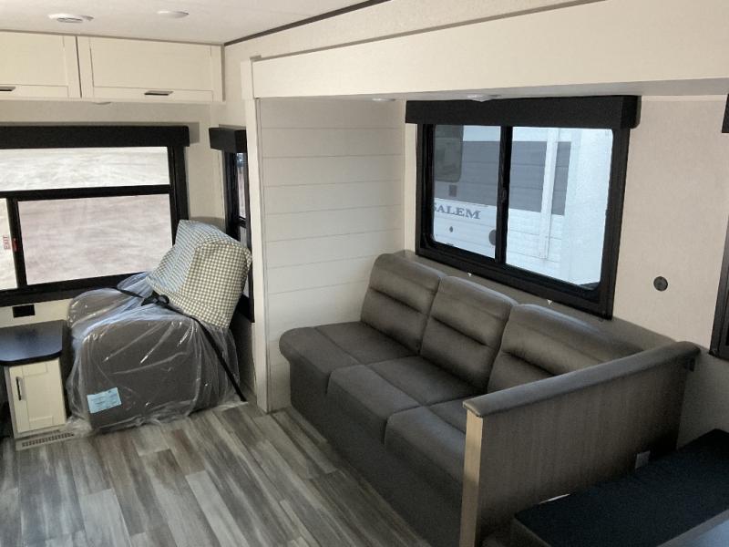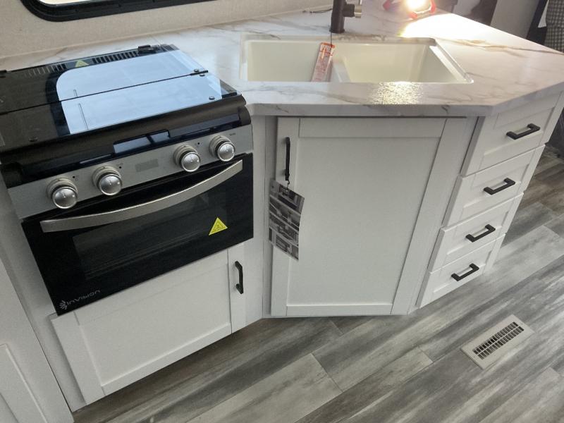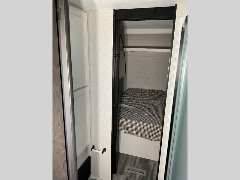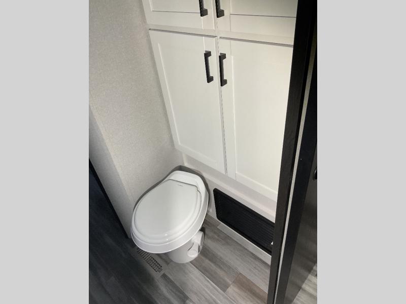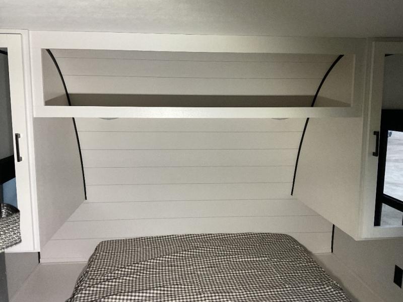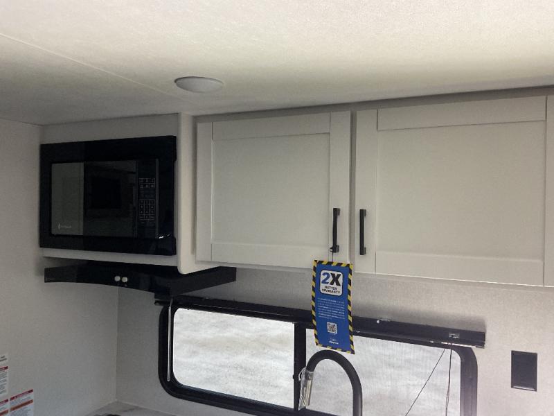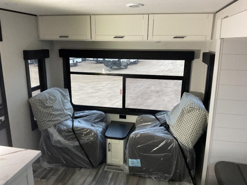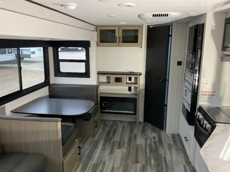 You can comfortably sleep up to six people in this trailer thanks to the RV queen bed in the front bedroom, plus the booth dinette and jack-knife sofa in the main living area! The chef of your crew will have a three burner cooktop and microwave oven to prepare meals, and everyone can store their favorite drinks in the 8 cu. ft. 12V refrigerator. The walk-through bath is spacious and includes a radius shower, toilet, a sink, and linen closet and is the full width of the unit. The outside storage will let you bring along camp chairs and games, fishing poles and more, plus the 18' 3" power awning with LED lights will create a nice place to gather in the evenings!