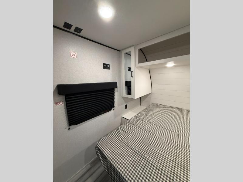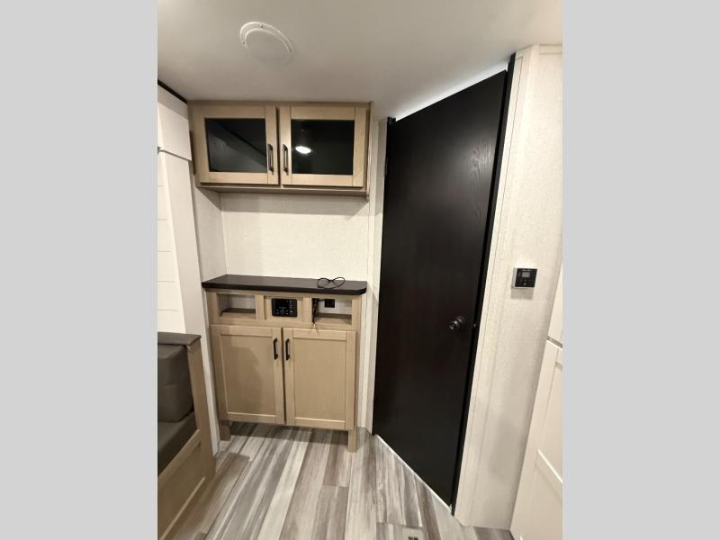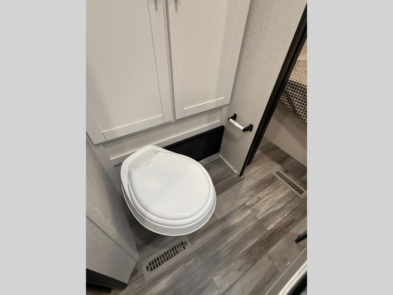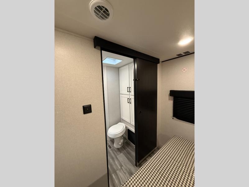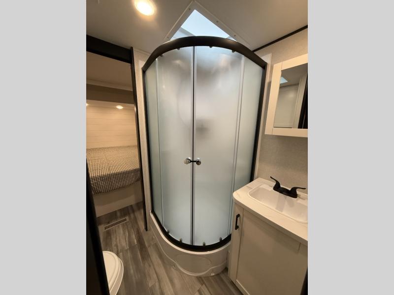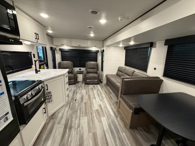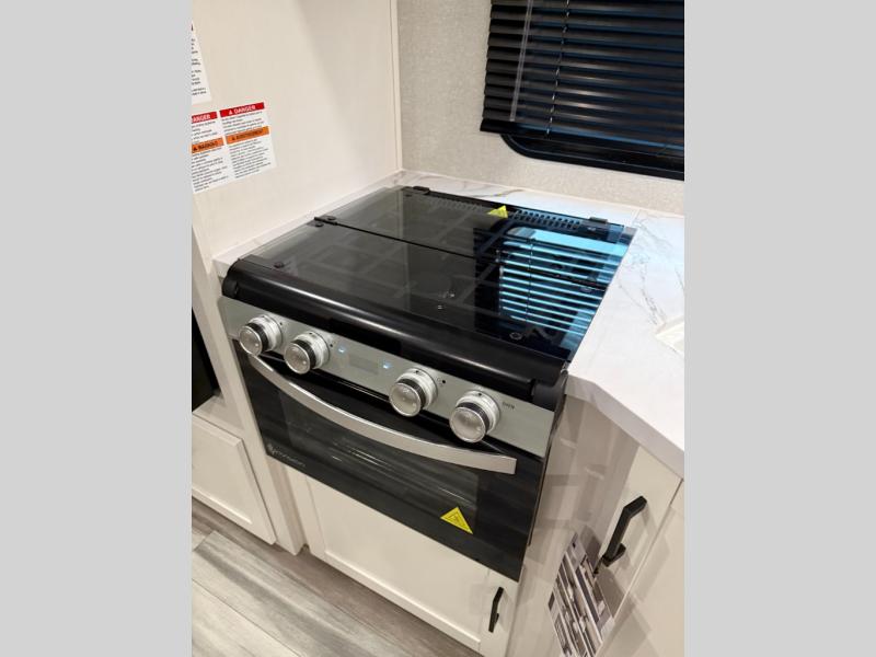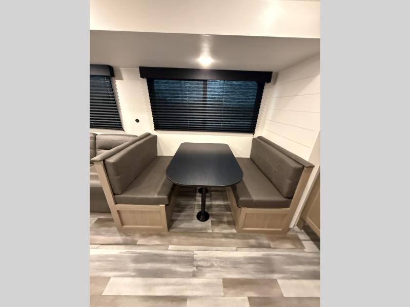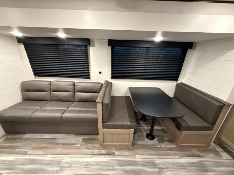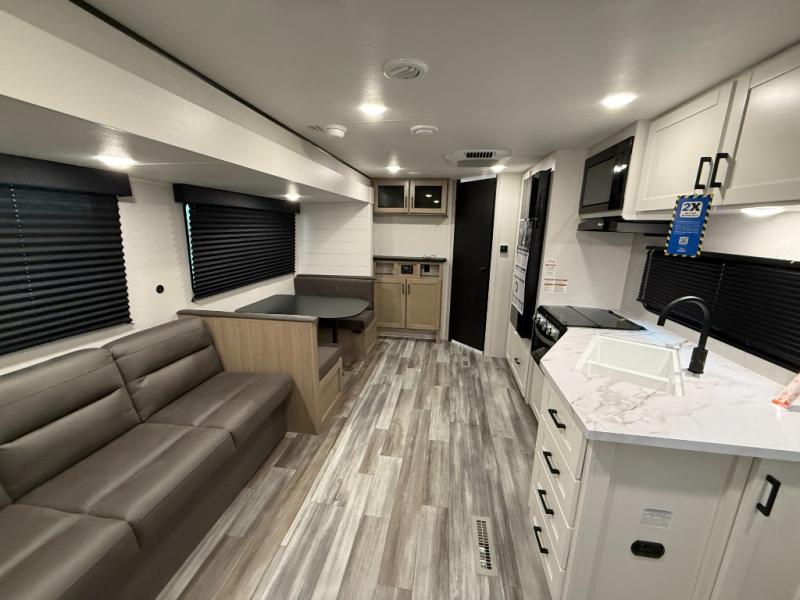 You can comfortably sleep up to six people in this trailer thanks to the RV queen bed in the front bedroom, plus the booth dinette and jack-knife sofa in the main living area! The chef of your crew will have a three burner cooktop and microwave oven to prepare meals, and everyone can store their favorite drinks in the 8 cu. ft. 12V refrigerator. The walk-through bath is spacious and includes a radius shower, toilet, a sink, and linen closet and is the full width of the unit. The outside storage will let you bring along camp chairs and games, fishing poles and more, plus the 18' 3" power awning with LED lights will create a nice place to gather in the evenings!