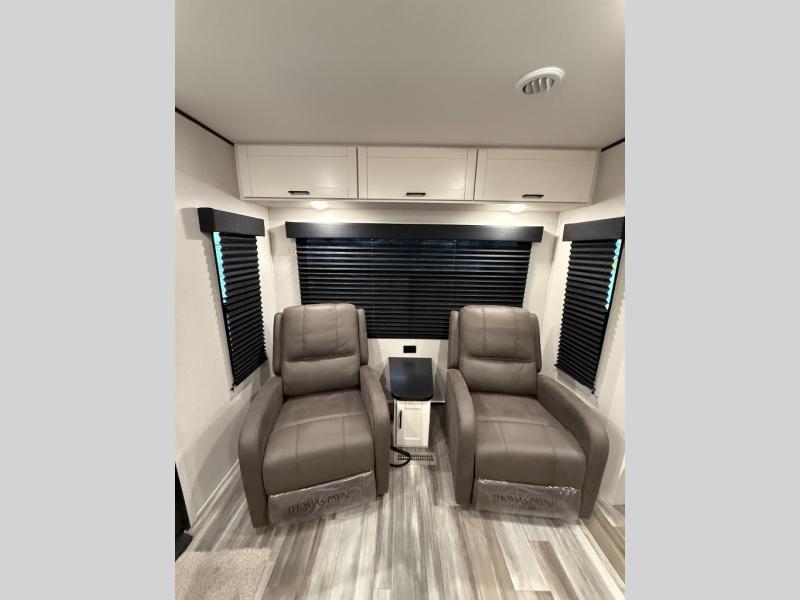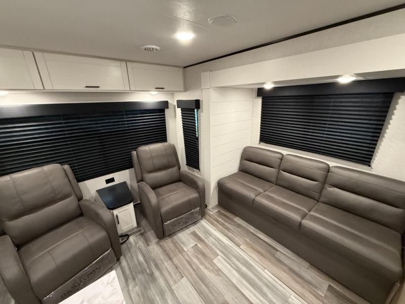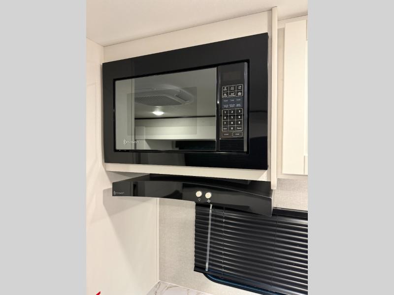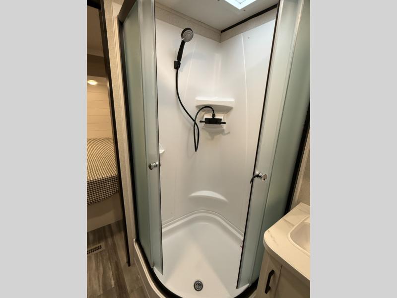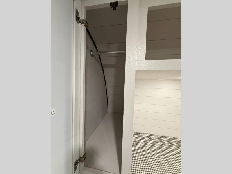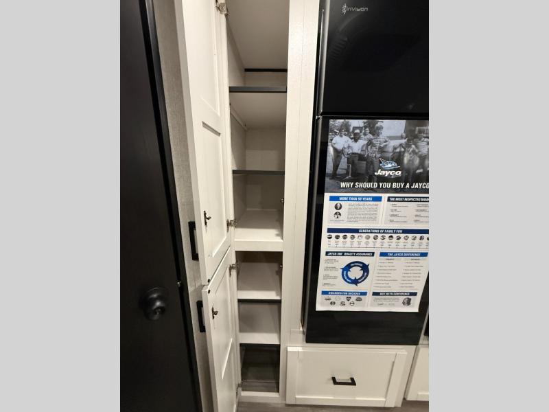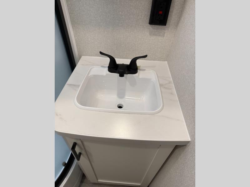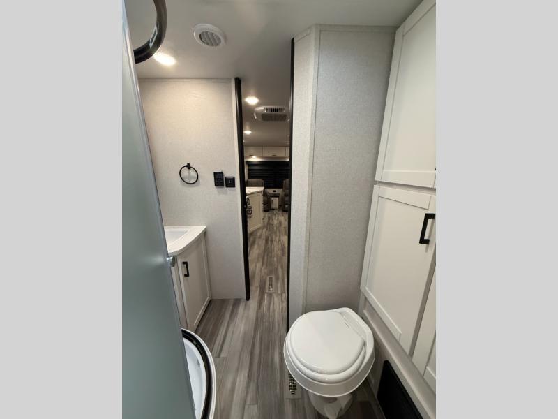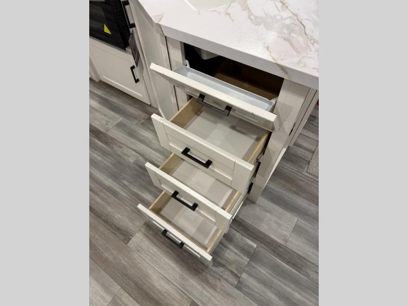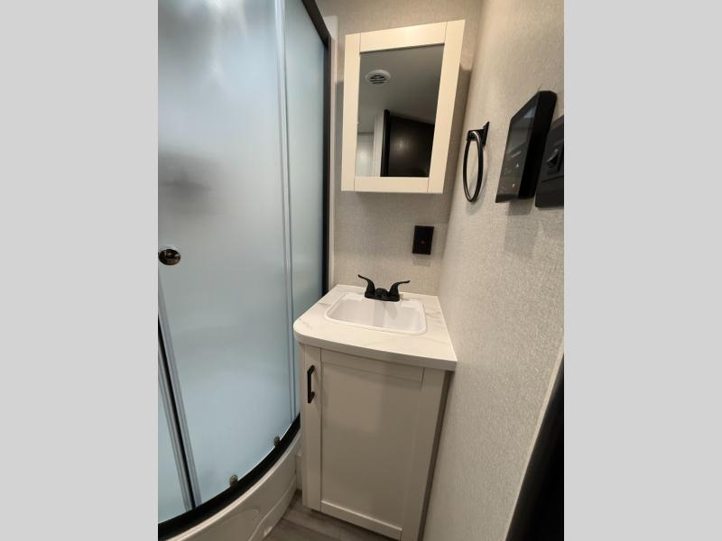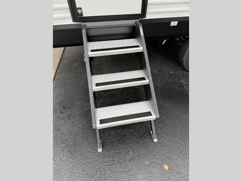 You can comfortably sleep up to six people in this trailer thanks to the RV queen bed in the front bedroom, plus the booth dinette and jack-knife sofa in the main living area! The chef of your crew will have a three burner cooktop and microwave oven to prepare meals, and everyone can store their favorite drinks in the 8 cu. ft. 12V refrigerator. The walk-through bath is spacious and includes a radius shower, toilet, a sink, and linen closet and is the full width of the unit. The outside storage will let you bring along camp chairs and games, fishing poles and more, plus the 18' 3" power awning with LED lights will create a nice place to gather in the evenings!