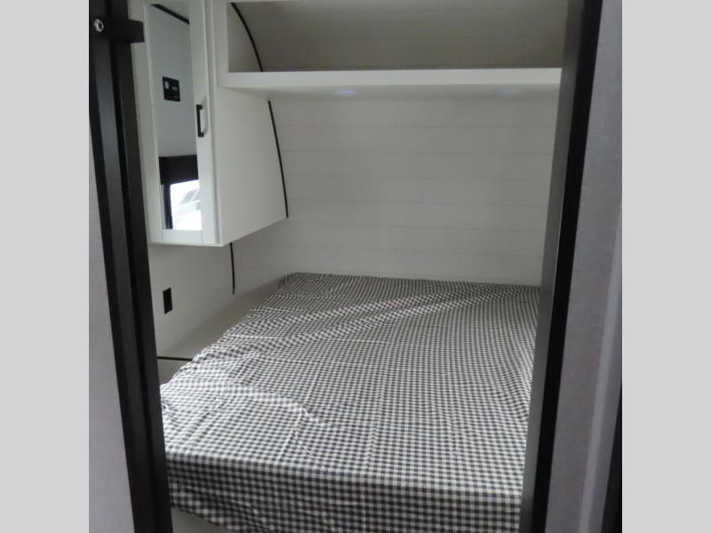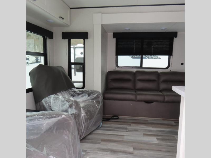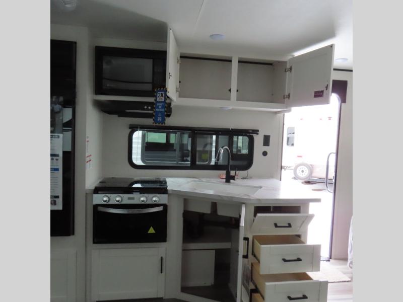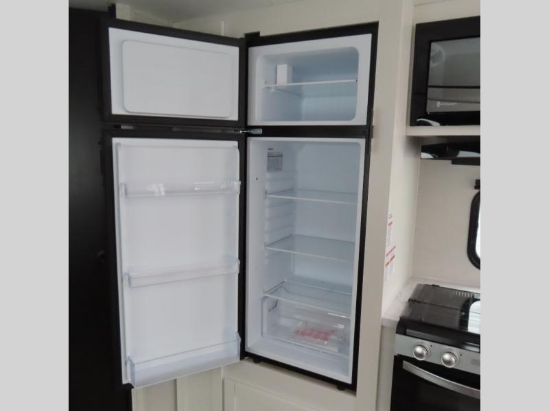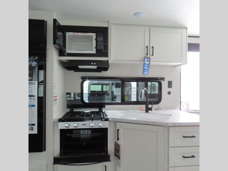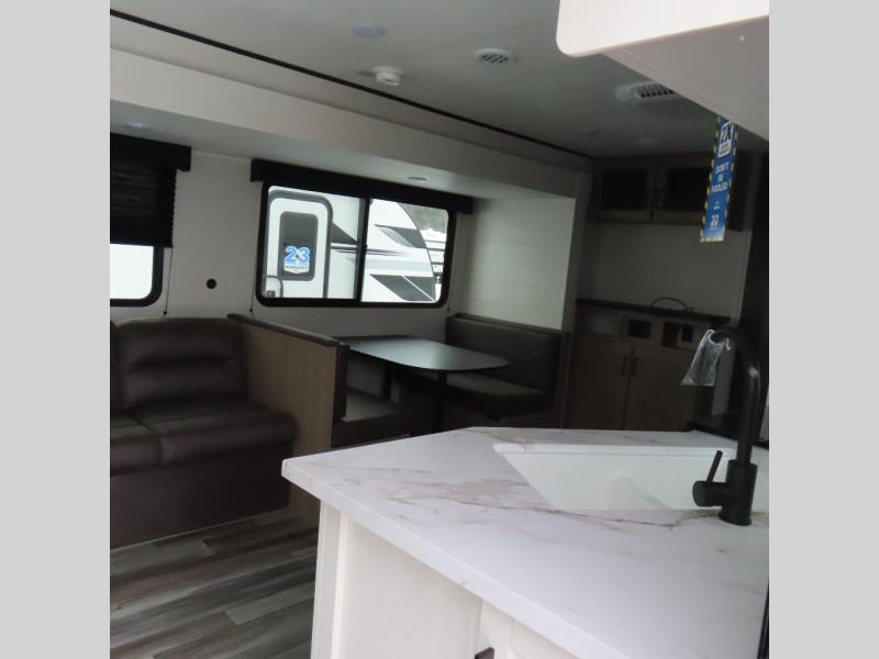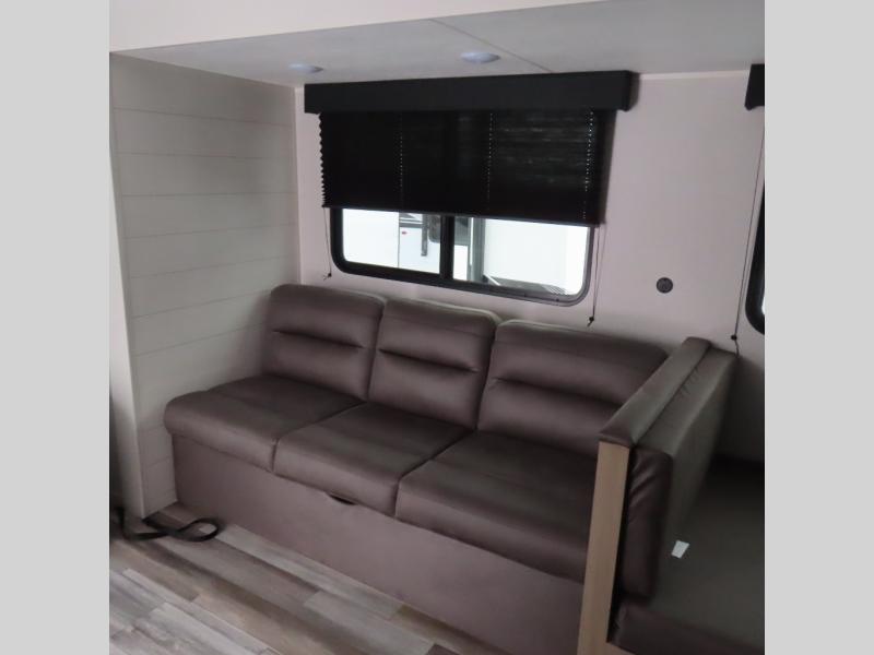 You can comfortably sleep up to six people in this trailer thanks to the RV queen bed in the front bedroom, plus the booth dinette and jack-knife sofa in the main living area! The chef of your crew will have a three burner cooktop and microwave oven to prepare meals, and everyone can store their favorite drinks in the 8 cu. ft. 12V refrigerator. The walk-through bath is spacious and includes a radius shower, toilet, a sink, and linen closet and is the full width of the unit. The outside storage will let you bring along camp chairs and games, fishing poles and more, plus the 18' 3" power awning with LED lights will create a nice place to gather in the evenings!
