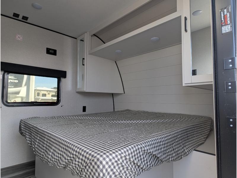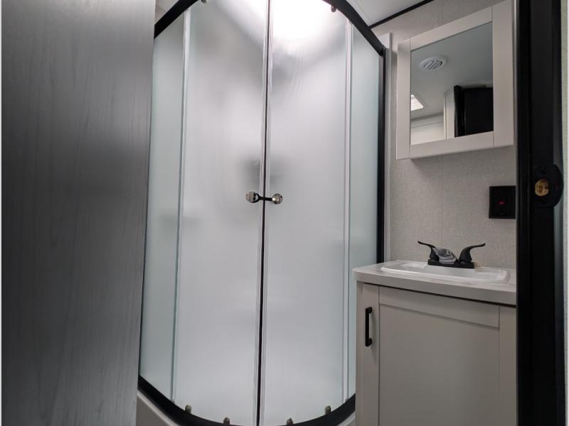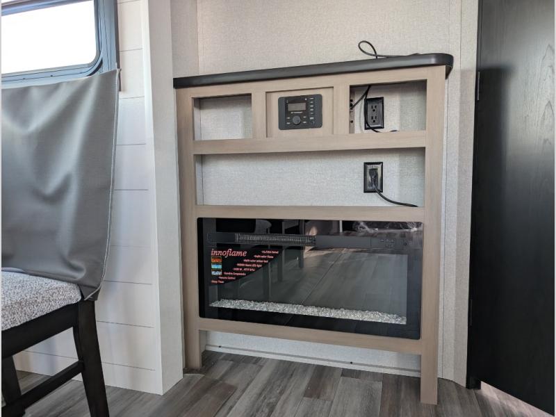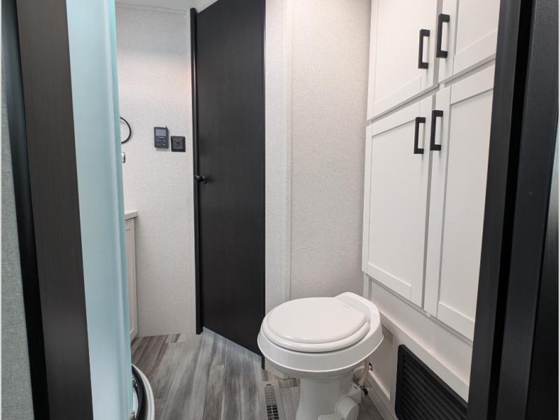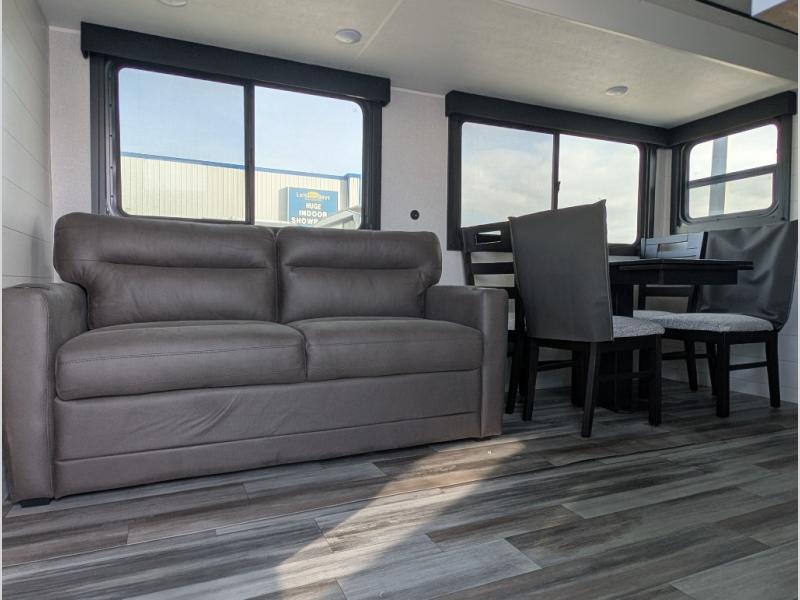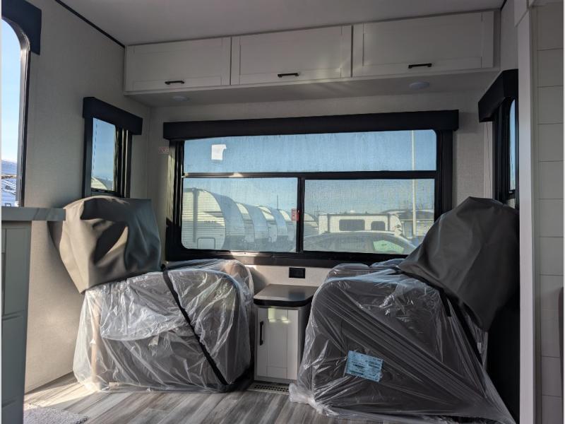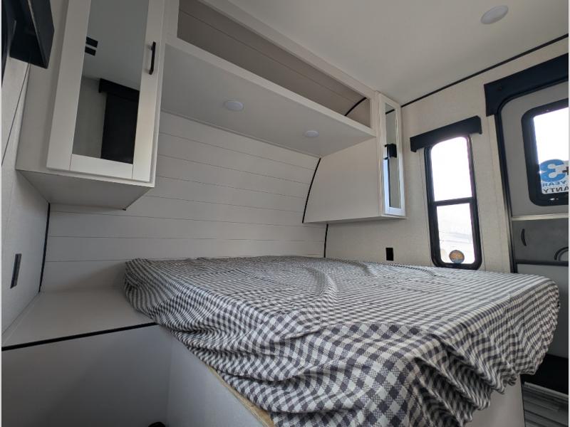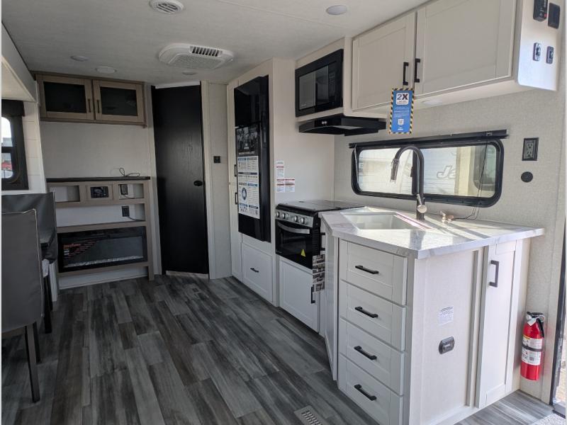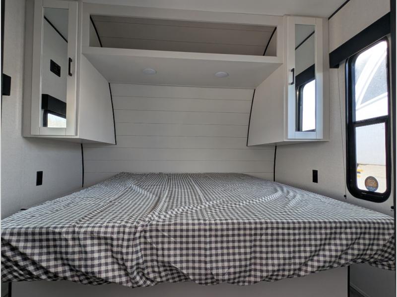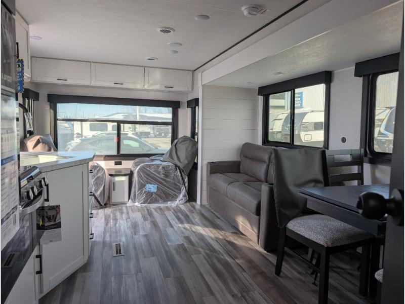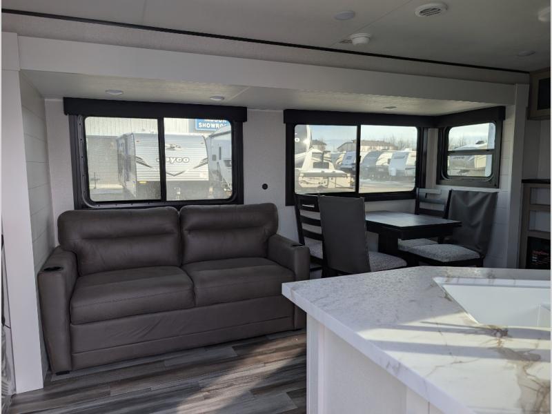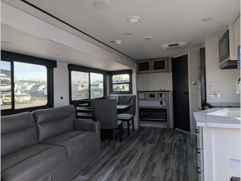 You can comfortably sleep up to six people in this trailer thanks to the RV queen bed in the front bedroom, plus the booth dinette and jack-knife sofa in the main living area! The chef of your crew will have a three burner cooktop and microwave oven to prepare meals, and everyone can store their favorite drinks in the 8 cu. ft. 12V refrigerator. The walk-through bath is spacious and includes a radius shower, toilet, a sink, and linen closet and is the full width of the unit. The outside storage will let you bring along camp chairs and games, fishing poles and more, plus the 18' 3" power awning with LED lights will create a nice place to gather in the evenings!