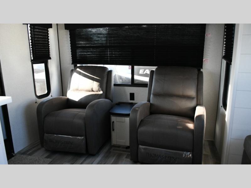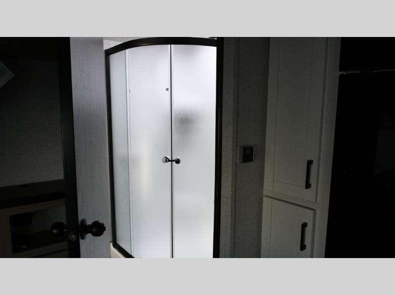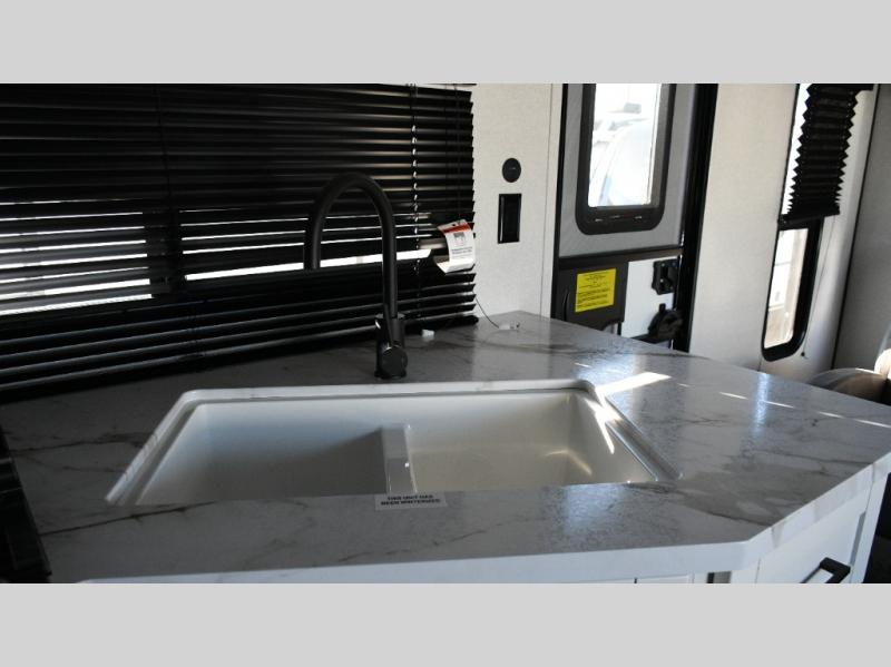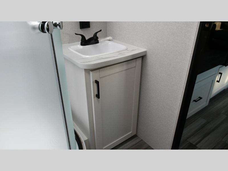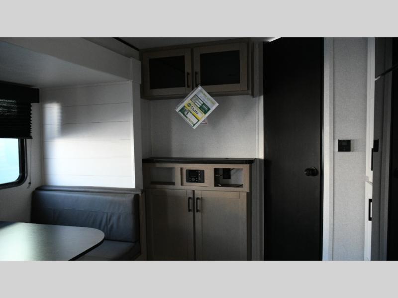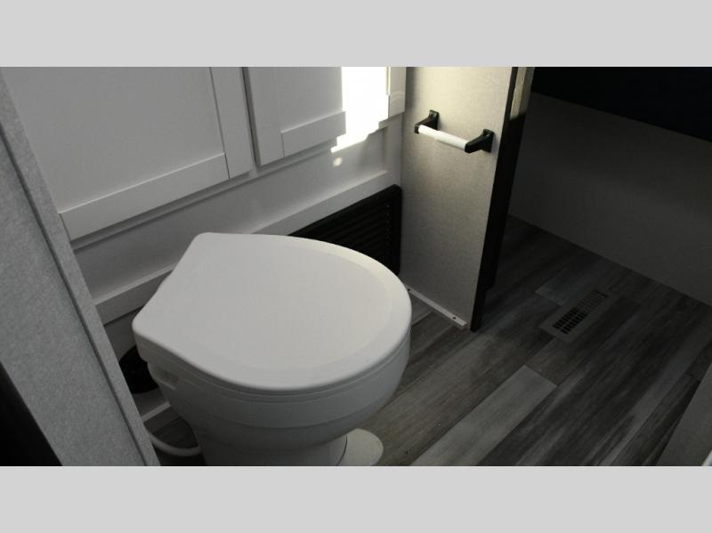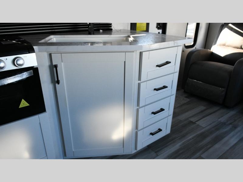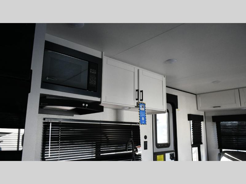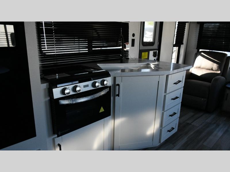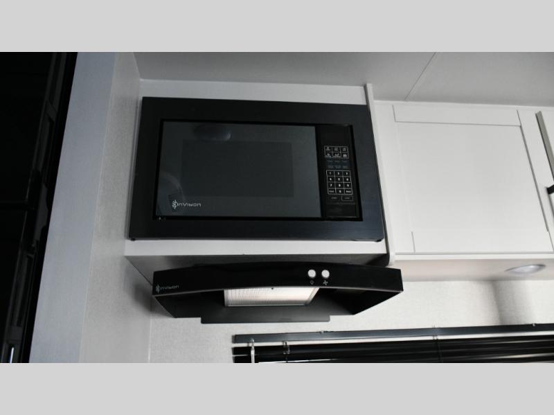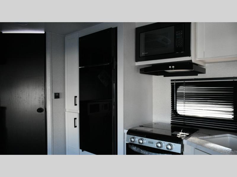Fully Equipped Kitchen – Three-burner cooktop, microwave oven, and an 8 cu. ft. 12V refrigerator keep meals simple and satisfying.