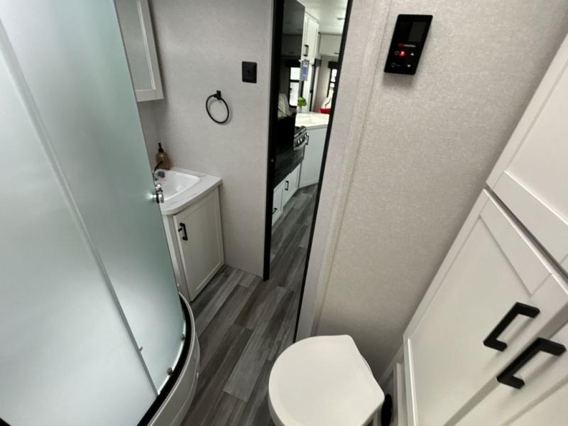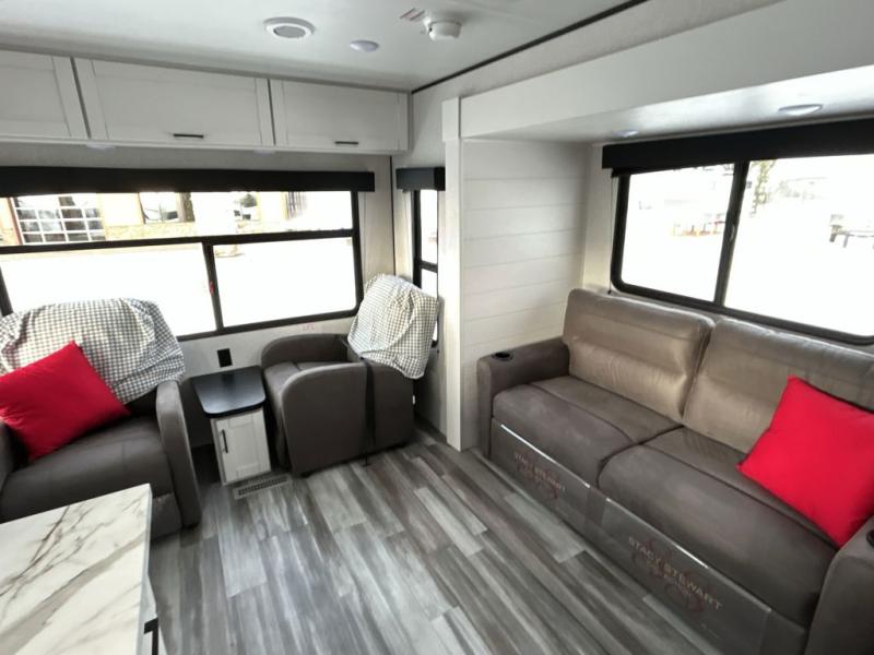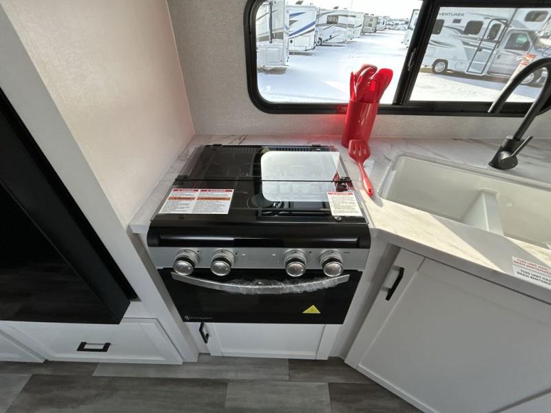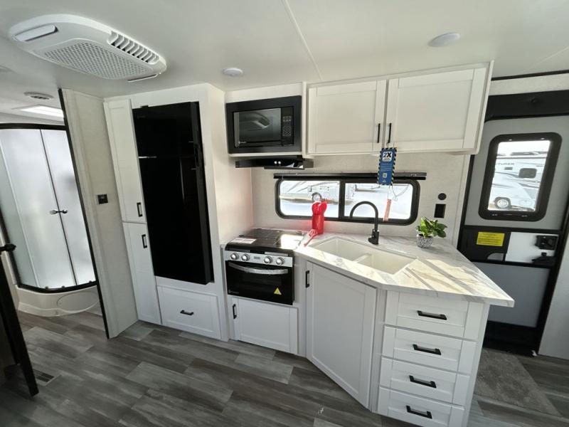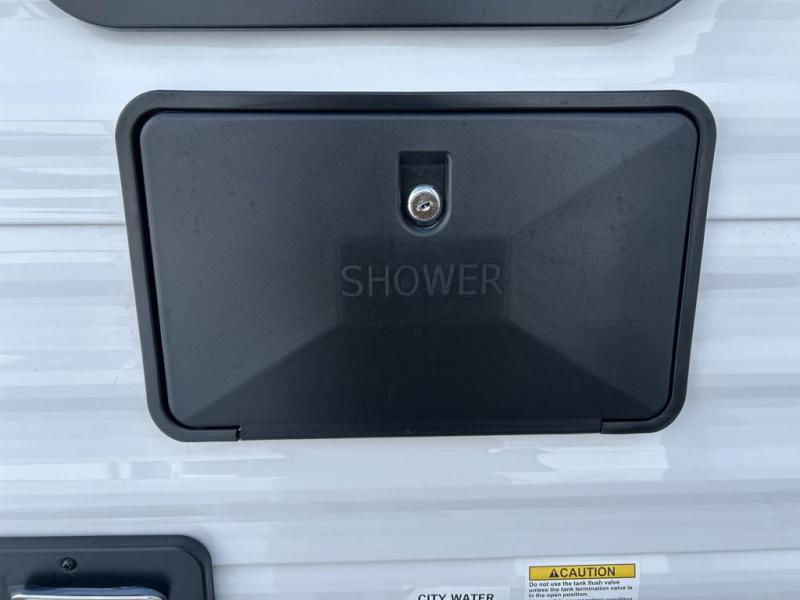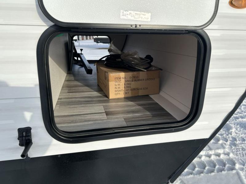 You can comfortably sleep up to six people in this trailer thanks to the RV queen bed in the front bedroom, plus the booth dinette and jack-knife sofa in the main living area! The chef of your crew will have a three burner cooktop and microwave oven to prepare meals, and everyone can store their favorite drinks in the 8 cu. ft. 12V refrigerator. The walk-through bath is spacious and includes a radius shower, toilet, a sink, and linen closet and is the full width of the unit. The outside storage will let you bring along camp chairs and games, fishing poles and more, plus the 18' power awning with LED lights will create a nice place to gather in the evenings!