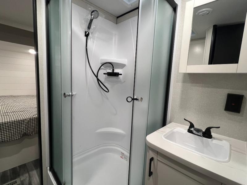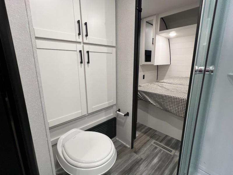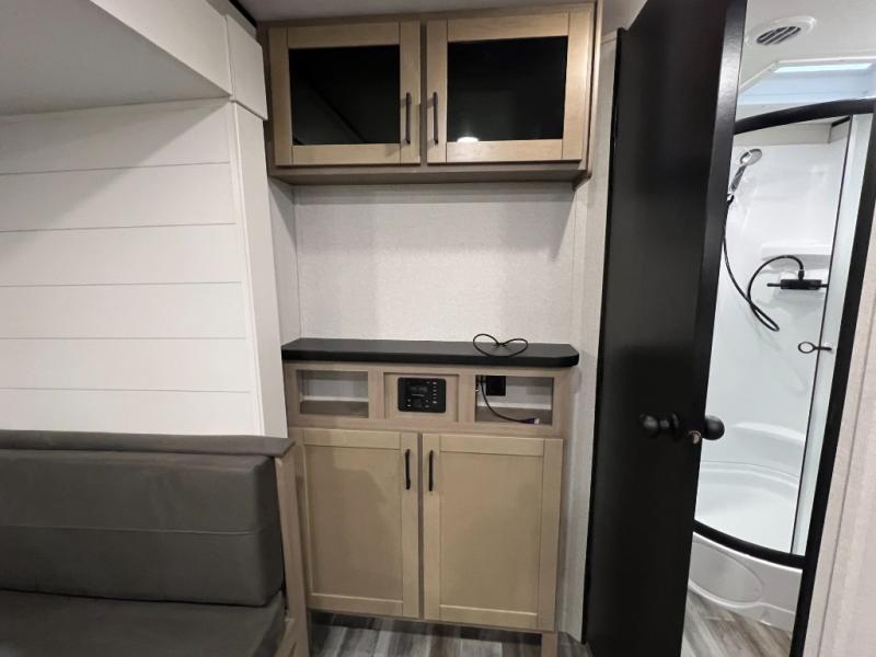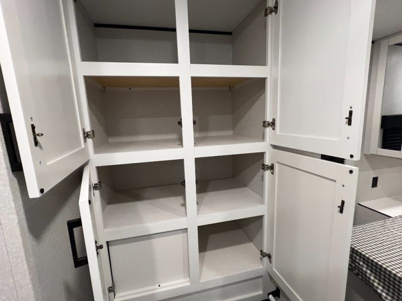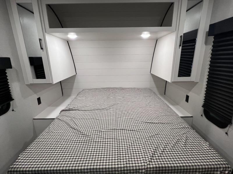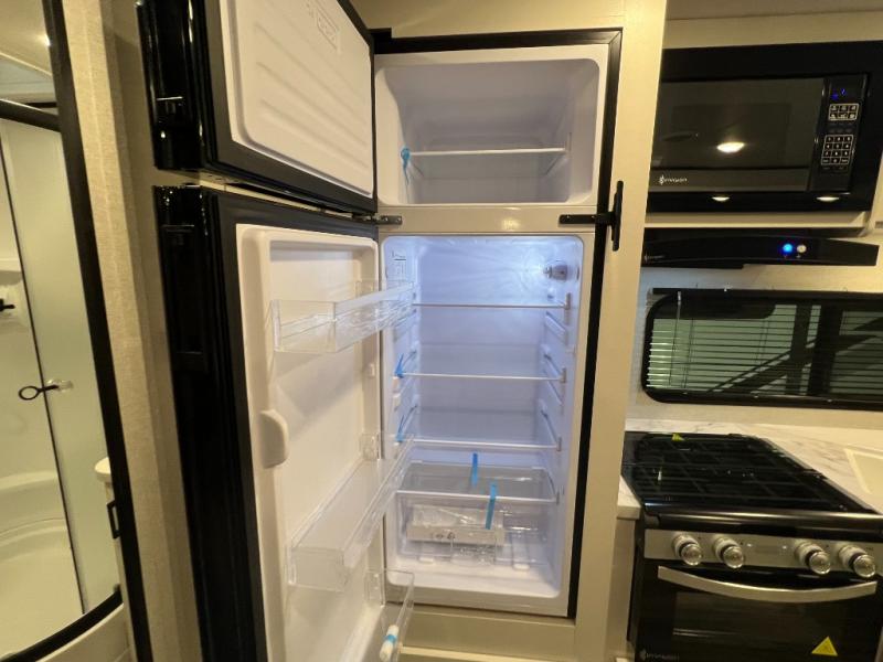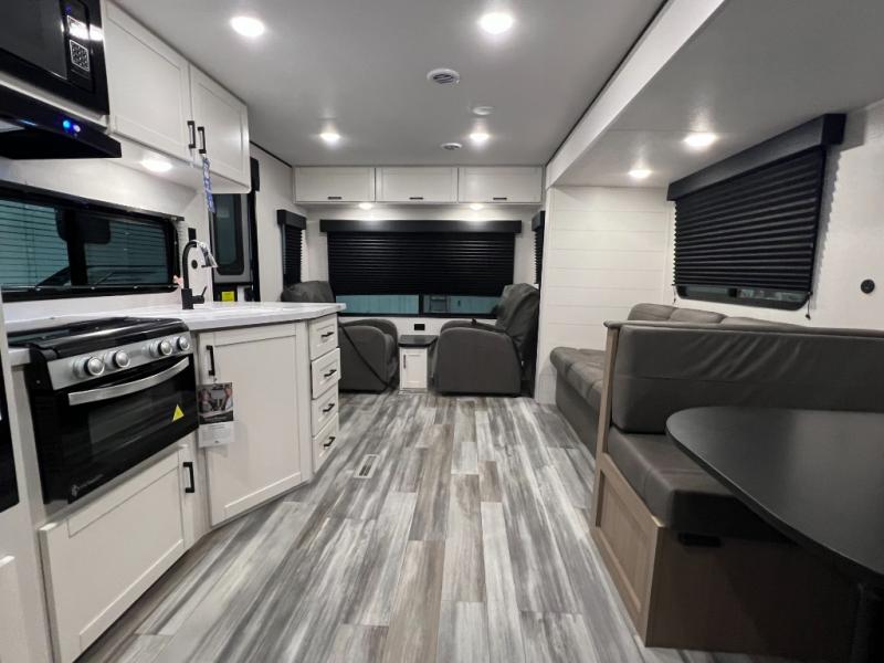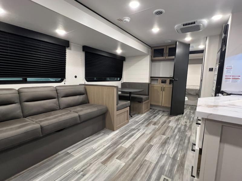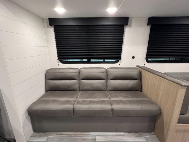 You can comfortably sleep up to six people in this trailer thanks to the RV queen bed in the front bedroom, plus the booth dinette and jack-knife sofa in the main living area! The chef of your crew will have a three burner cooktop and microwave oven to prepare meals, and everyone can store their favorite drinks in the 8 cu. ft. 12V refrigerator. The walk-through bath is spacious and includes a radius shower, toilet, a sink, and linen closet and is the full width of the unit. The outside storage will let you bring along camp chairs and games, fishing poles and more, plus the 18' power awning with LED lights will create a nice place to gather in the evenings!