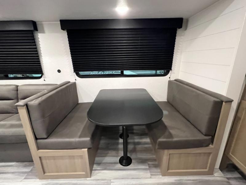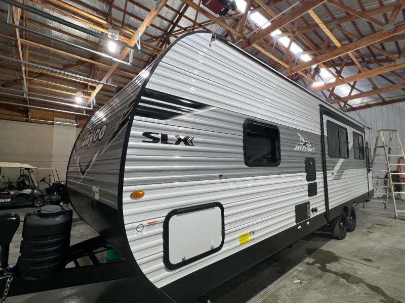 The Jayco Jay Flight SLX travel trailer is quite easy to own because it is lightweight for an easier towing experience. Built on a fully integrated A-frame with galvanized-steel, impact-resistant wheel wells, the Jay Flight SLX has quality at its very foundation. That quality continues on to the electric self-adjusting brakes, easy-lube hubs, Magnum Truss roof system, and LP quick connect. Some of what the mandatory Customer Value Package includes is backup camera prep, Keyed-Alike entry and baggage doors, and an on-demand tankless water heater.