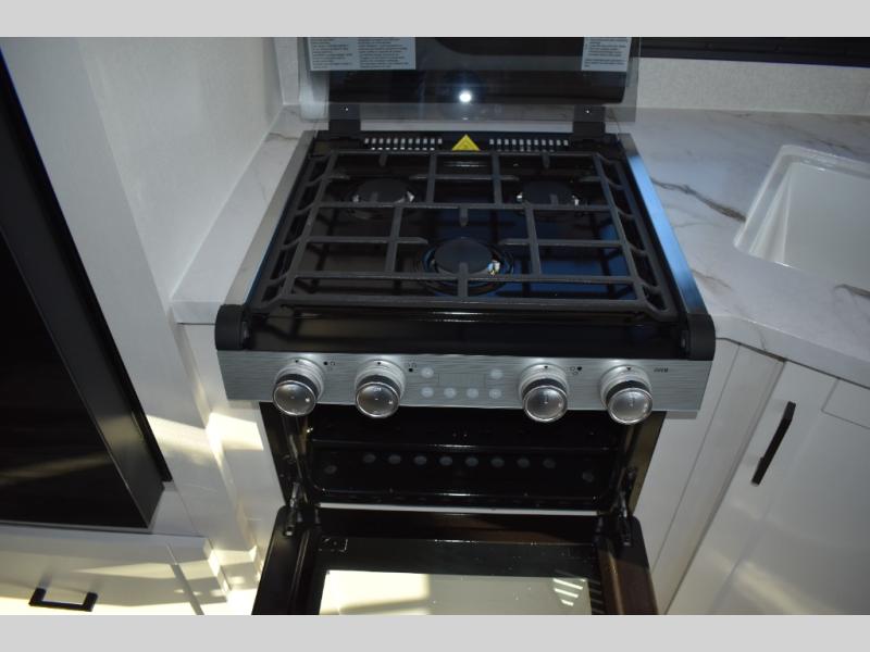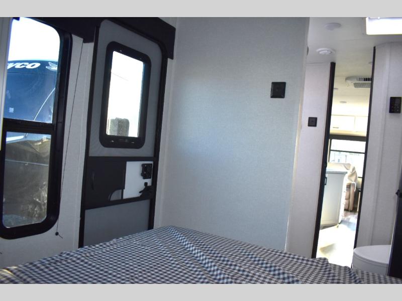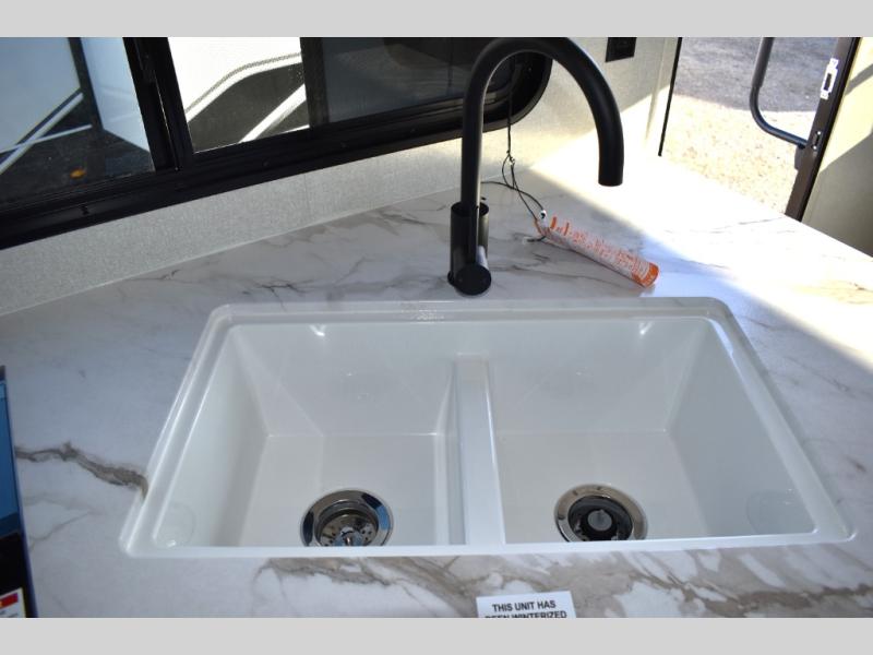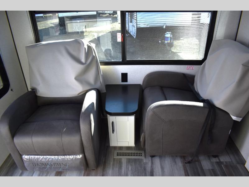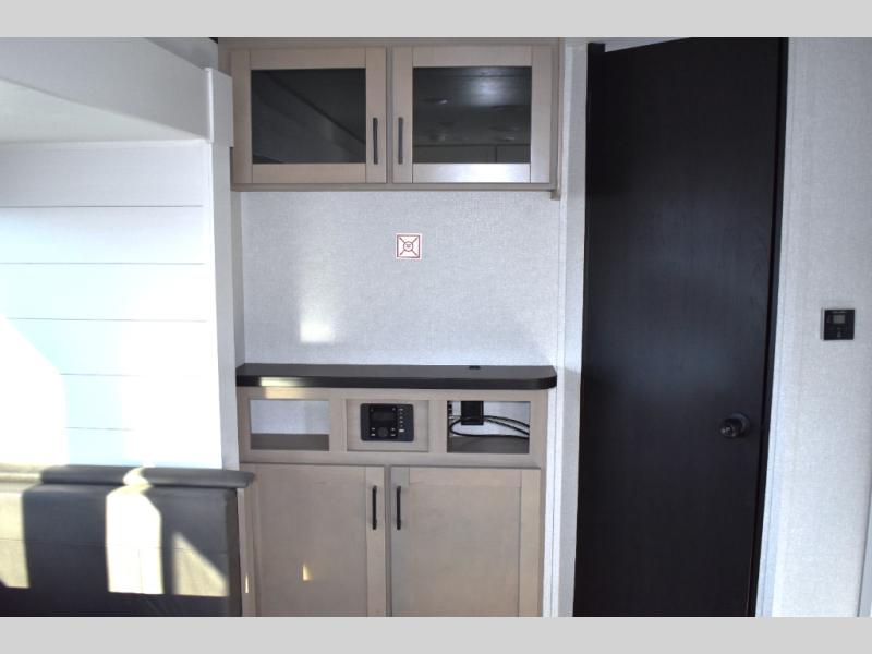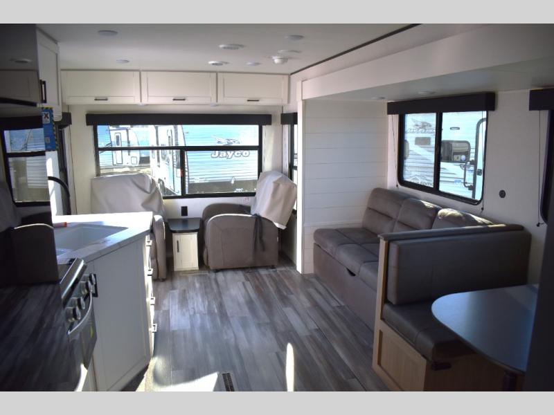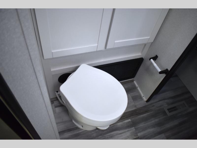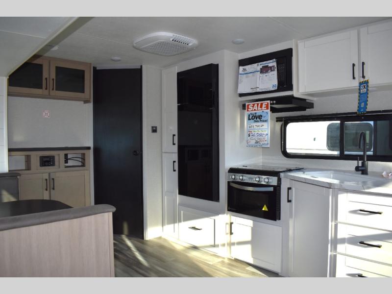 You can comfortably sleep up to six people in this trailer thanks to the RV queen bed in the front bedroom, plus the booth dinette and jack-knife sofa in the main living area! The chef of your crew will have a three burner cooktop and microwave oven to prepare meals, and everyone can store their favorite drinks in the 8 cu. ft. 12V refrigerator. The walk-through bath is spacious and includes a radius shower, toilet, a sink, and linen closet and is the full width of the unit. The outside storage will let you bring along camp chairs and games, fishing poles and more, plus the 18' power awning with LED lights will create a nice place to gather in the evenings!
