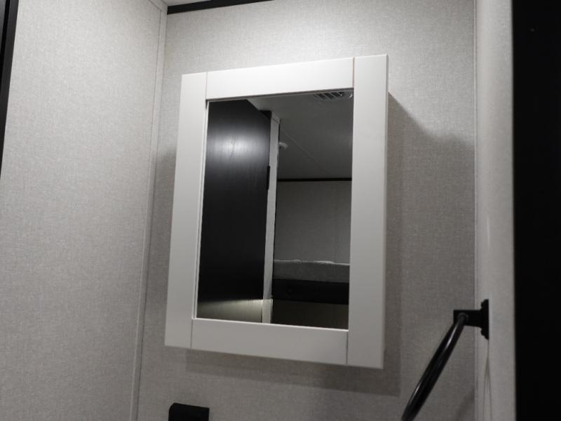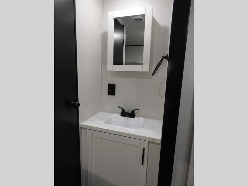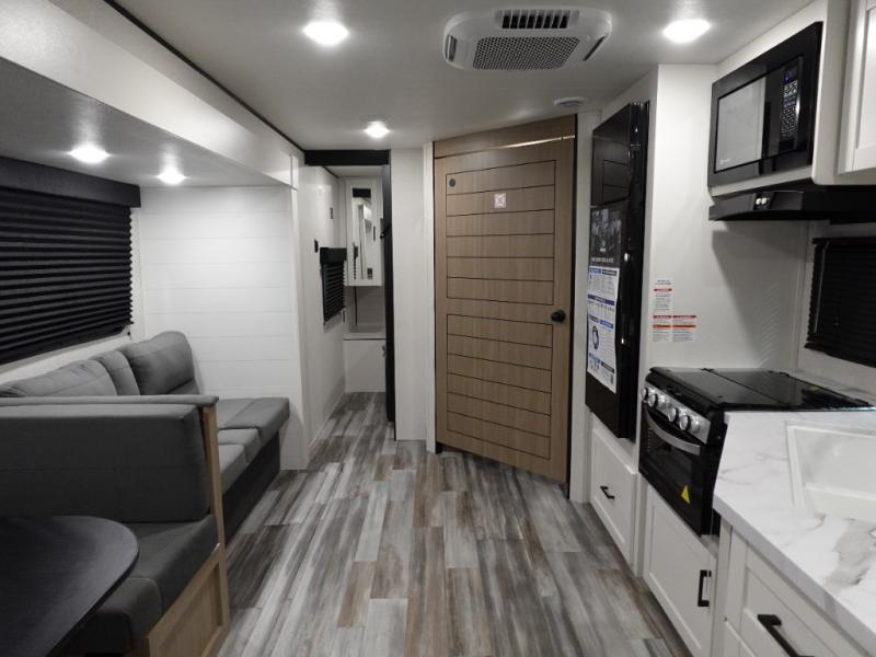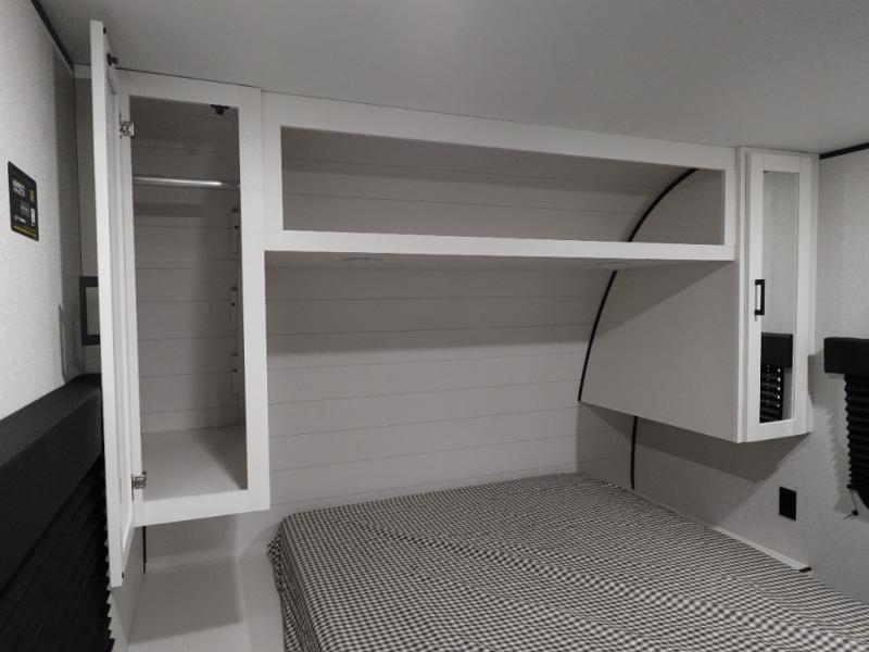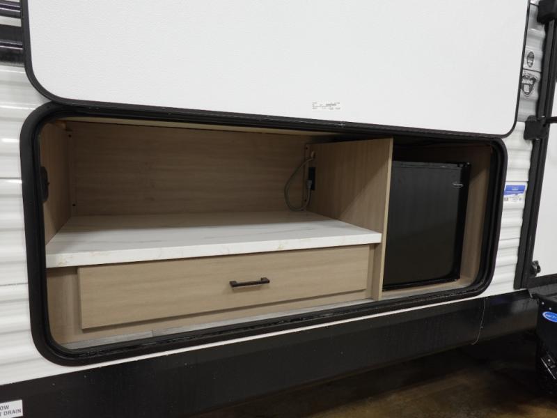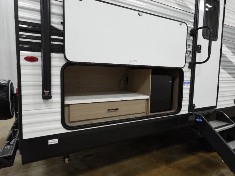 If space is what you're looking for in your next trailer, space is what you'll get this this Jay Flight SLX! The large slide houses the jack-knife sofa and booth dinette, and the added space here will provide everyone room to move about. The chef of your group will love cooking inside, or they can head outside to cook on the outdoor kitchen. Double-size bunks are sure to be a big hit with the little ones, and you'll love having your own space up front in the private bedroom. This unit includes ample storage space, including a hidden pantry with shelves, a bedroom closet plus dual bedside wardrobes, plus exterior storage for hiking or fishing gear!