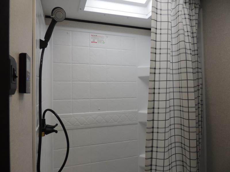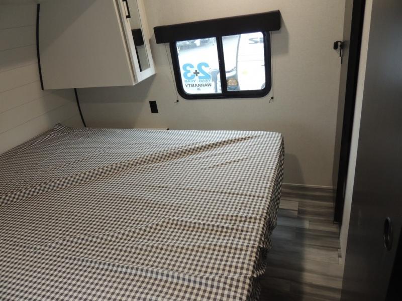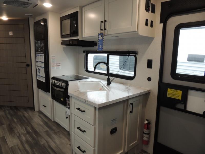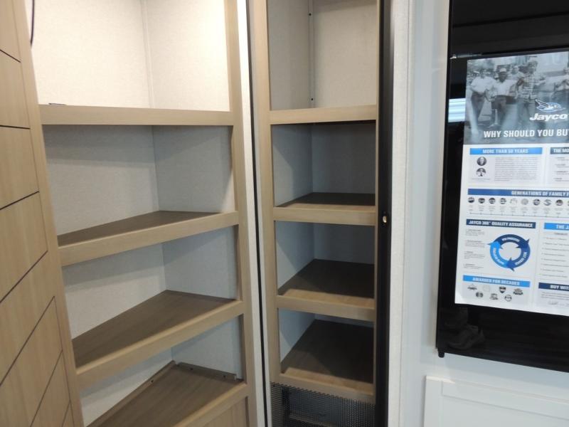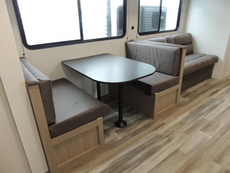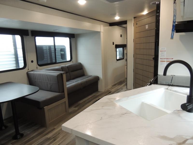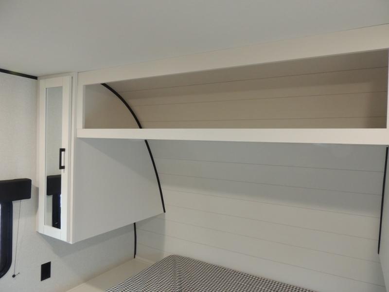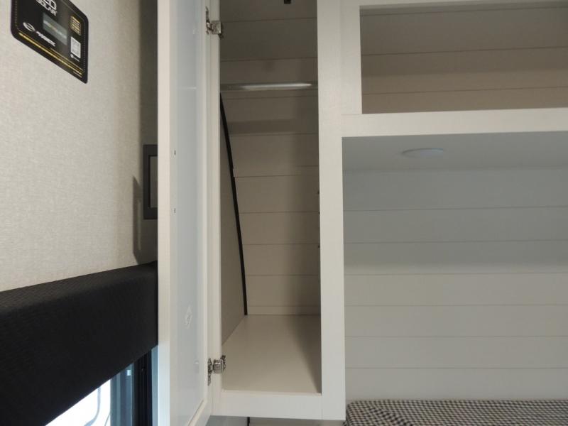 If space is what you're looking for in your next trailer, space is what you'll get this this Jay Flight SLX! The large slide houses the jack-knife sofa and booth dinette, and the added space here will provide everyone room to move about. The chef of your group will love cooking inside, or they can head outside to cook on the outdoor kitchen. Double-size bunks are sure to be a big hit with the little ones, and you'll love having your own space up front in the private bedroom. This unit includes ample storage space, including a hidden pantry with shelves, a bedroom closet plus dual bedside wardrobes, plus exterior storage for hiking or fishing gear!