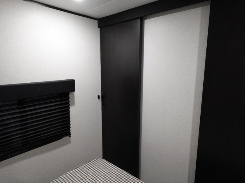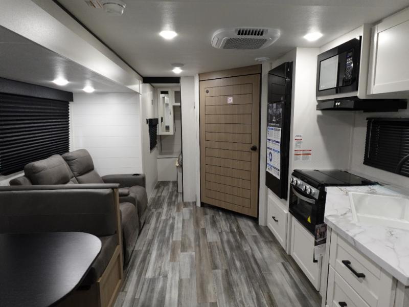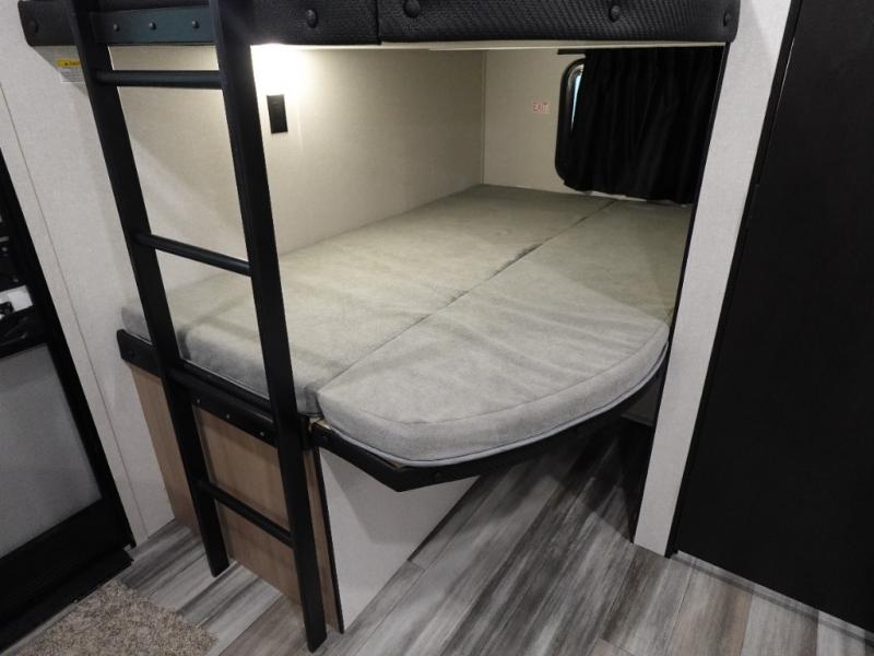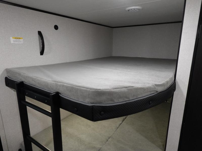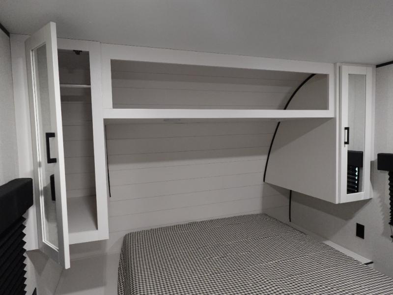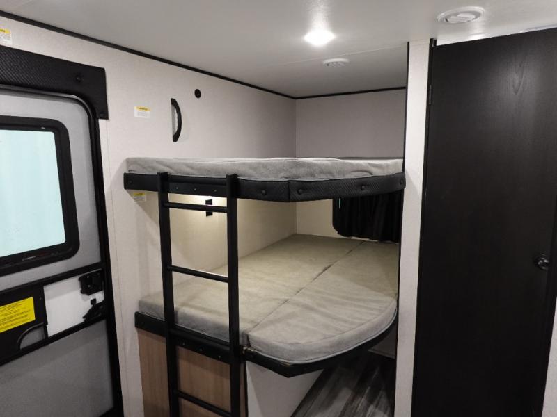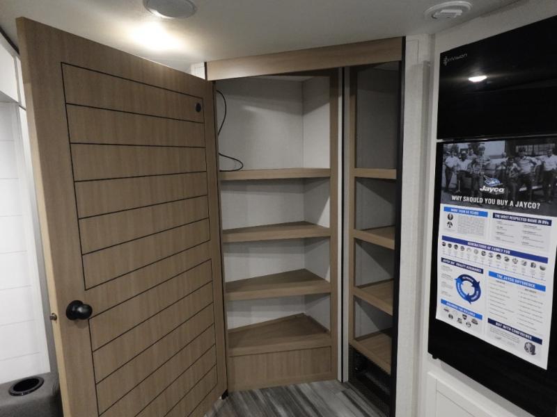 If space is what you're looking for in your next trailer, space is what you'll get this this Jay Flight SLX! The large slide houses the theater seats and booth dinette, and the added space here will provide everyone room to move about. The chef of your group will love cooking inside, or they can head outside to cook on the outdoor kitchen. Double-size bunks are sure to be a big hit with the little ones, and you'll love having your own space up front in the private bedroom. This unit includes ample storage space, including a hidden pantry with shelves, a bedroom closet plus dual bedside wardrobes, plus exterior storage for hiking or fishing gear!