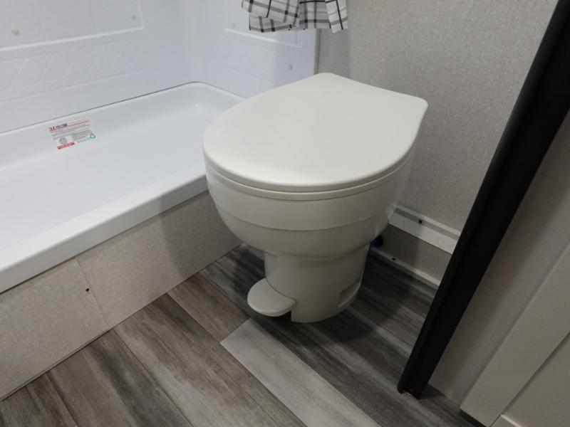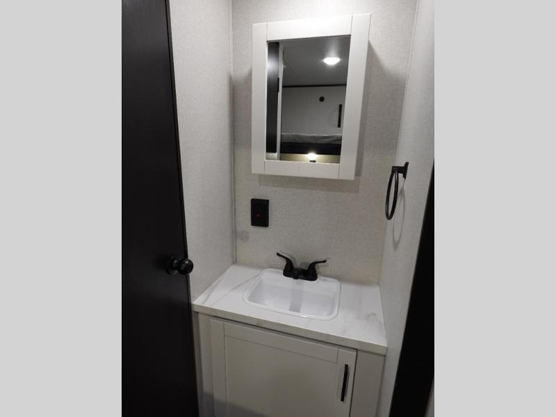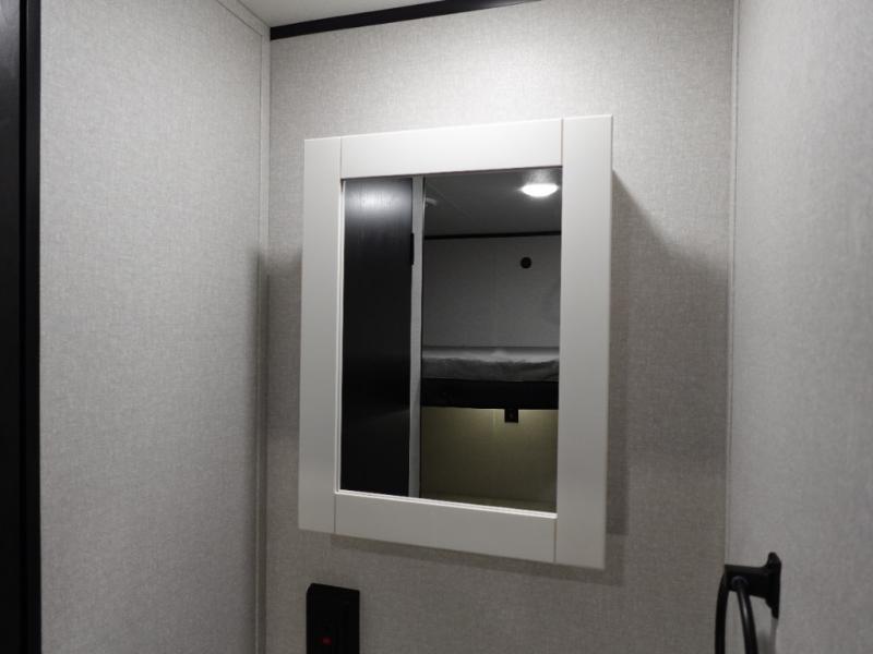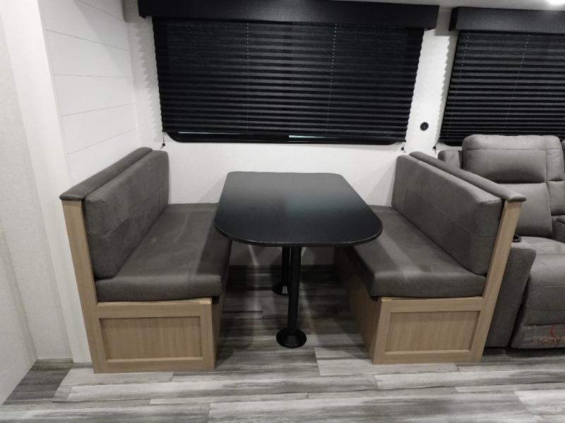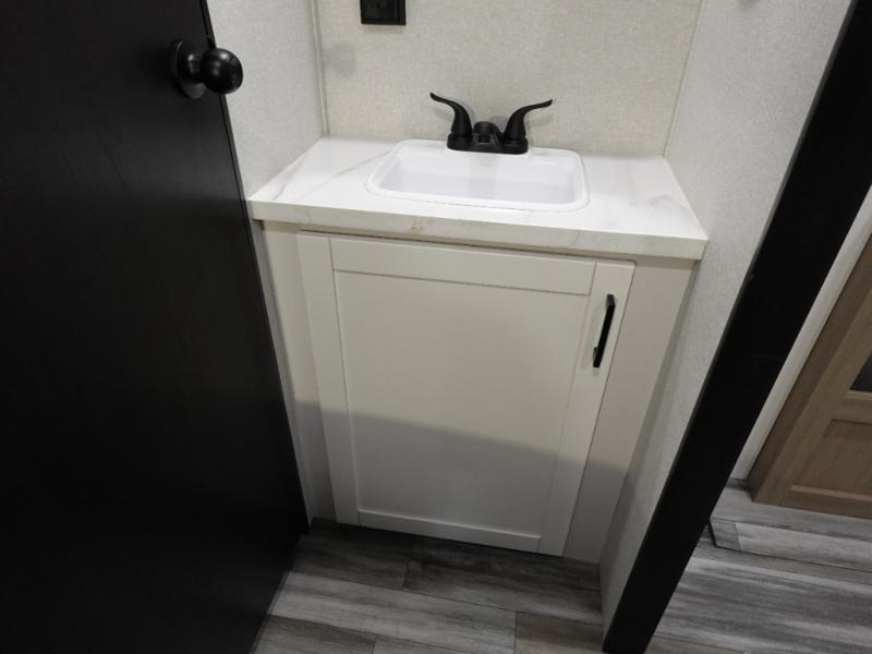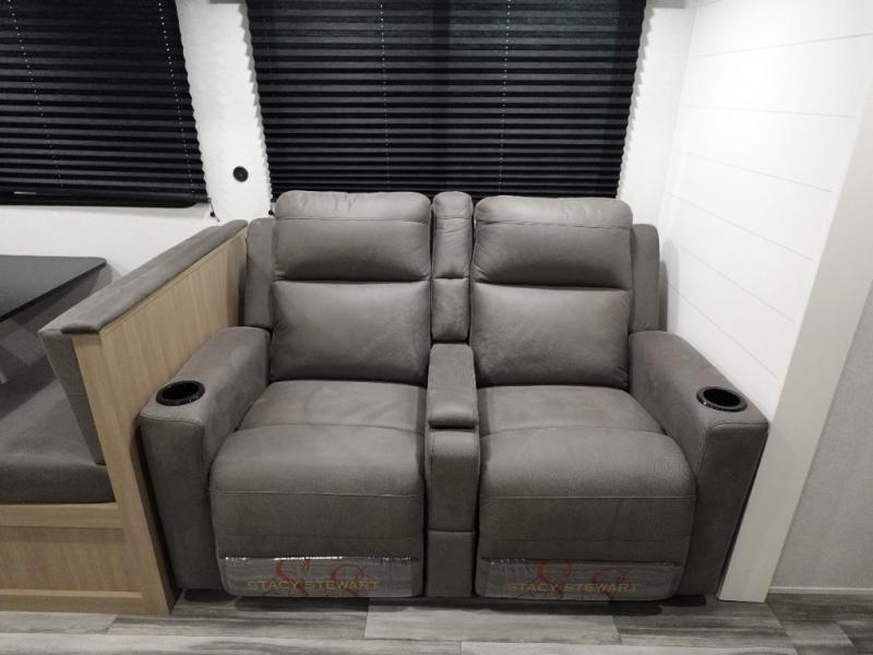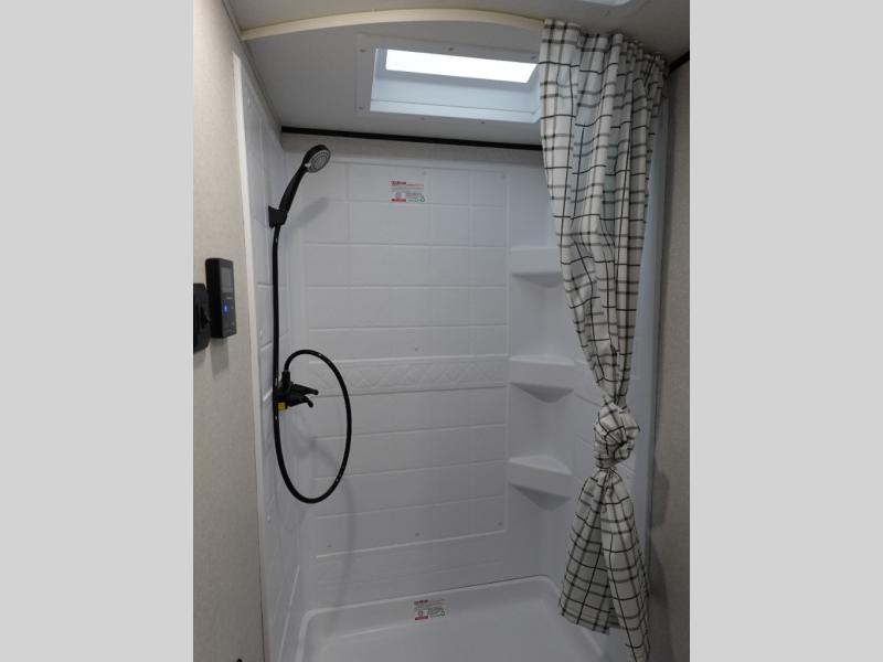 If space is what you're looking for in your next trailer, space is what you'll get this this Jay Flight SLX! The large slide houses the theater seats and booth dinette, and the added space here will provide everyone room to move about. The chef of your group will love cooking inside, or they can head outside to cook on the outdoor kitchen. Double-size bunks are sure to be a big hit with the little ones, and you'll love having your own space up front in the private bedroom. This unit includes ample storage space, including a hidden pantry with shelves, a bedroom closet plus dual bedside wardrobes, plus exterior storage for hiking or fishing gear!