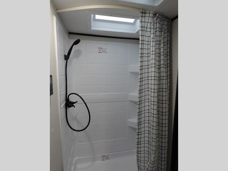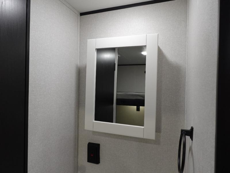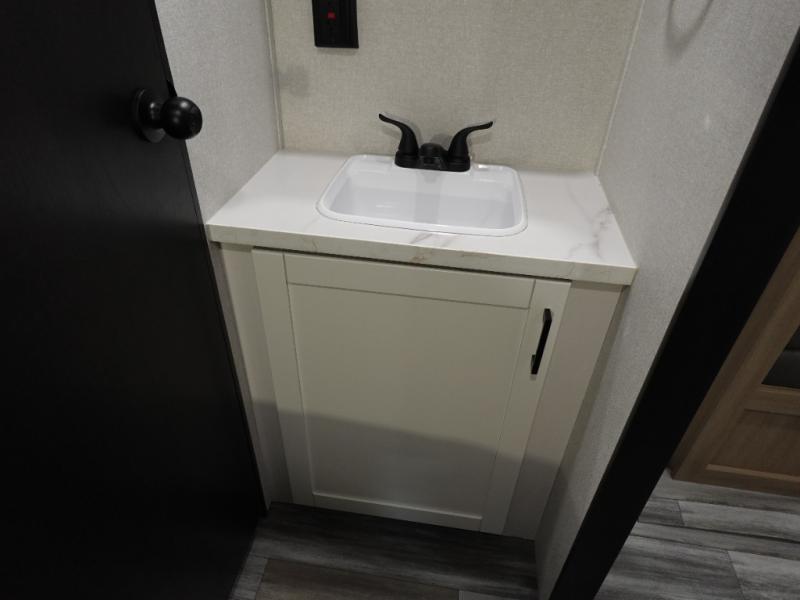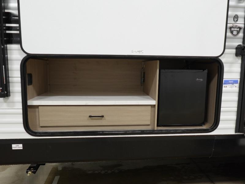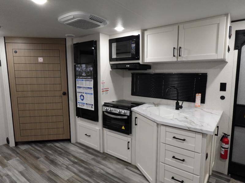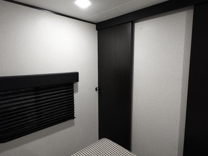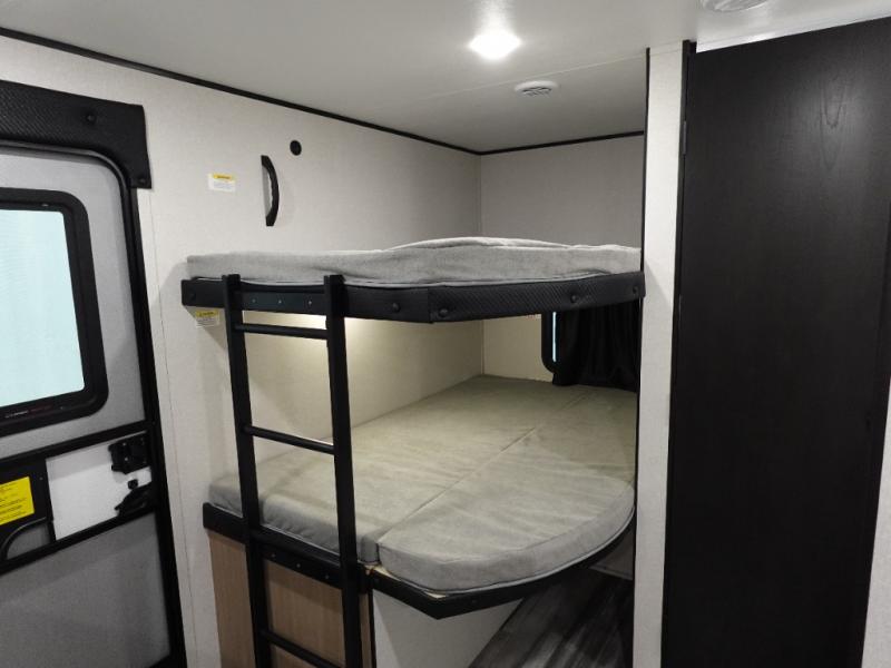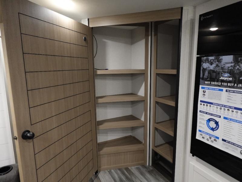 If space is what you're looking for in your next trailer, space is what you'll get this this Jay Flight SLX! The large slide houses the theater seats and booth dinette, and the added space here will provide everyone room to move about. The chef of your group will love cooking inside, or they can head outside to cook on the outdoor kitchen. Double-size bunks are sure to be a big hit with the little ones, and you'll love having your own space up front in the private bedroom. This unit includes ample storage space, including a hidden pantry with shelves, a bedroom closet plus dual bedside wardrobes, plus exterior storage for hiking or fishing gear!
