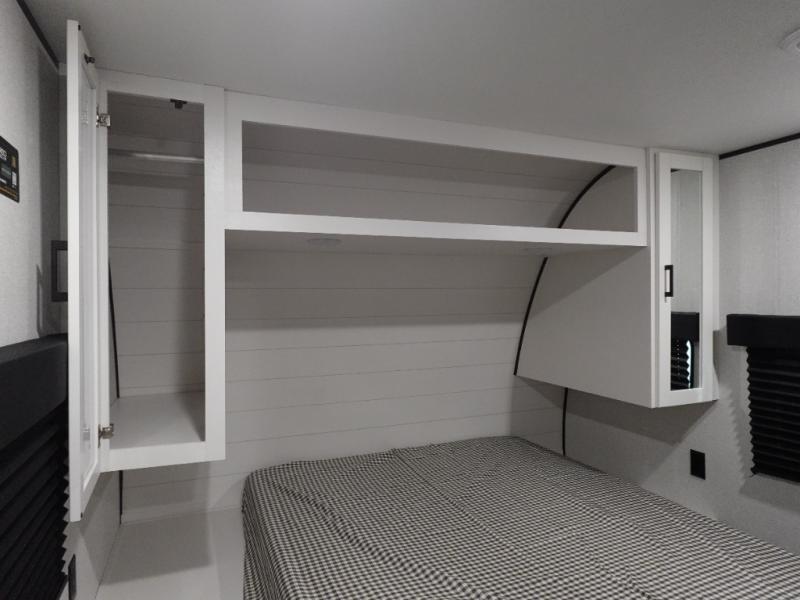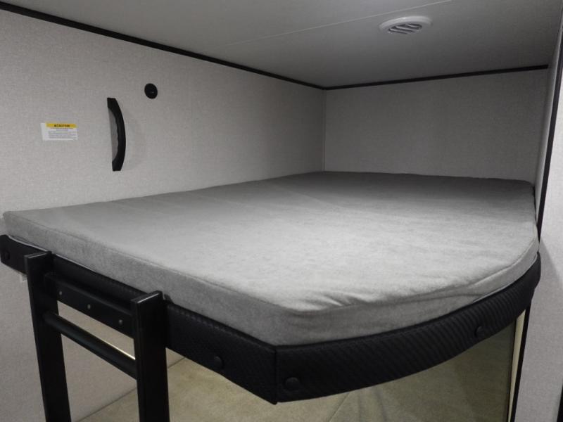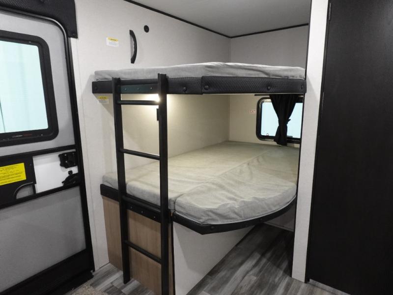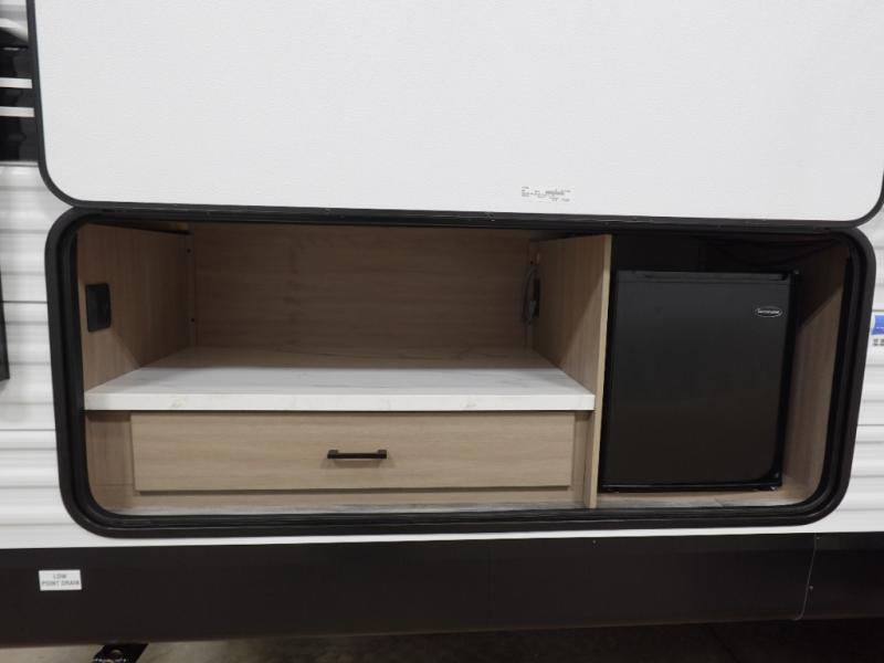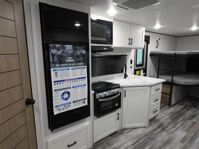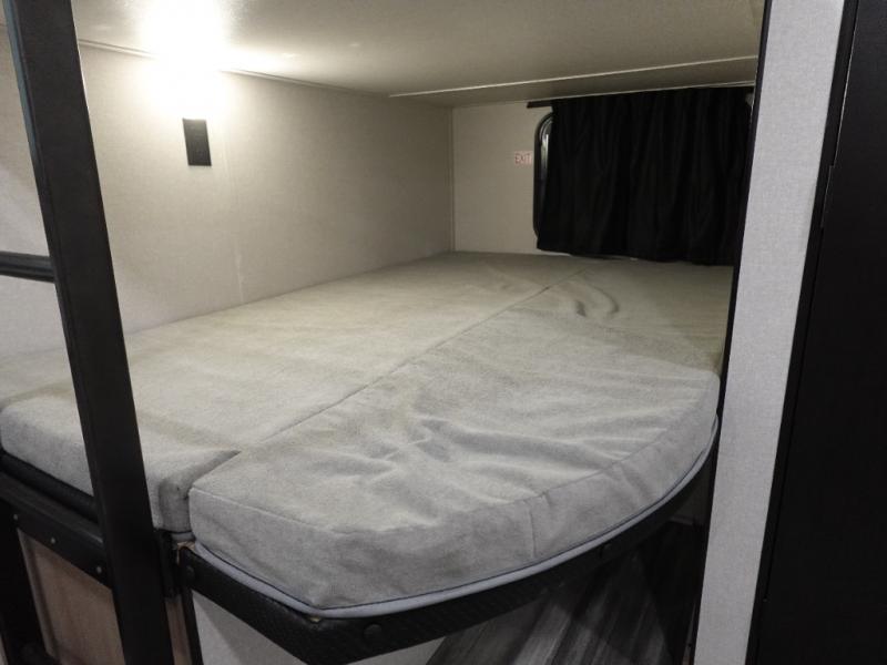 If space is what you're looking for in your next trailer, space is what you'll get this this Jay Flight SLX! The large slide houses the theater seats and booth dinette, and the added space here will provide everyone room to move about. The chef of your group will love cooking inside, or they can head outside to cook on the outdoor kitchen. Double-size bunks are sure to be a big hit with the little ones, and you'll love having your own space up front in the private bedroom. This unit includes ample storage space, including a hidden pantry with shelves, a bedroom closet plus dual bedside wardrobes, plus exterior storage for hiking or fishing gear!