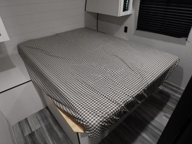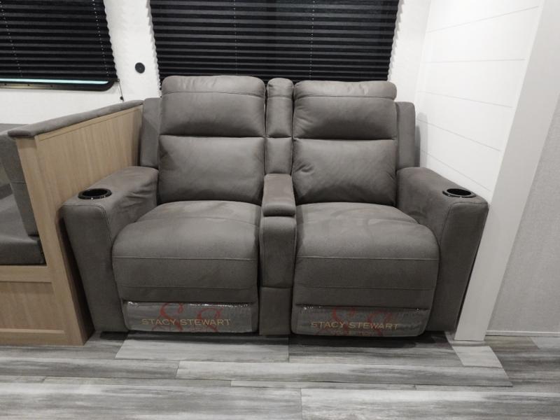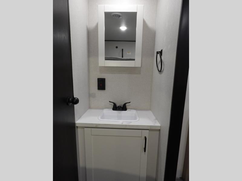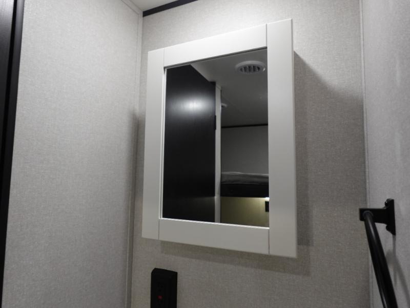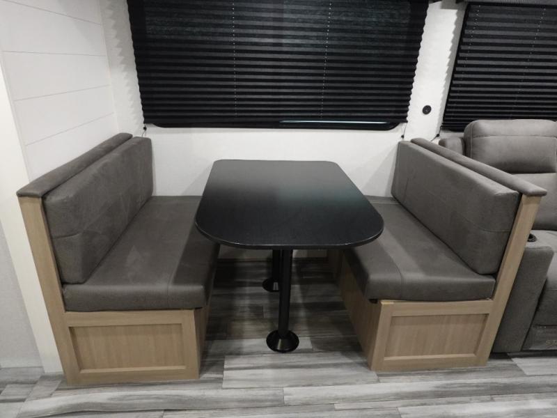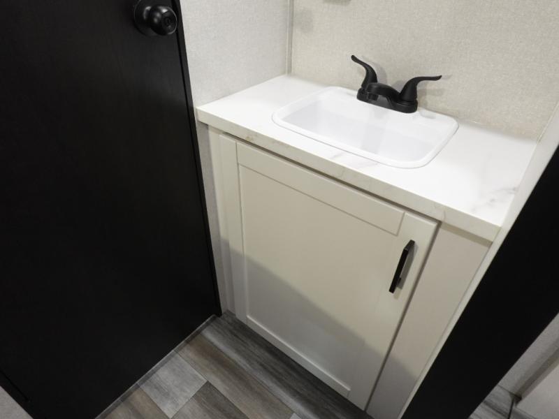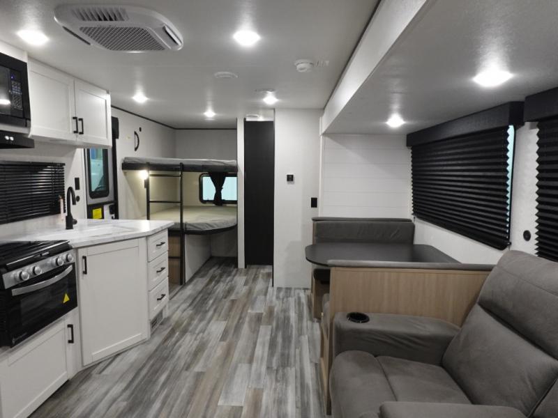 If space is what you're looking for in your next trailer, space is what you'll get this this Jay Flight SLX! The large slide houses the theater seats and booth dinette, and the added space here will provide everyone room to move about. The chef of your group will love cooking inside, or they can head outside to cook on the outdoor kitchen. Double-size bunks are sure to be a big hit with the little ones, and you'll love having your own space up front in the private bedroom. This unit includes ample storage space, including a hidden pantry with shelves, a bedroom closet plus dual bedside wardrobes, plus exterior storage for hiking or fishing gear!