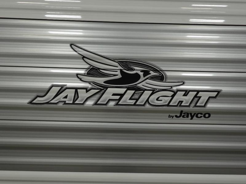 The Jayco Jay Flight SLX travel trailer is quite easy to own because it is lightweight for an easier towing experience. Built on a fully integrated A-frame with galvanized-steel, impact-resistant wheel wells, the Jay Flight SLX has quality at its very foundation. That quality continues on to the electric self-adjusting brakes, easy-lube hubs, Magnum Truss roof system, and LP quick connect. Some of what the mandatory Customer Value Package includes is backup camera prep, Keyed-Alike entry and baggage doors, marine grade exterior speakers, and an on-demand tankless water heater.
