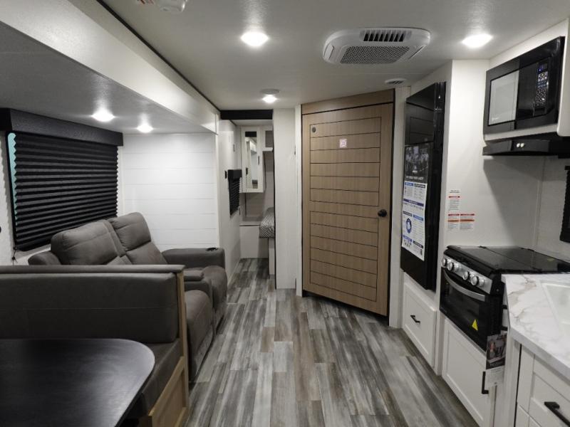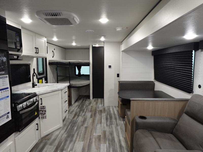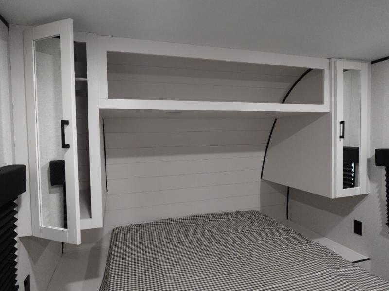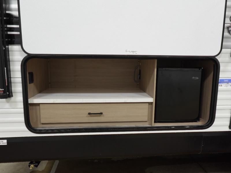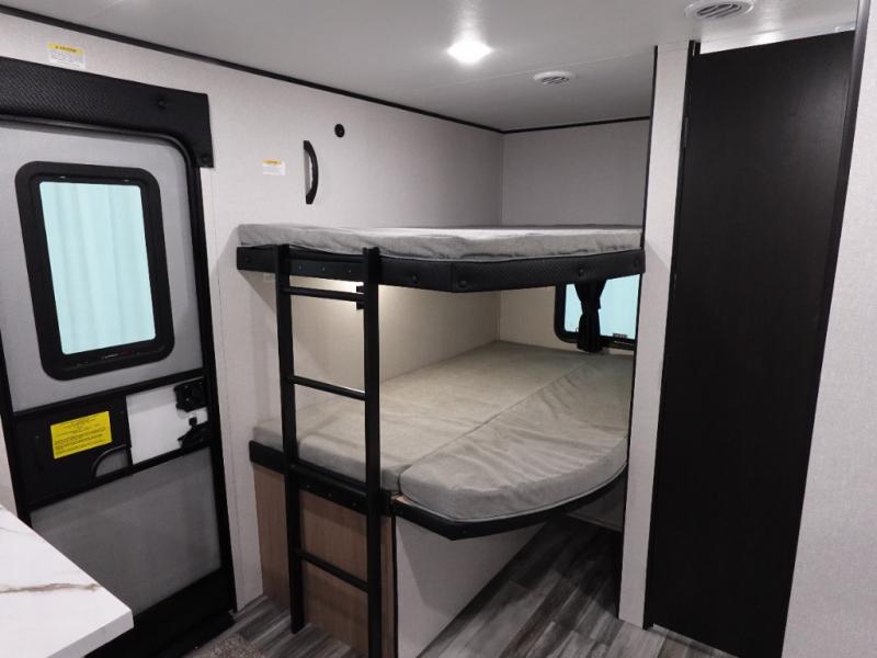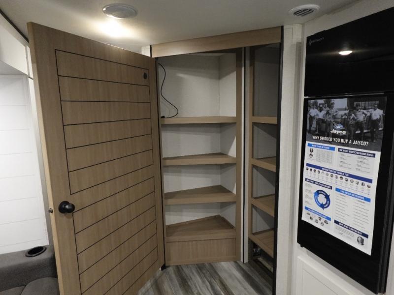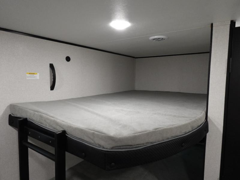 If space is what you're looking for in your next trailer, space is what you'll get this this Jay Flight SLX! The large slide houses the theater seats and booth dinette, and the added space here will provide everyone room to move about. The chef of your group will love cooking inside, or they can head outside to cook on the outdoor kitchen. Double-size bunks are sure to be a big hit with the little ones, and you'll love having your own space up front in the private bedroom. This unit includes ample storage space, including a hidden pantry with shelves, a bedroom closet plus dual bedside wardrobes, plus exterior storage for hiking or fishing gear!