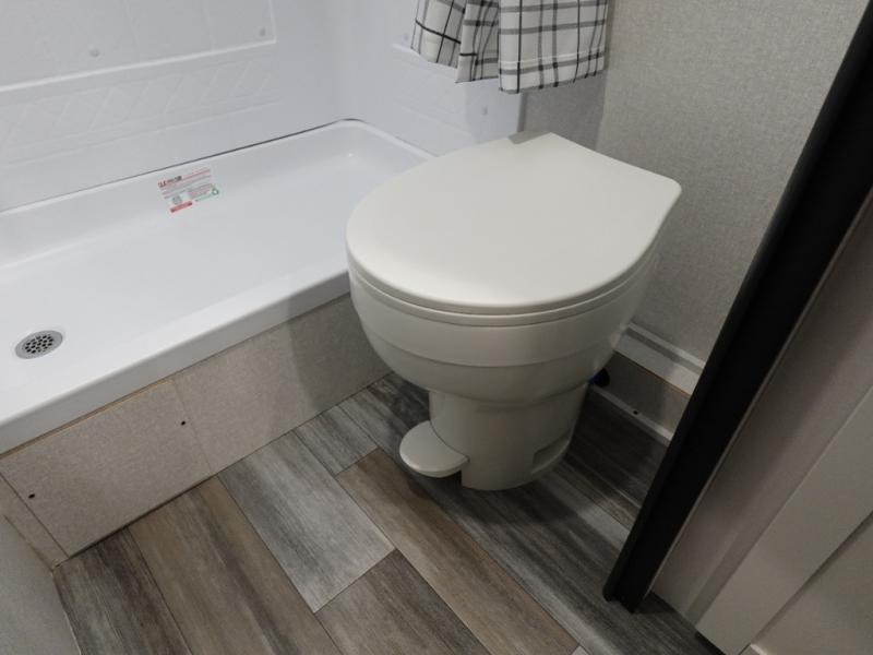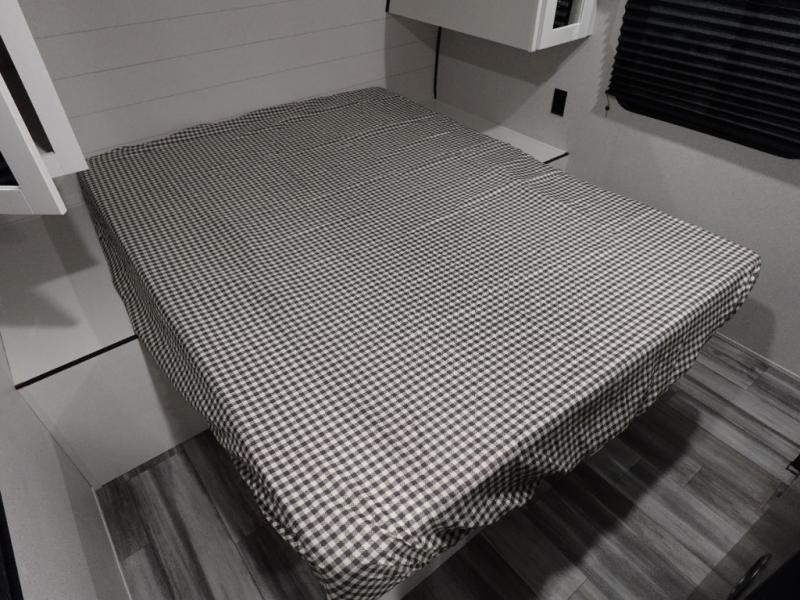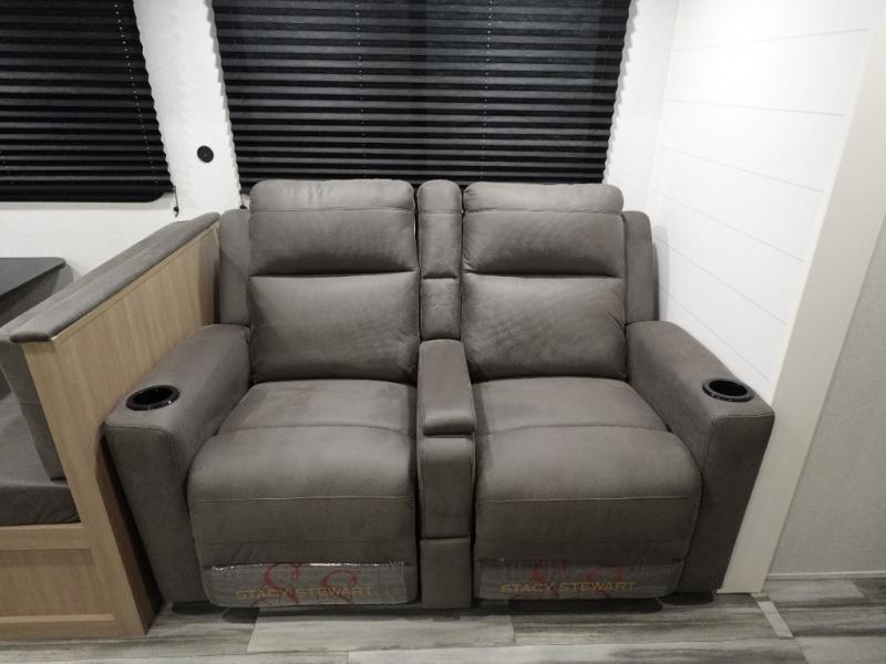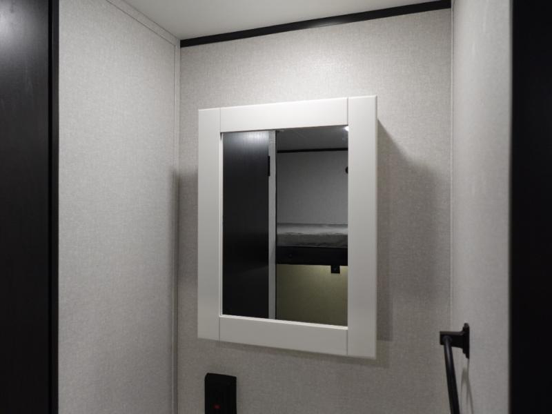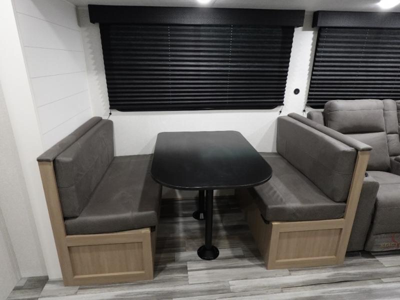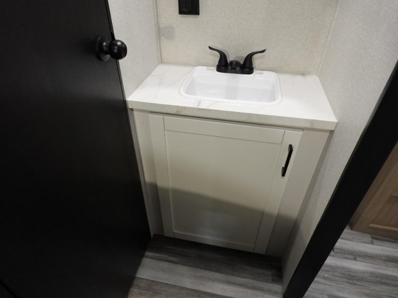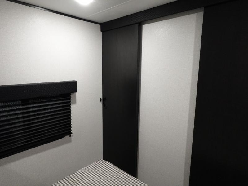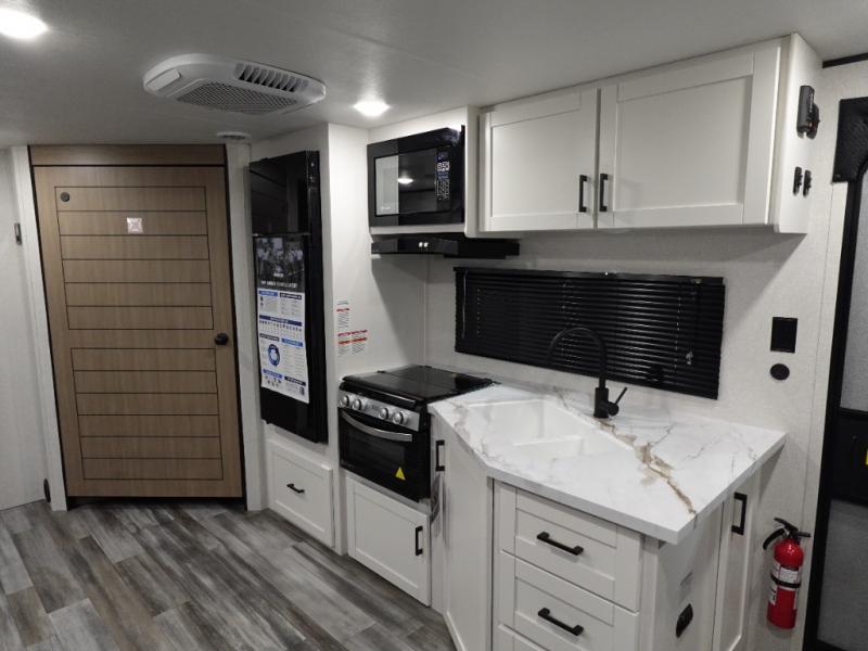 If space is what you're looking for in your next trailer, space is what you'll get this this Jay Flight SLX! The large slide houses the theater seats and booth dinette, and the added space here will provide everyone room to move about. The chef of your group will love cooking inside, or they can head outside to cook on the outdoor kitchen. Double-size bunks are sure to be a big hit with the little ones, and you'll love having your own space up front in the private bedroom. This unit includes ample storage space, including a hidden pantry with shelves, a bedroom closet plus dual bedside wardrobes, plus exterior storage for hiking or fishing gear!