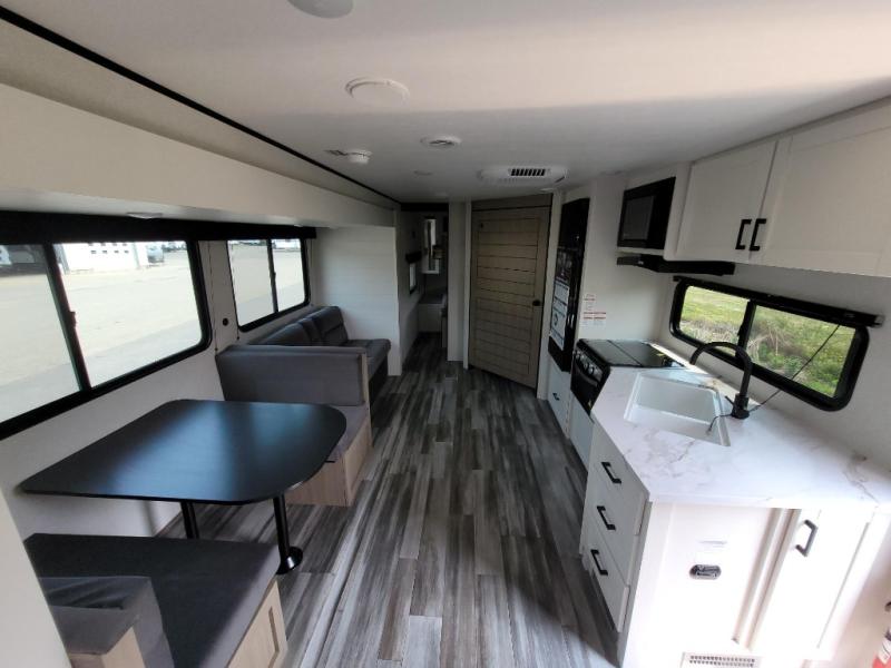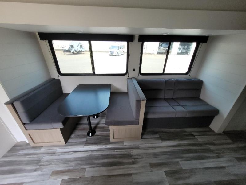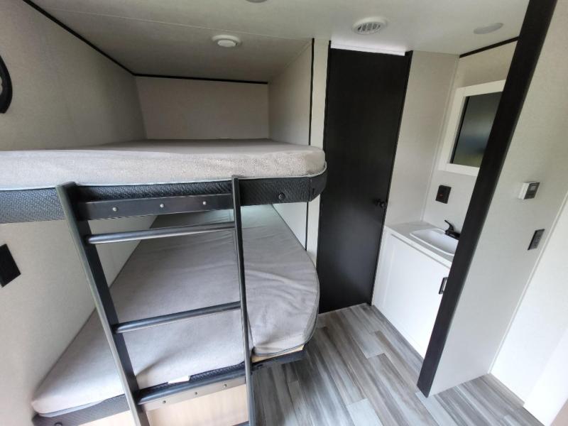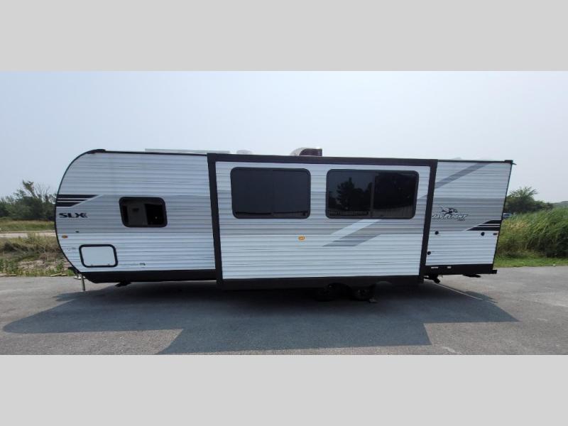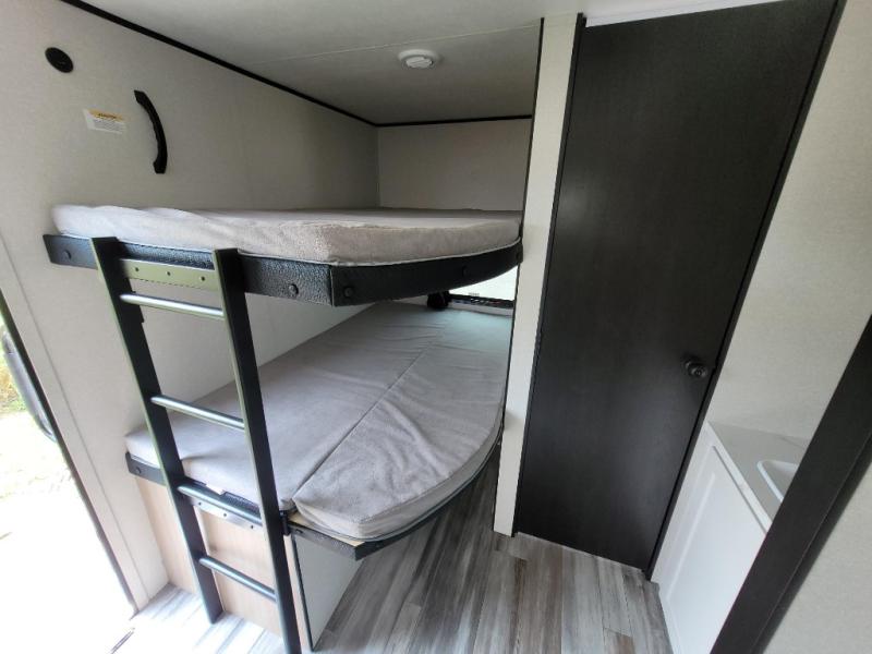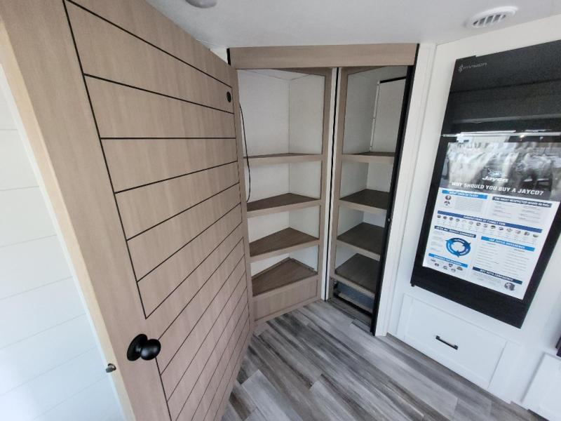 If space is what you're looking for in your next trailer, space is what you'll get this this Jay Flight SLX! The large slide houses the jack-knife sofa and booth dinette, and the added space here will provide everyone room to move about. The chef of your group will love cooking inside, or they can head outside to cook on the outdoor kitchen. Double-size bunks are sure to be a big hit with the little ones, and you'll love having your own space up front in the private bedroom. This unit includes ample storage space, including a hidden pantry with shelves, a bedroom closet plus dual bedside wardrobes, plus exterior storage for hiking or fishing gear!