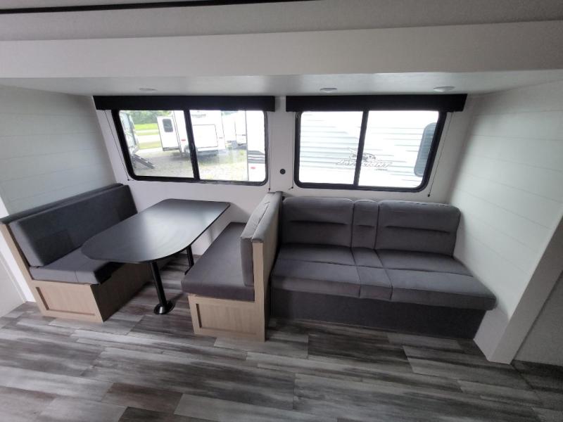If space is what you're looking for in your next trailer, space is what you'll get this this Jay Flight SLX! The large slide houses the jack-knife sofa and booth dinette, and the added space here will provide everyone room to move about. The chef of your group will love cooking inside, or they can head outside to cook on the outdoor kitchen. Double-size bunks are sure to be a big hit with the little ones, and you'll love having your own space up front in the private bedroom. This unit includes ample storage space, including a hidden pantry with shelves, a bedroom closet plus dual bedside wardrobes, plus exterior storage for hiking or fishing gear!