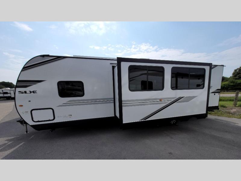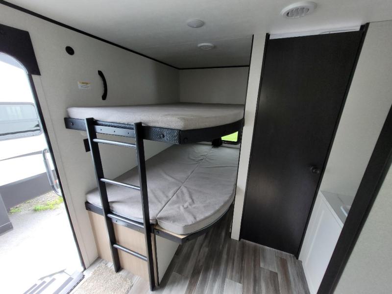 If space is what you're looking for in your next trailer, space is what you'll get this this Jay Flight SLX! The large slide houses the jack-knife sofa and booth dinette, and the added space here will provide everyone room to move about. The chef of your group will love cooking inside, or they can head outside to cook on the outdoor kitchen. Double-size bunks are sure to be a big hit with the little ones, and you'll love having your own space up front in the private bedroom. This unit includes ample storage space, including a hidden pantry with shelves, a bedroom closet plus dual bedside wardrobes, plus exterior storage for hiking or fishing gear!
