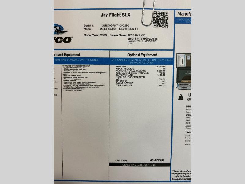 The Jayco Jay Flight SLX travel trailer is quite easy to own because it is lightweight for an easier towing experience. Built on a fully integrated A-frame with galvanized-steel, impact-resistant wheel wells, the Jay Flight SLX has quality at its very foundation. That quality continues on to the electric self-adjusting brakes, easy-lube hubs, Magnum Truss roof system, and LP quick connect. Some of what the mandatory Customer Value Package includes is backup camera prep, Keyed-Alike entry and baggage doors, and an on-demand tankless water heater.