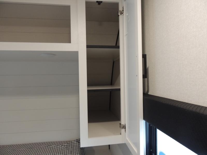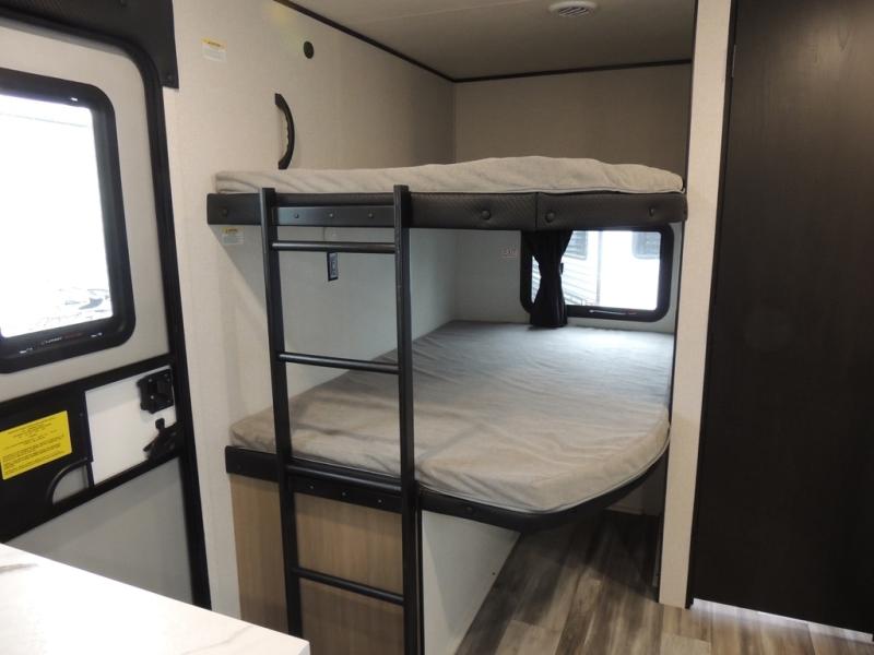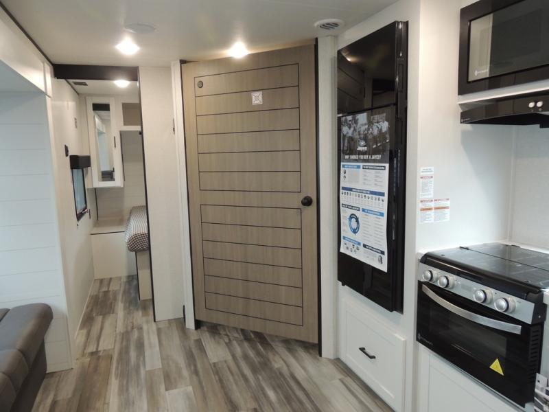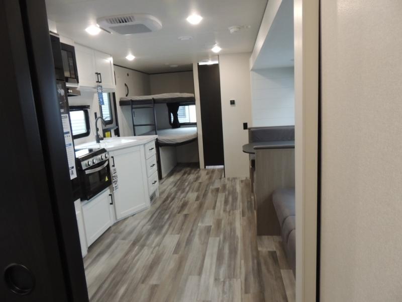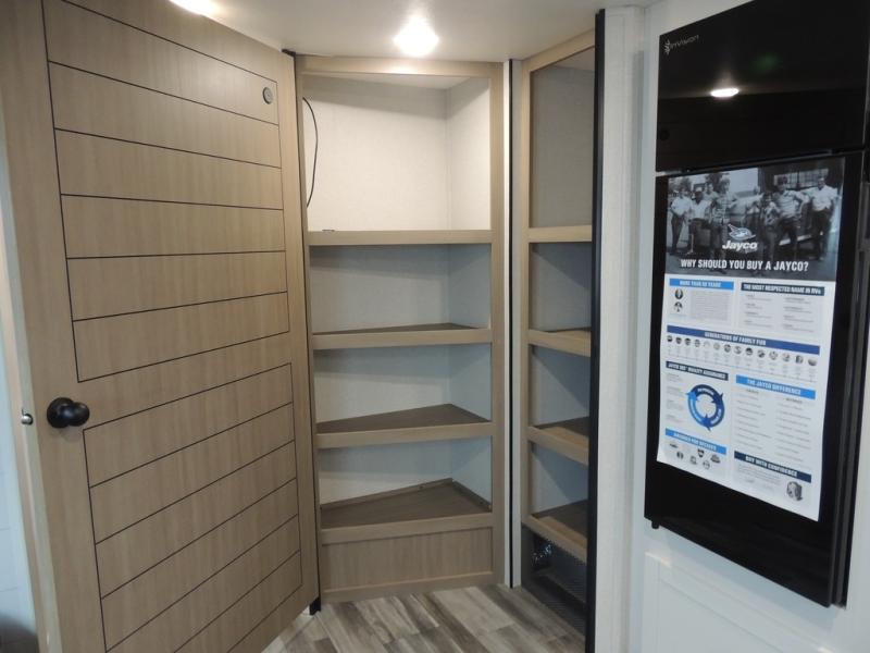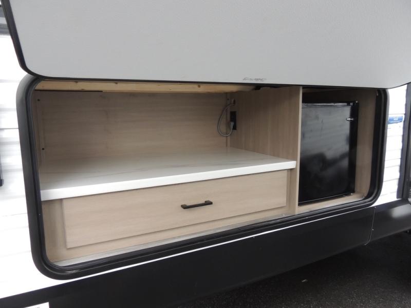 If space is what you're looking for in your next trailer, space is what you'll get this this Jay Flight SLX! The large slide houses the jack-knife sofa and booth dinette, and the added space here will provide everyone room to move about. The chef of your group will love cooking inside, or they can head outside to cook on the outdoor kitchen. Double-size bunks are sure to be a big hit with the little ones, and you'll love having your own space up front in the private bedroom. This unit includes ample storage space, including a hidden pantry with shelves, a bedroom closet plus dual bedside wardrobes, plus exterior storage for hiking or fishing gear!