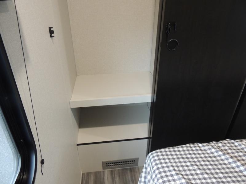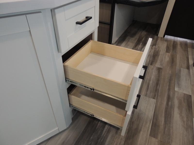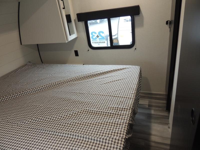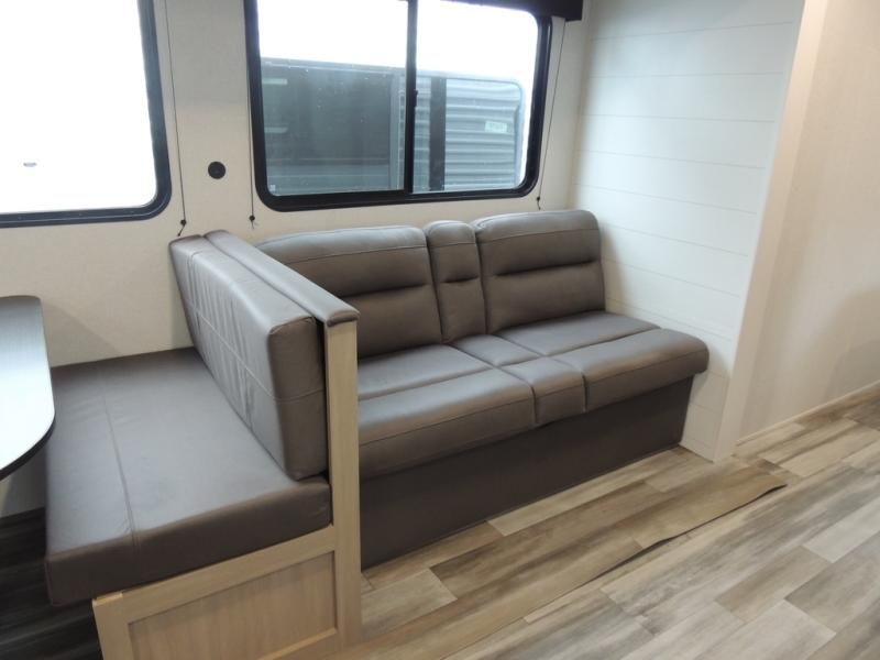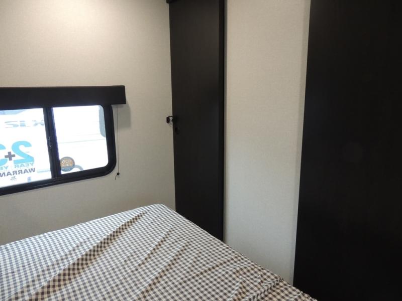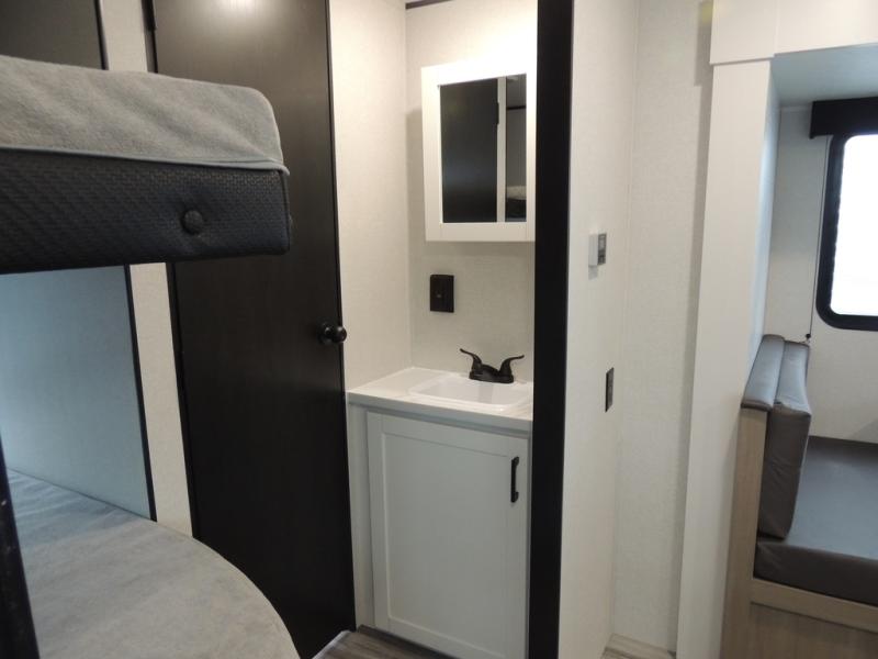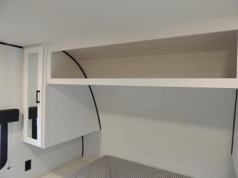 If space is what you're looking for in your next trailer, space is what you'll get this this Jay Flight SLX! The large slide houses the jack-knife sofa and booth dinette, and the added space here will provide everyone room to move about. The chef of your group will love cooking inside, or they can head outside to cook on the outdoor kitchen. Double-size bunks are sure to be a big hit with the little ones, and you'll love having your own space up front in the private bedroom. This unit includes ample storage space, including a hidden pantry with shelves, a bedroom closet plus dual bedside wardrobes, plus exterior storage for hiking or fishing gear!
