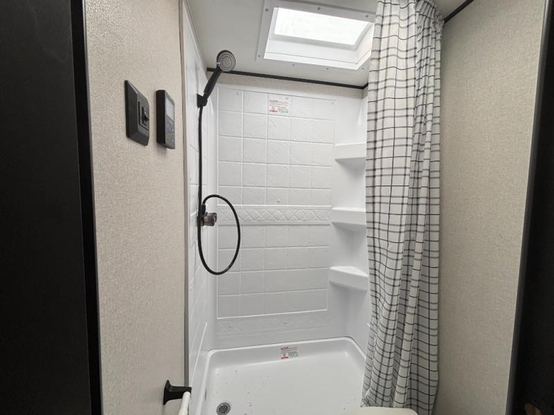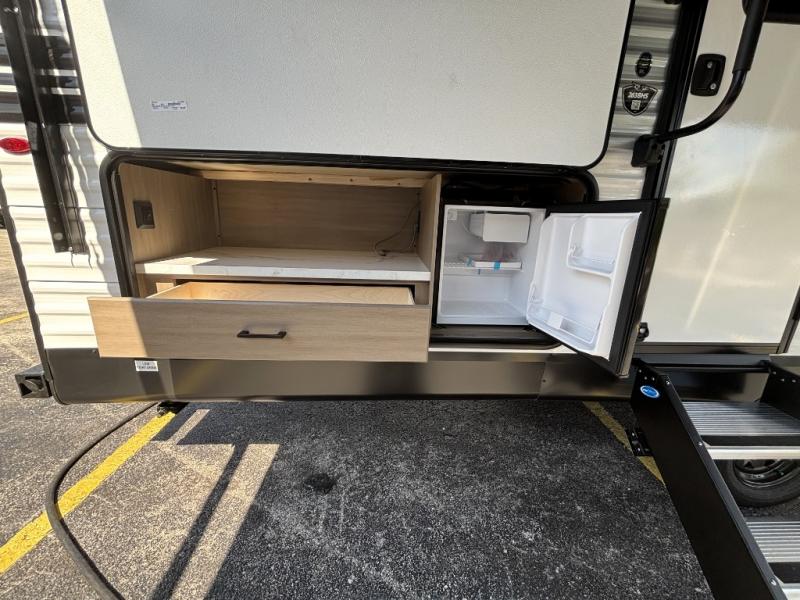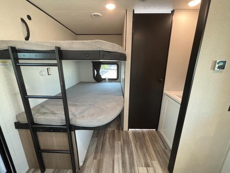 If space is what you're looking for in your next trailer, space is what you'll get this this Jay Flight SLX! The large slide houses the jack-knife sofa and booth dinette, and the added space here will provide everyone room to move about. The chef of your group will love cooking inside, or they can head outside to cook on the outdoor kitchen. Double-size bunks are sure to be a big hit with the little ones, and you'll love having your own space up front in the private bedroom. This unit includes ample storage space, including a hidden pantry with shelves, a bedroom closet plus dual bedside wardrobes, plus exterior storage for hiking or fishing gear!