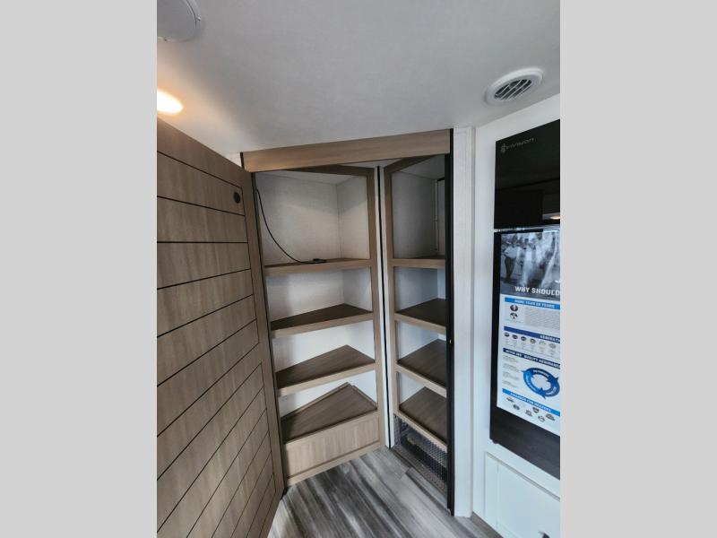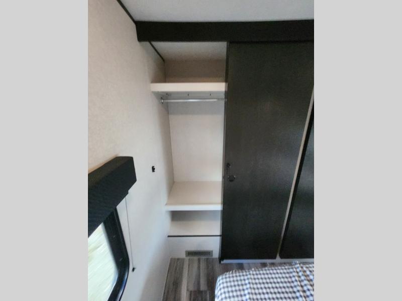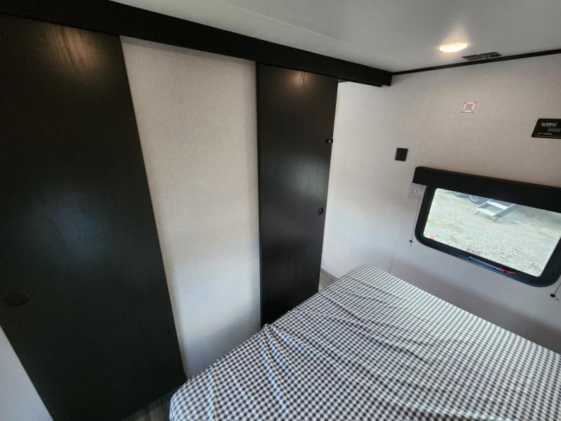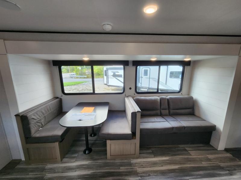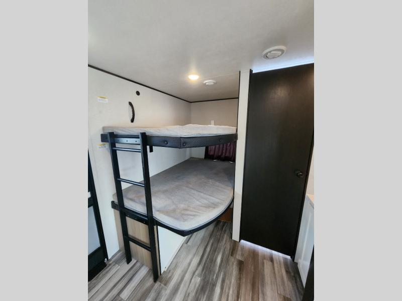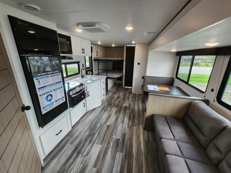 If space is what you're looking for in your next trailer, space is what you'll get this this Jay Flight SLX! The large slide houses the jack-knife sofa and booth dinette, and the added space here will provide everyone room to move about. The chef of your group will love cooking inside, or they can head outside to cook on the outdoor kitchen. Double-size bunks are sure to be a big hit with the little ones, and you'll love having your own space up front in the private bedroom. This unit includes ample storage space, including a hidden pantry with shelves, a bedroom closet plus dual bedside wardrobes, plus exterior storage for hiking or fishing gear!