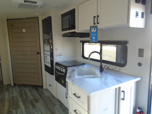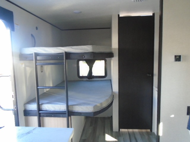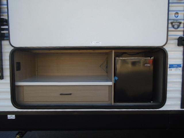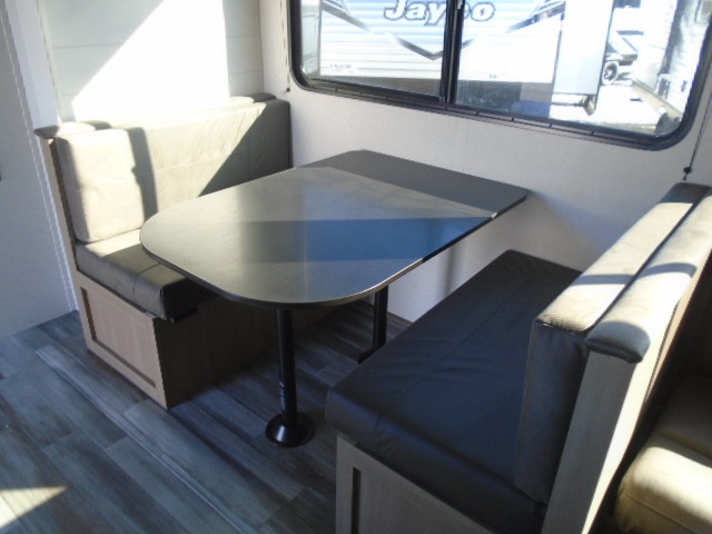 If space is what you're looking for in your next trailer, space is what you'll get this this Jay Flight SLX! The large slide houses the jack-knife sofa and booth dinette, and the added space here will provide everyone room to move about. The chef of your group will love cooking inside, or they can head outside to cook on the outdoor kitchen. Double-size bunks are sure to be a big hit with the little ones, and you'll love having your own space up front in the private bedroom. This unit includes ample storage space, including a hidden pantry with shelves, a bedroom closet plus dual bedside wardrobes, plus exterior storage for hiking or fishing gear!