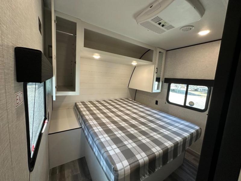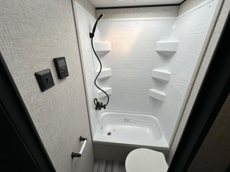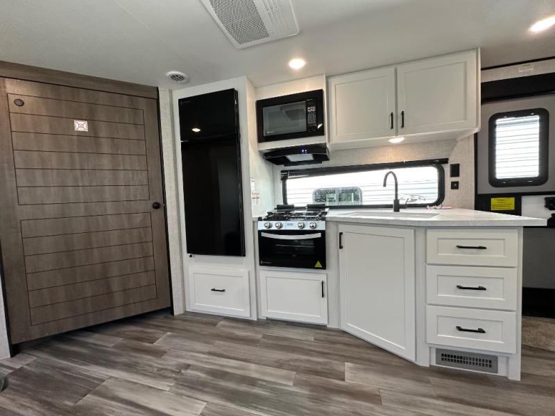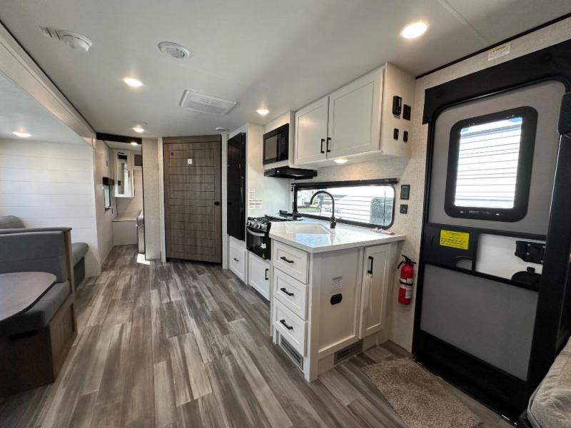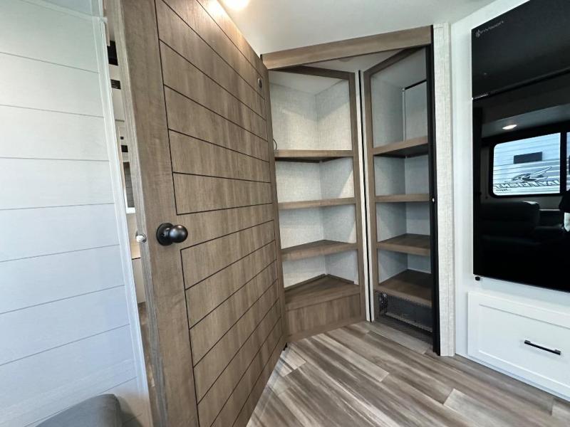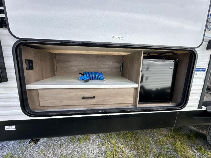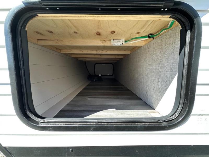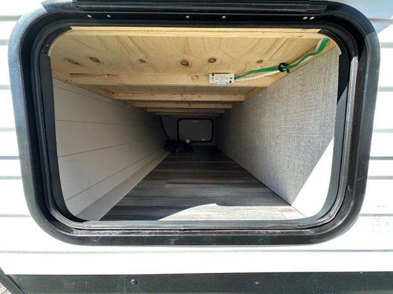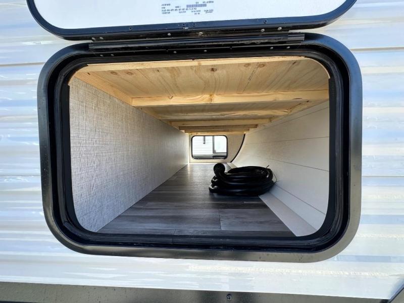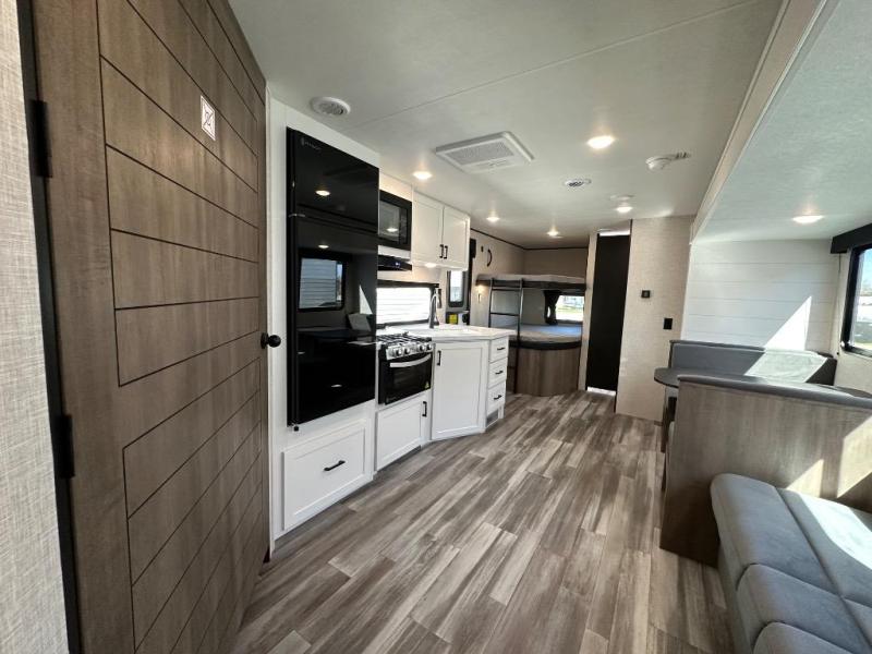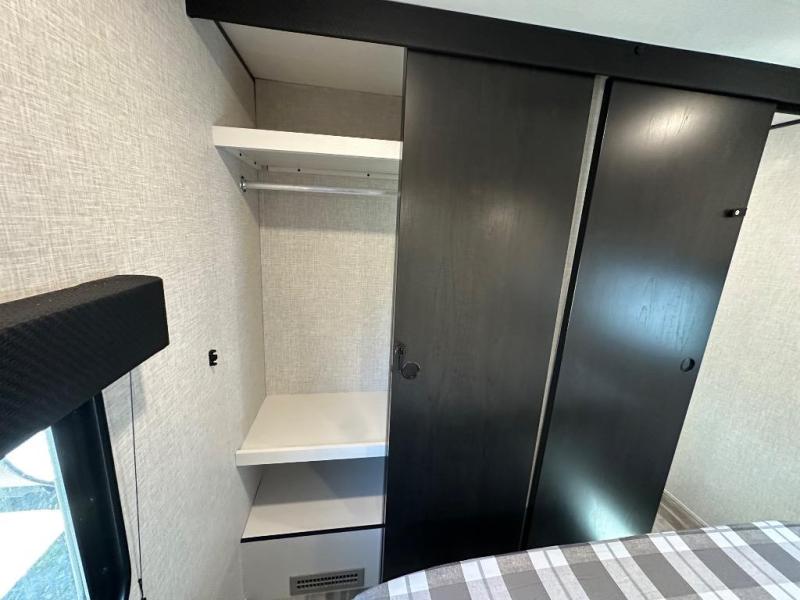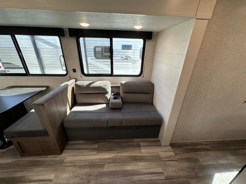 If space is what you're looking for in your next trailer, space is what you'll get this this Jay Flight SLX! The large slide houses the jack-knife sofa and booth dinette, and the added space here will provide everyone room to move about. The chef of your group will love cooking inside, or they can head outside to cook on the outdoor kitchen. Double-size bunks are sure to be a big hit with the little ones, and you'll love having your own space up front in the private bedroom. This unit includes ample storage space, including a hidden pantry with shelves, a bedroom closet plus dual bedside wardrobes, plus exterior storage for hiking or fishing gear!