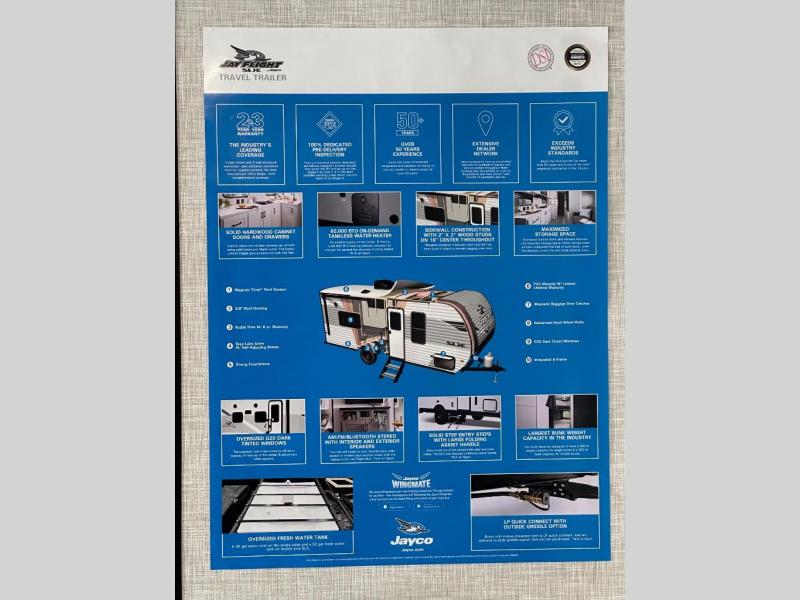 The Jayco Jay Flight SLX travel trailer is quite easy to own because it is lightweight for an easier towing experience. Built on a fully integrated A-frame with galvanized-steel, impact-resistant wheel wells, the Jay Flight SLX has quality at its very foundation. That quality continues on to the electric self-adjusting brakes, easy-lube hubs, Magnum Truss roof system, and LP quick connect. Some of what the mandatory Customer Value Package includes is backup camera prep, Keyed-Alike entry and baggage doors, and an on-demand tankless water heater.