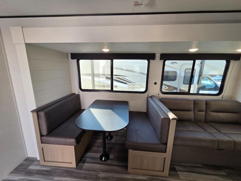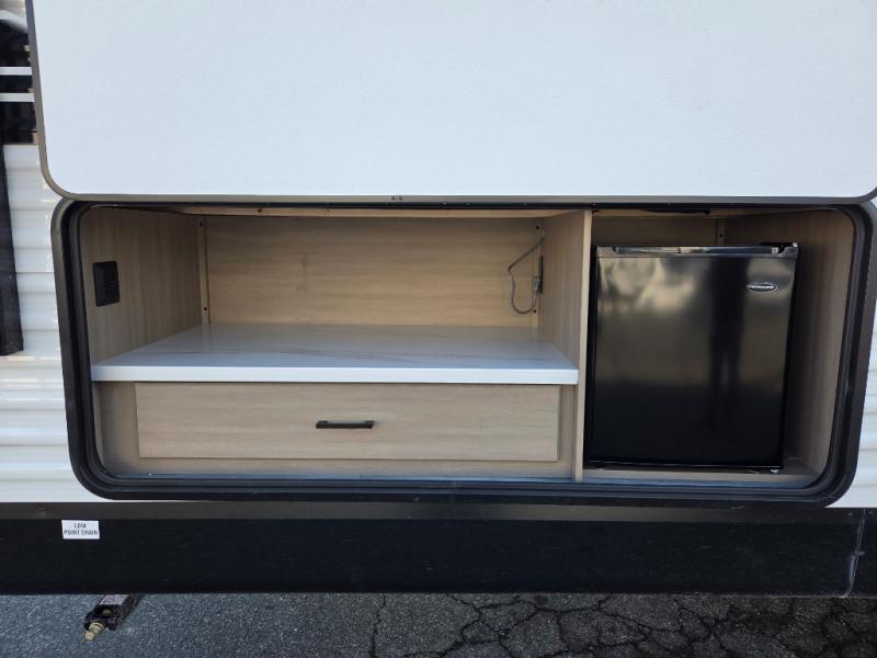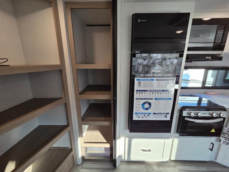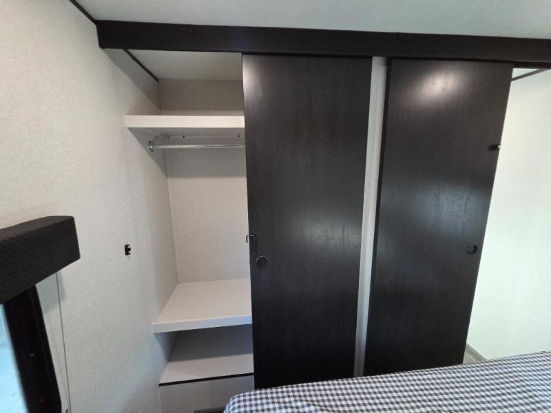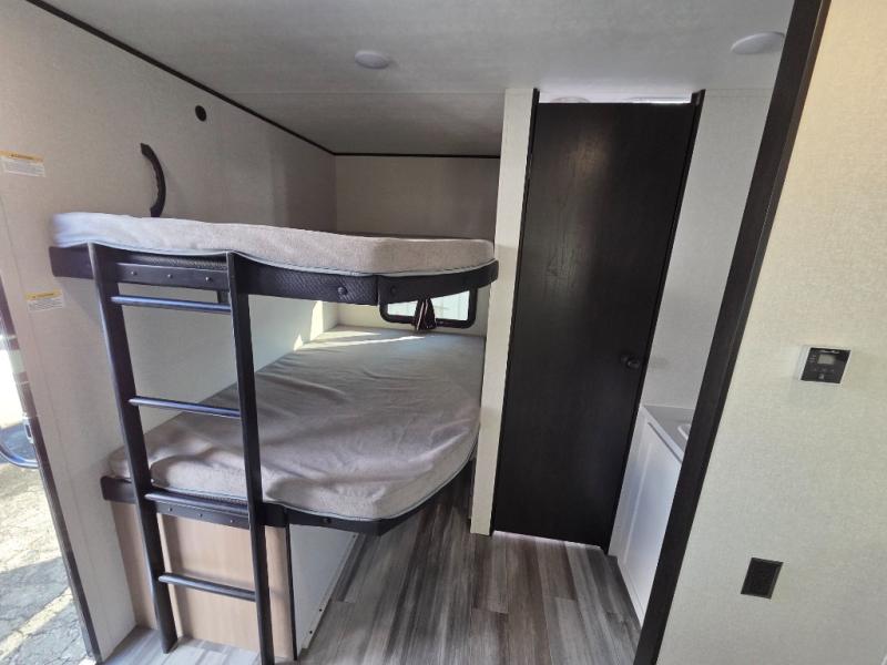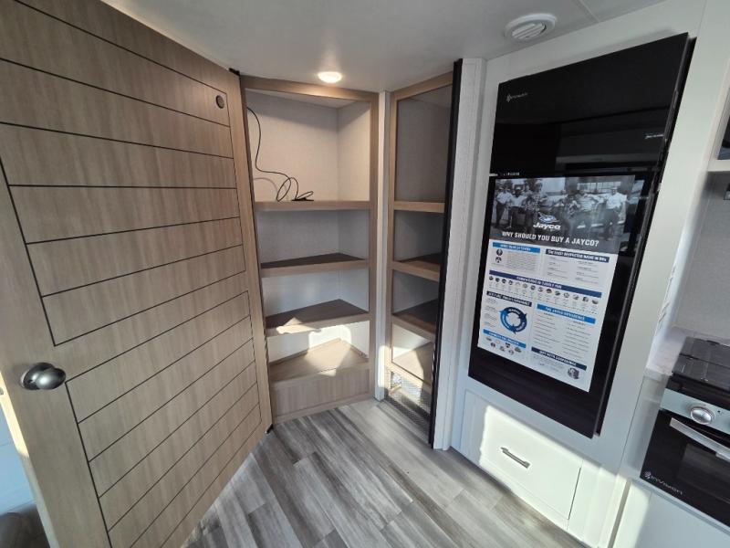 If space is what you're looking for in your next trailer, space is what you'll get this this Jay Flight SLX! The large slide houses the jack-knife sofa and booth dinette, and the added space here will provide everyone room to move about. The chef of your group will love cooking inside, or they can head outside to cook on the outdoor kitchen. Double-size bunks are sure to be a big hit with the little ones, and you'll love having your own space up front in the private bedroom. This unit includes ample storage space, including a hidden pantry with shelves, a bedroom closet plus dual bedside wardrobes, plus exterior storage for hiking or fishing gear!