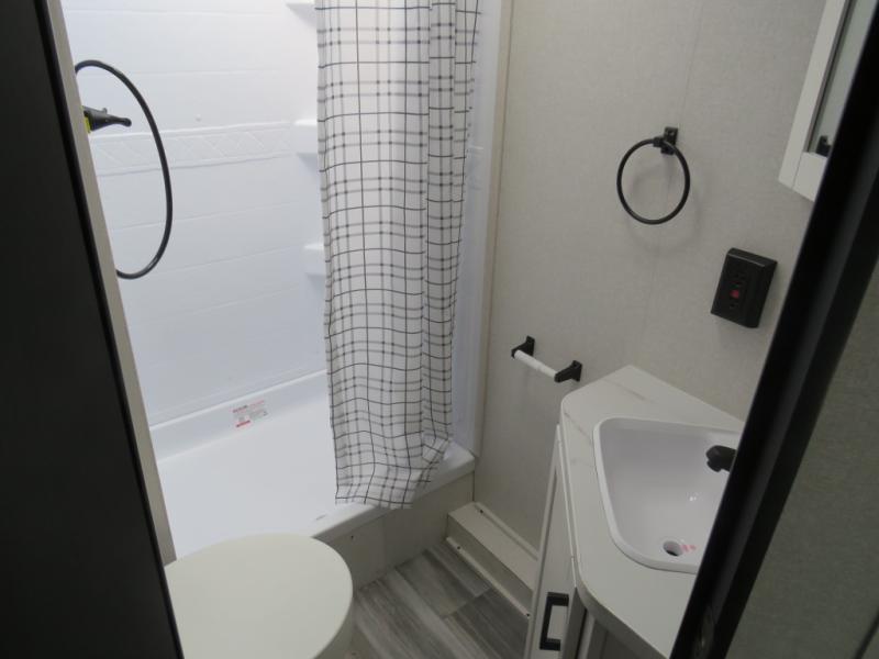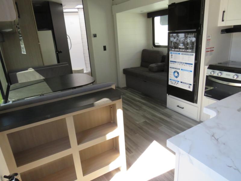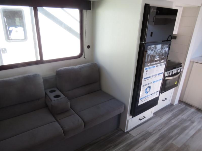 Wherever you decide to camp, you'll be met with comforts each day with this spacious travel trailer. There is a large slide out that will give the dog more space to nap on the floor. Your crew can relax on the jack-knife sofa, play a game at the booth dinette, or visit outdoors under the 16' power awning with LED lights. The outside kitchen is complete with an outdoor refrigerator for cold drinks, and there is an LP Quick Connect if you want to add your own grill. Head inside to clean up in the full bath, then head to bed in the front private bedroom. Here, you'll find a queen bed, dual wardrobes, plus a shelf for books. And your guests can sleep on the double-size bunks and living room furniture!
