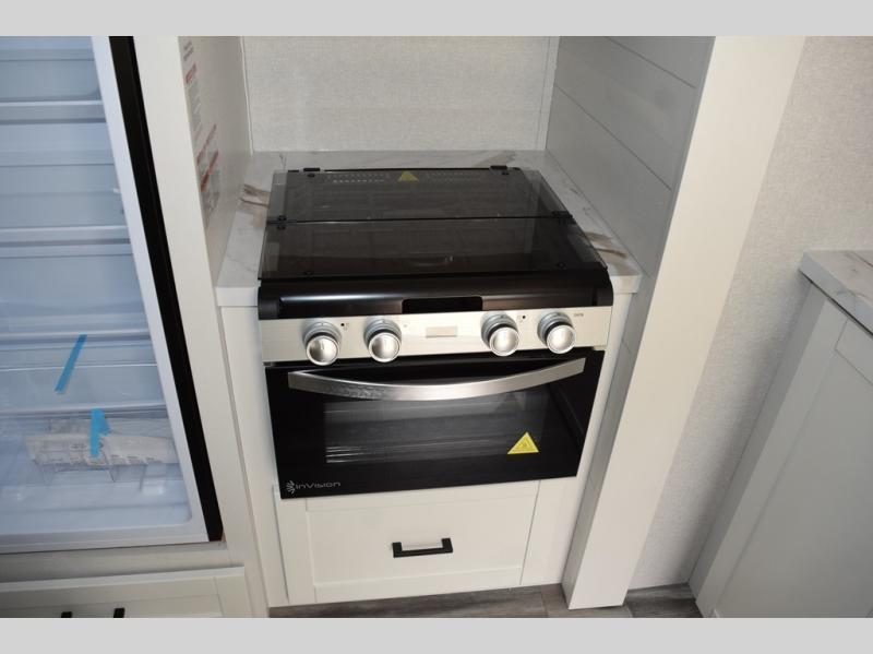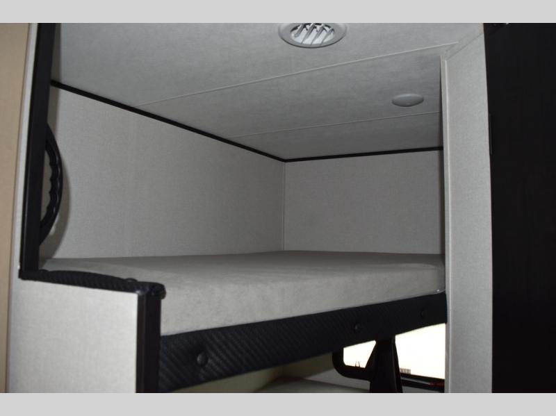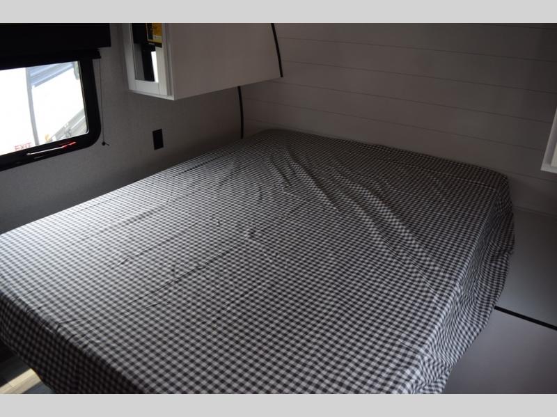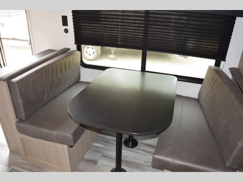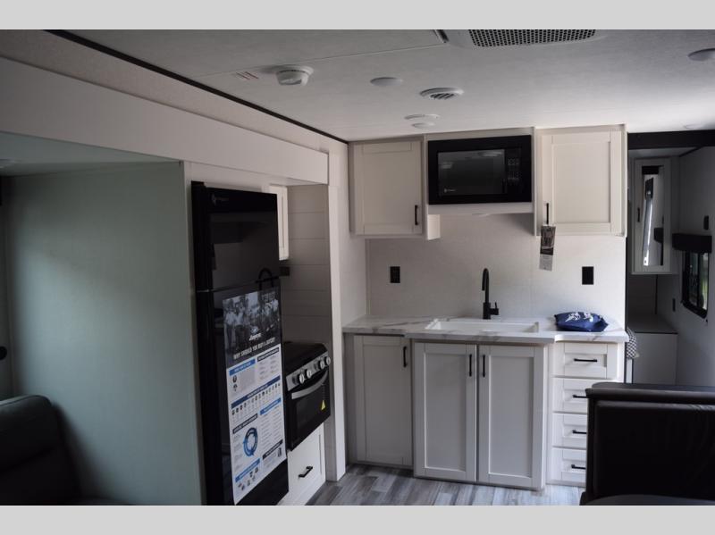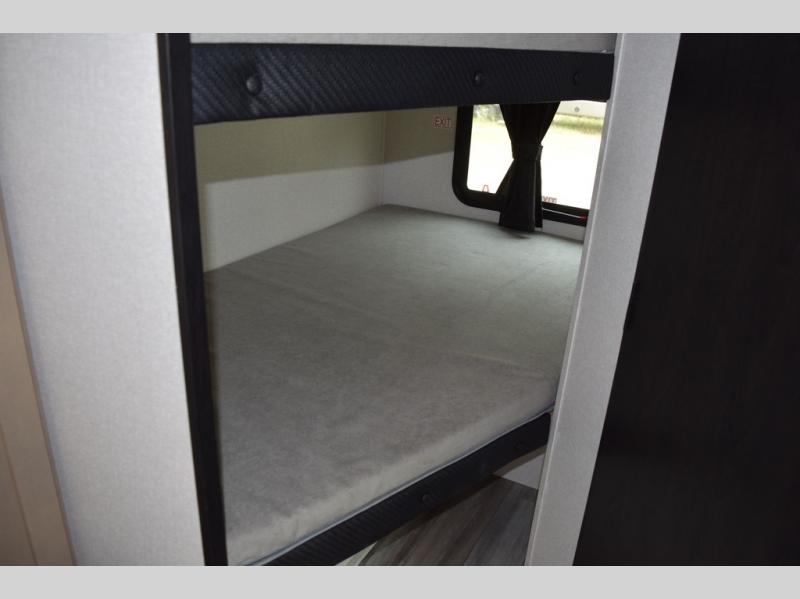 Wherever you decide to camp, you'll be met with comforts each day with this spacious travel trailer. There is a large slide out that will give the dog more space to nap on the floor. Your crew can relax on the jack-knife sofa, play a game at the booth dinette, or visit outdoors under the 16' power awning with LED lights. The outside kitchen is complete with an outdoor refrigerator for cold drinks, and there is an LP Quick Connect if you want to add your own grill. Head inside to clean up in the full bath, then head to bed in the front private bedroom. Here, you'll find a queen bed, dual wardrobes, plus a shelf for books. And your guests can sleep on the double-size bunks and living room furniture!