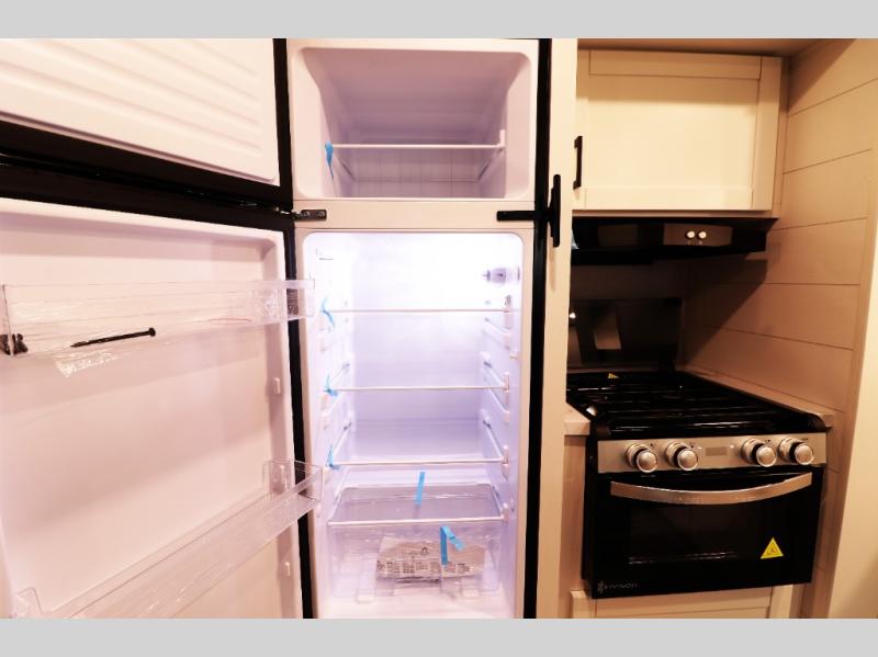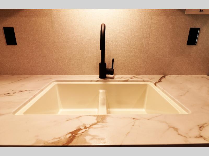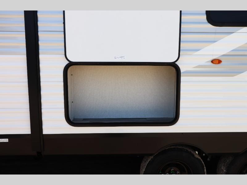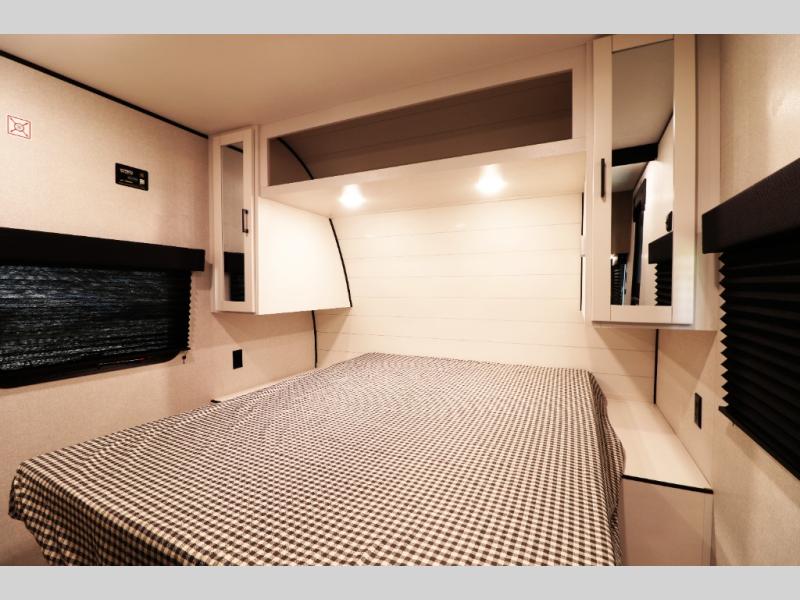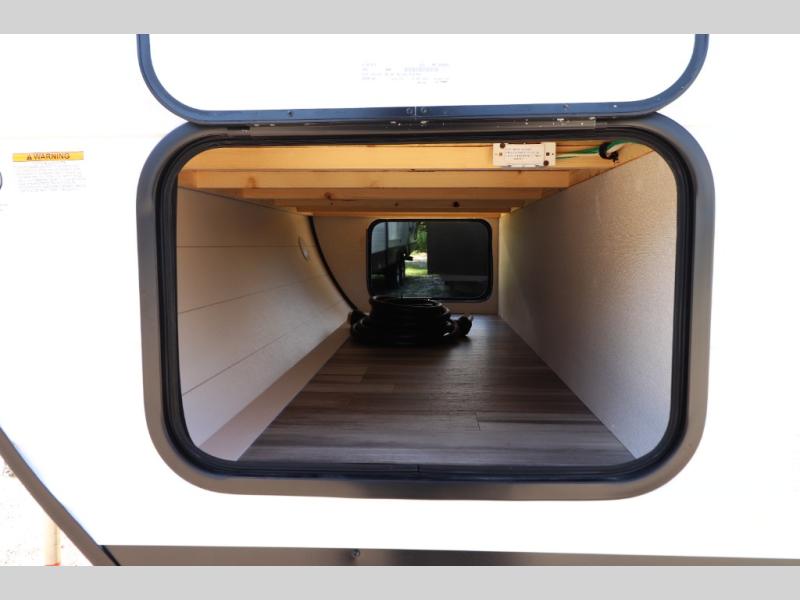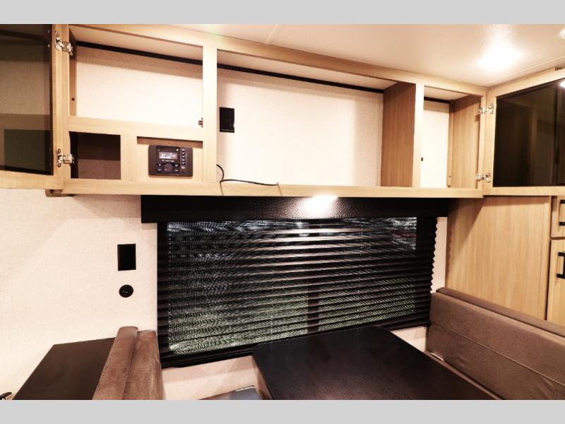 Premium interiors with storage: You're treated to solid hardwood cabinet doors, full-extension steel drawer guides, residential-style countertops, queen mattress platform storage, and a marine-grade foot-flush toilet. Oversized G20 tinted windows maximize daylight and privacy.