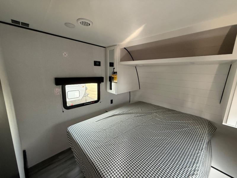 Wherever you decide to camp, you'll be met with comforts each day with this spacious travel trailer. There is a large slide out that will give the dog more space to nap on the floor. Your crew can relax on the jack-knife sofa, play a game at the booth dinette, or visit outdoors under the 16' power awning with LED lights. The outside kitchen is complete with an outdoor refrigerator for cold drinks, and there is an LP Quick Connect if you want to add your own grill. Head inside to clean up in the full bath, then head to bed in the front private bedroom. Here, you'll find a queen bed, dual wardrobes, plus a shelf for books. And your guests can sleep on the double-size bunks and living room furniture!