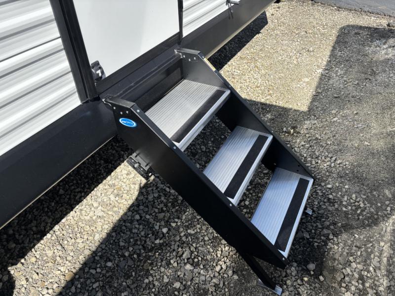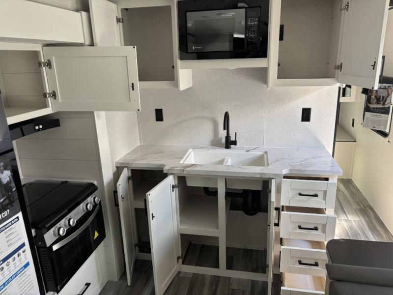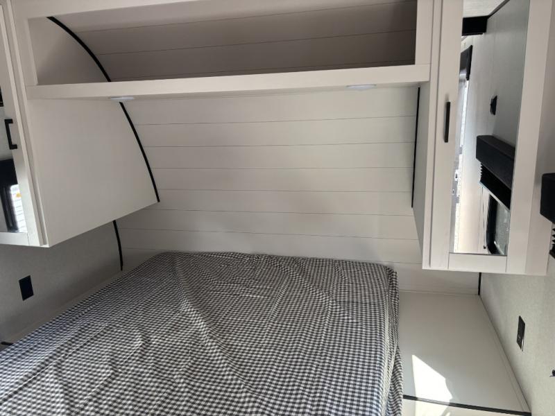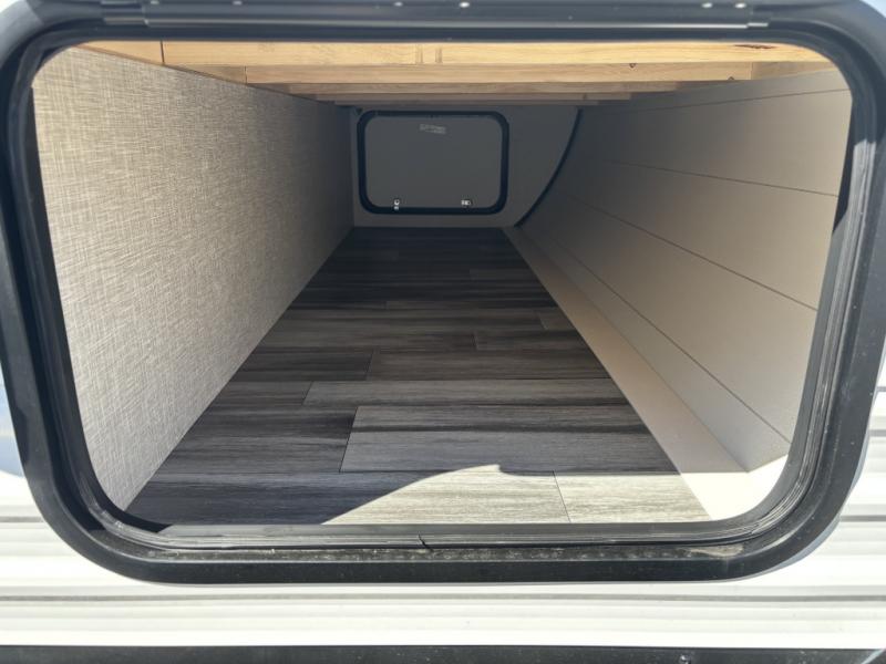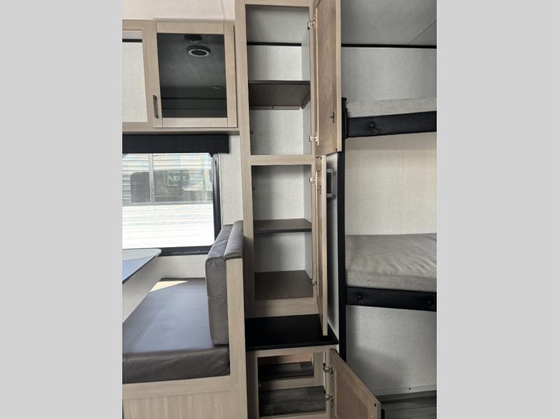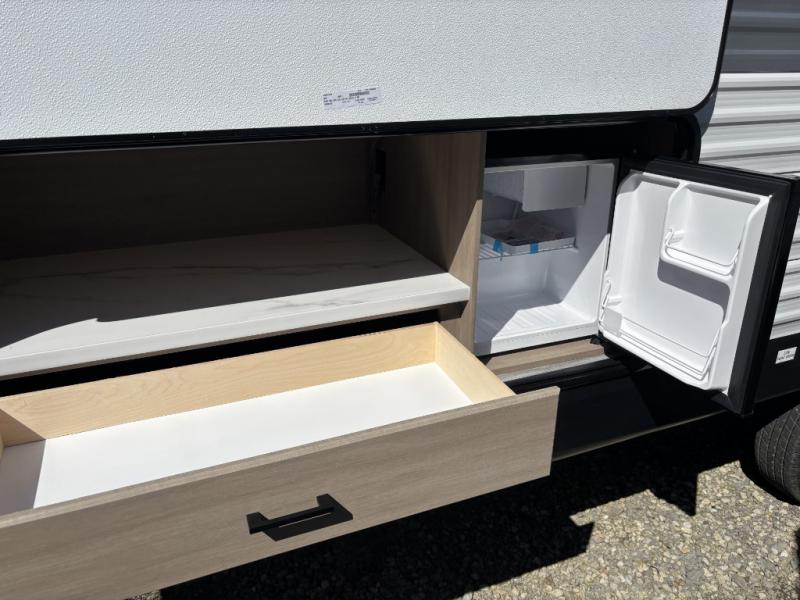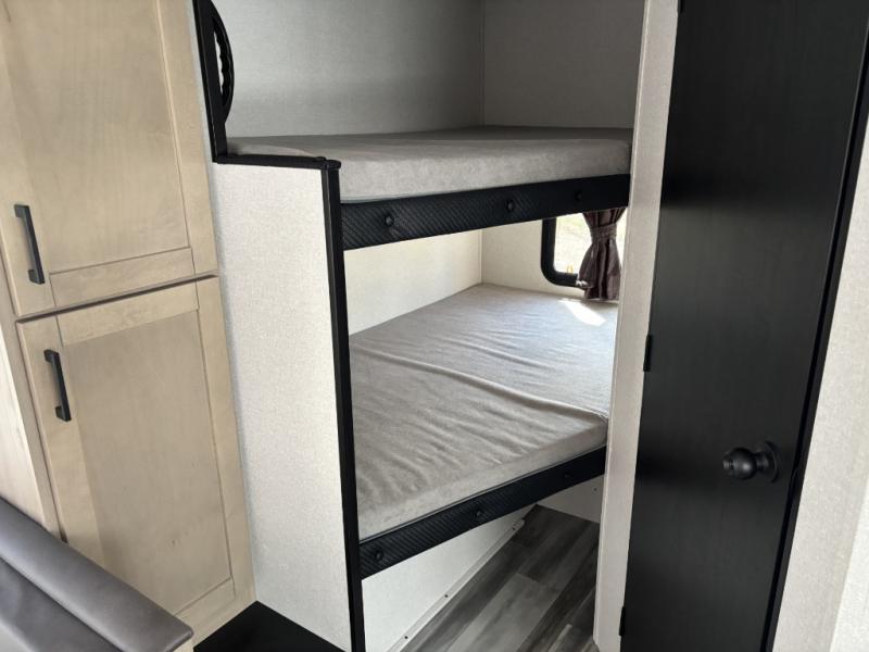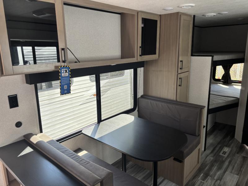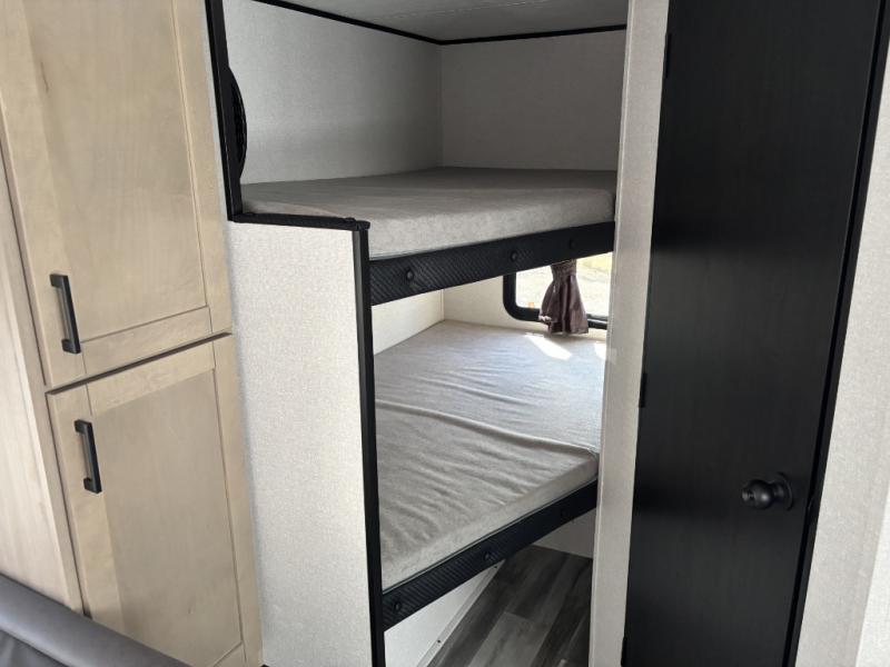 Wherever you decide to camp, you'll be met with comforts each day with this spacious travel trailer. There is a large slide out that will give the dog more space to nap on the floor. Your crew can relax on the jack-knife sofa, play a game at the booth dinette, or visit outdoors under the 16' power awning with LED lights. The outside kitchen is complete with an outdoor refrigerator for cold drinks, and there is an LP Quick Connect if you want to add your own grill. Head inside to clean up in the full bath, then head to bed in the front private bedroom. Here, you'll find a queen bed, dual wardrobes, plus a shelf for books. And your guests can sleep on the double-size bunks and living room furniture!
