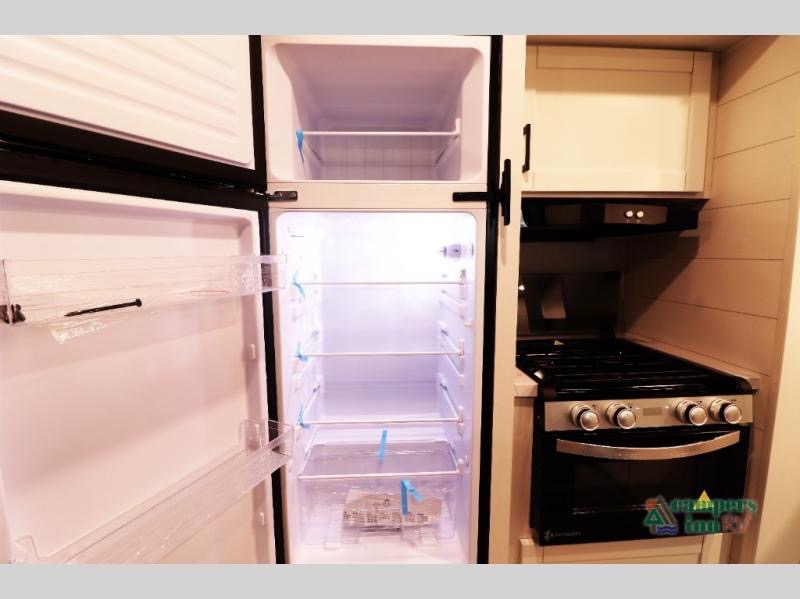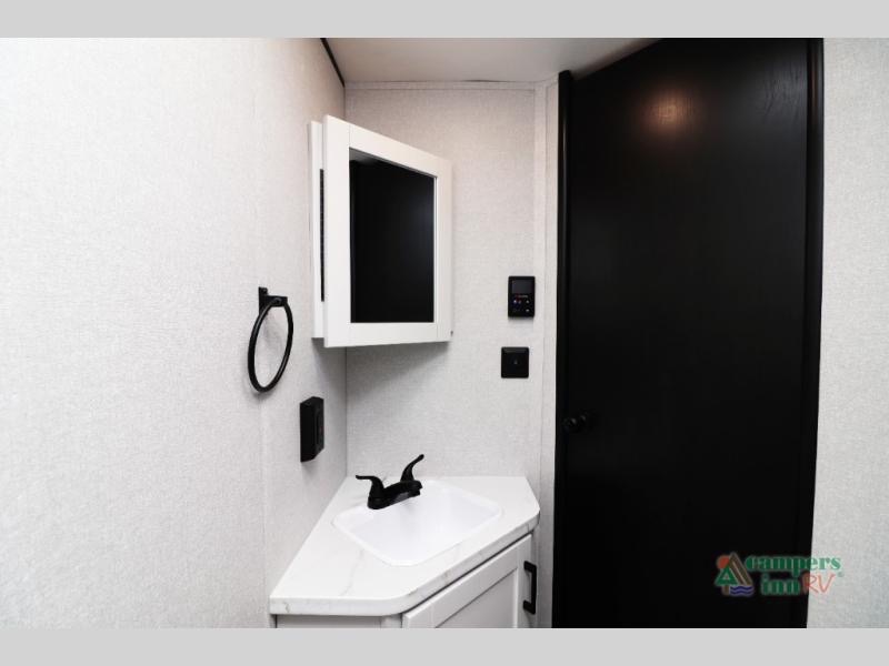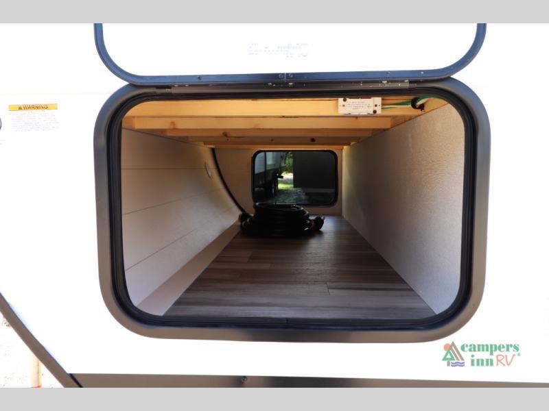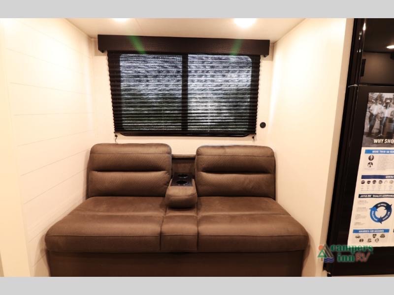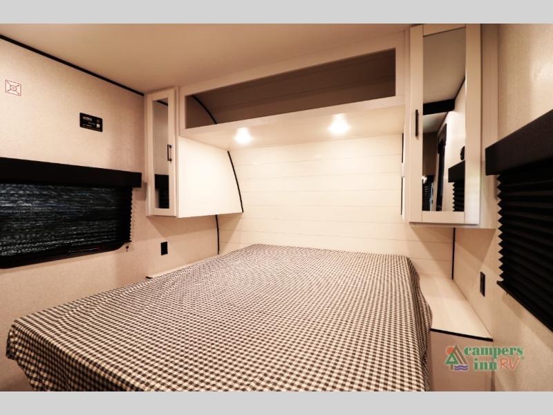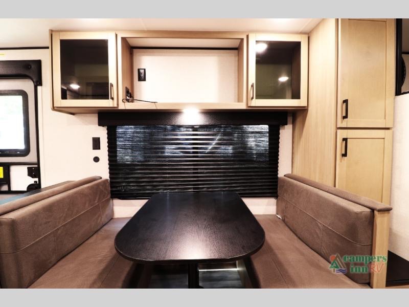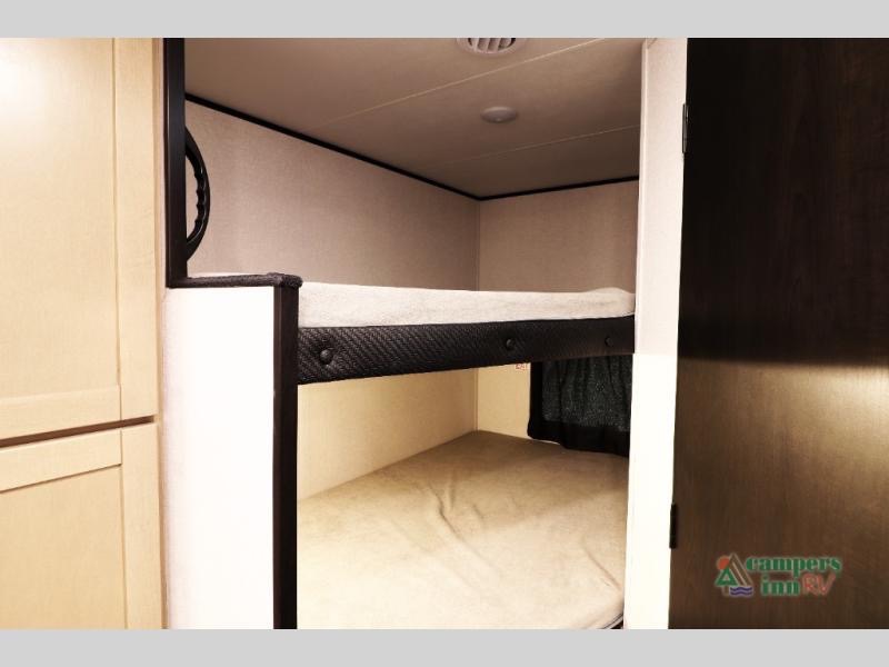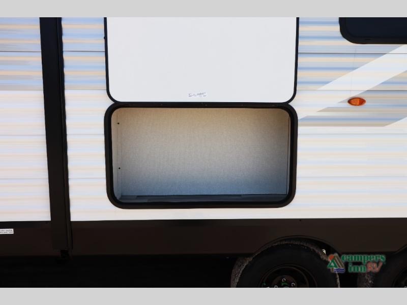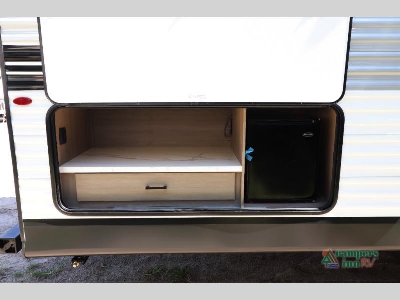 Wherever you decide to camp, you'll be met with comforts each day with this spacious travel trailer. There is a large slide out that will give the dog more space to nap on the floor. Your crew can relax on the jack-knife sofa, play a game at the booth dinette, or visit outdoors under the 16' power awning with LED lights. The outside kitchen is complete with an outdoor refrigerator for cold drinks, and there is an LP Quick Connect if you want to add your own grill. Head inside to clean up in the full bath, then head to bed in the front private bedroom. Here, you'll find a queen bed, dual wardrobes, plus a shelf for books. And your guests can sleep on the double-size bunks and living room furniture!