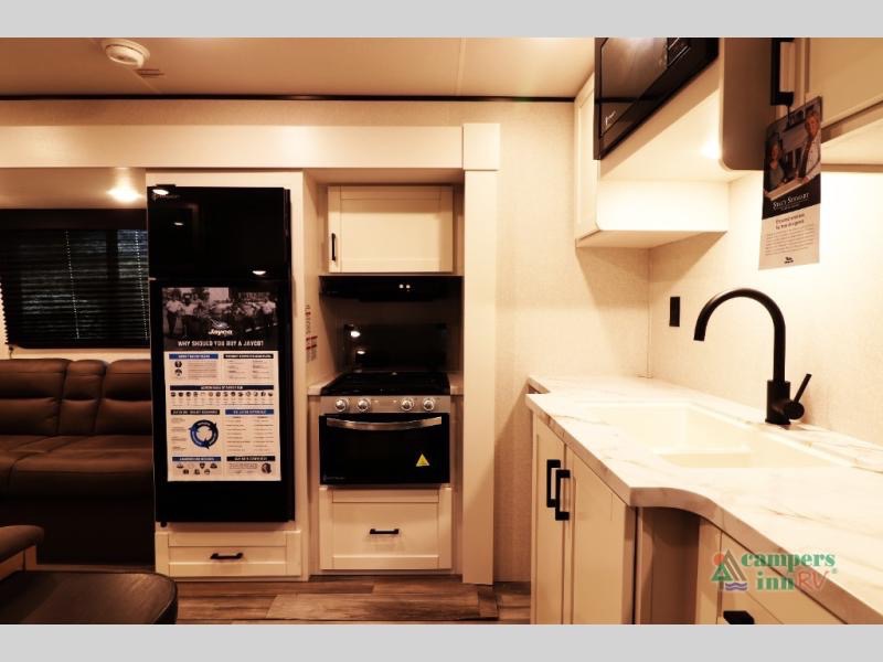 The Jayco Jay Flight SLX travel trailer is quite easy to own because it is lightweight for an easier towing experience. Built on a fully integrated A-frame with galvanized-steel, impact-resistant wheel wells, the Jay Flight SLX has quality at its very foundation. That quality continues on to the electric self-adjusting brakes, easy-lube hubs, Magnum Truss roof system, and LP quick connect. Some of what the mandatory Customer Value Package includes is backup camera prep, Keyed-Alike entry and baggage doors, and an on-demand tankless water heater.