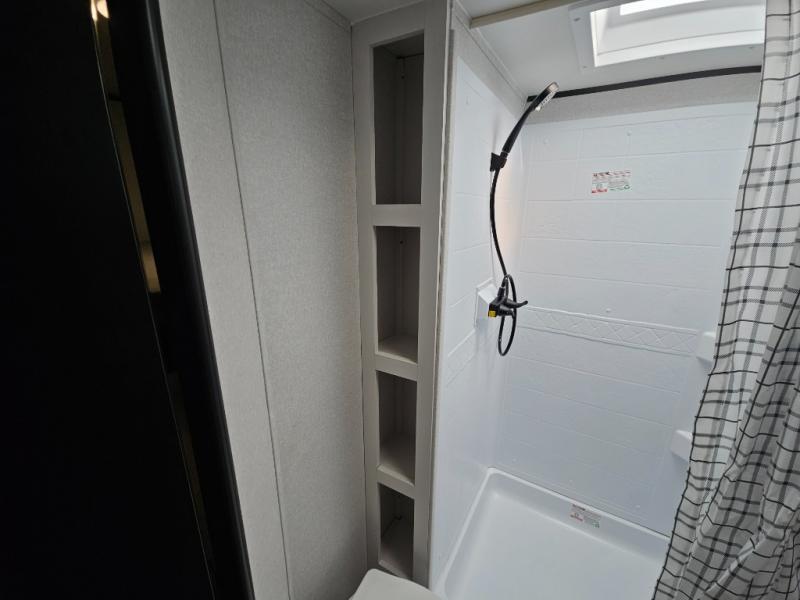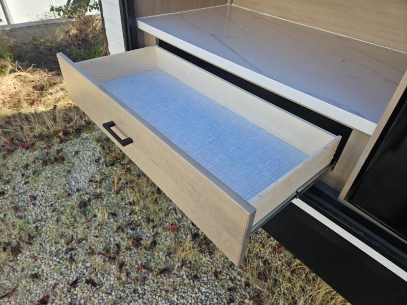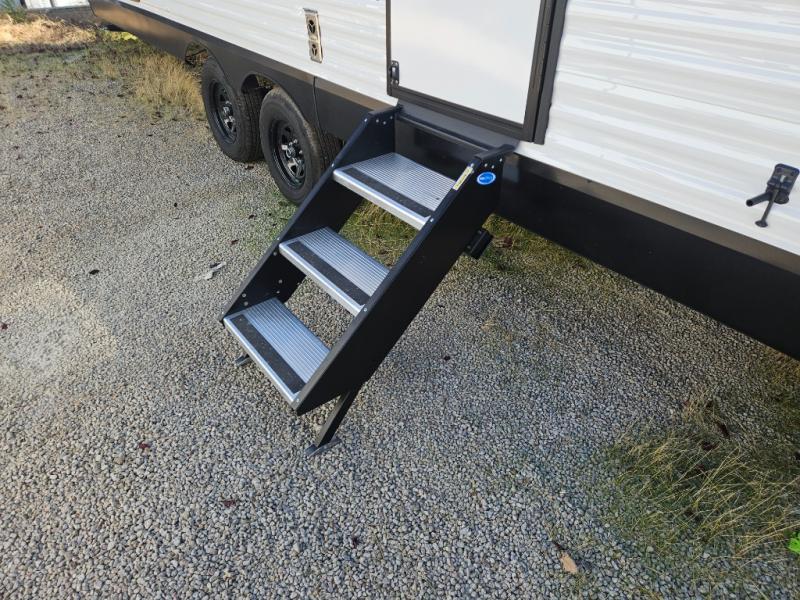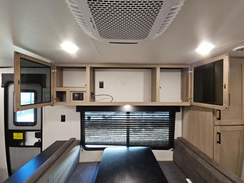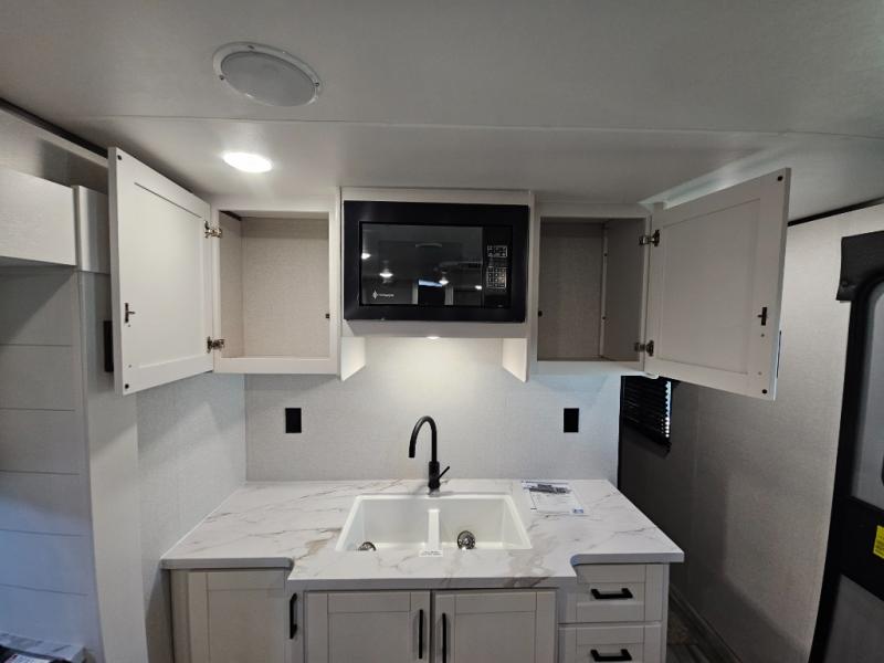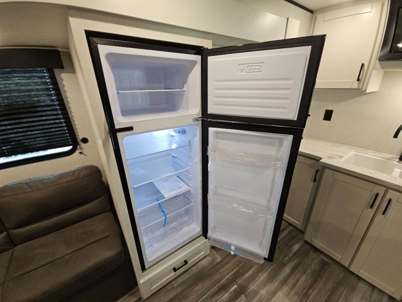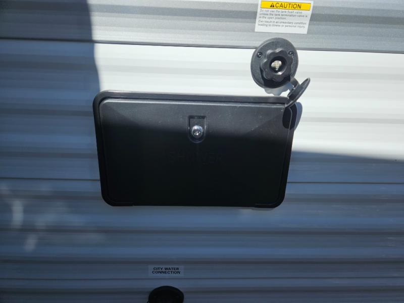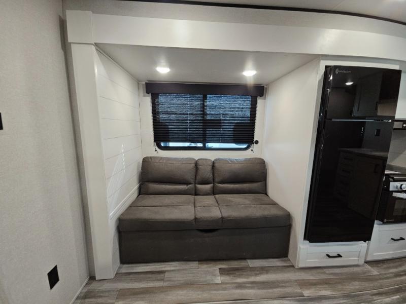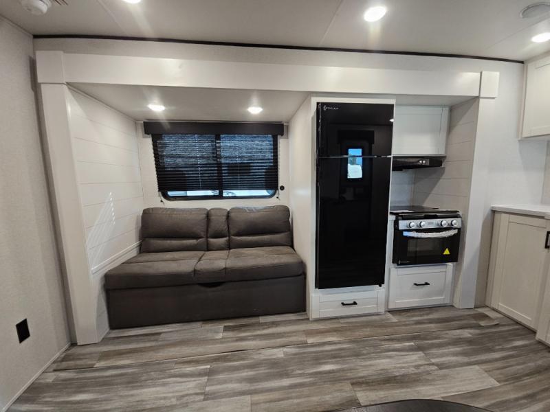 Wherever you decide to camp, you'll be met with comforts each day with this spacious travel trailer. There is a large slide out that will give the dog more space to nap on the floor. Your crew can relax on the jack-knife sofa, play a game at the booth dinette, or visit outdoors under the 16' power awning with LED lights. The outside kitchen is complete with an outdoor refrigerator for cold drinks, and there is an LP Quick Connect if you want to add your own grill. Head inside to clean up in the full bath, then head to bed in the front private bedroom. Here, you'll find a queen bed, dual wardrobes, plus a shelf for books. And your guests can sleep on the double-size bunks and living room furniture!