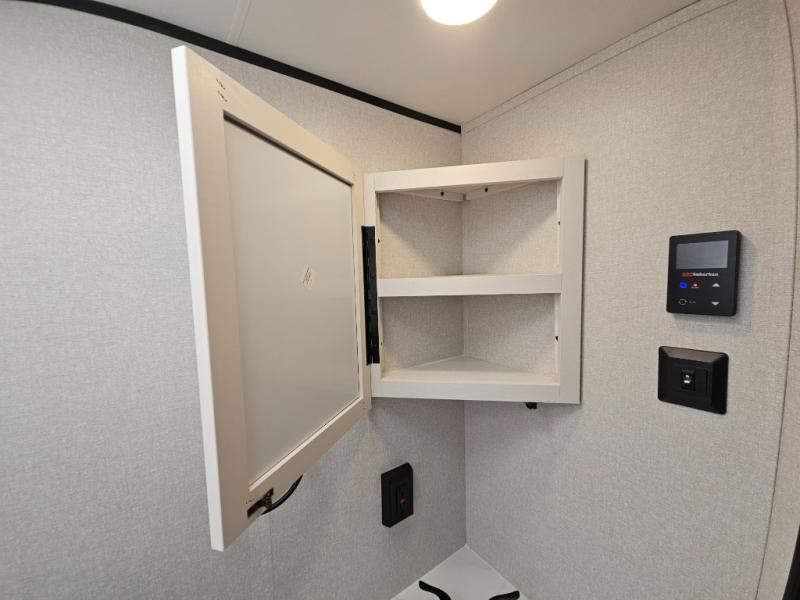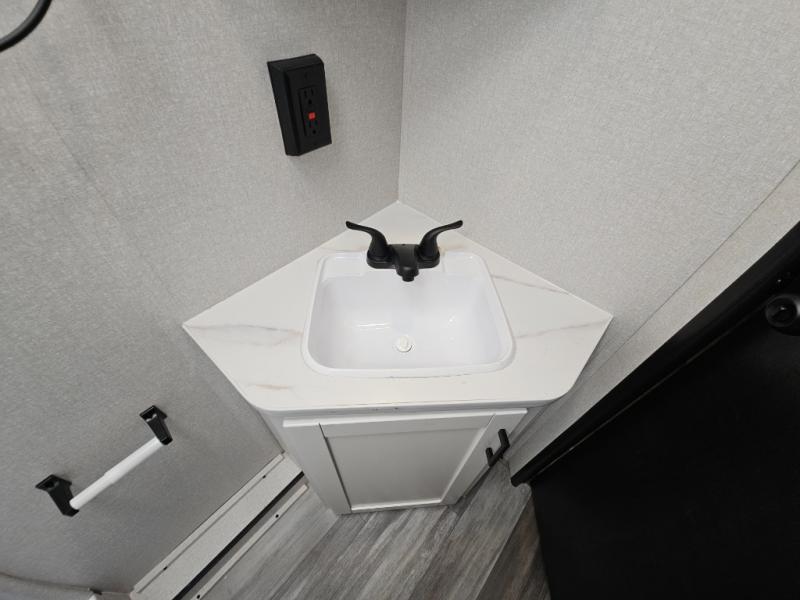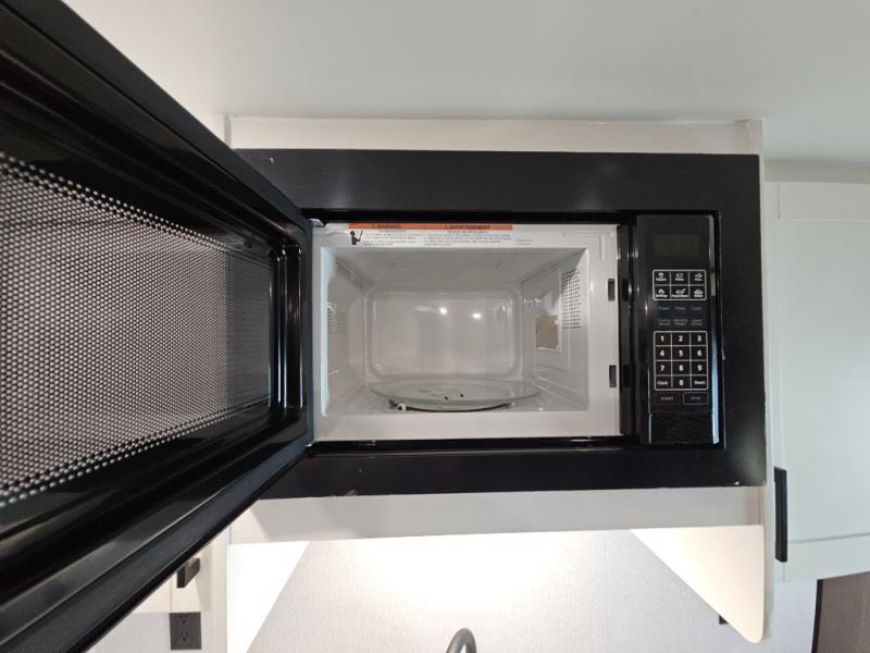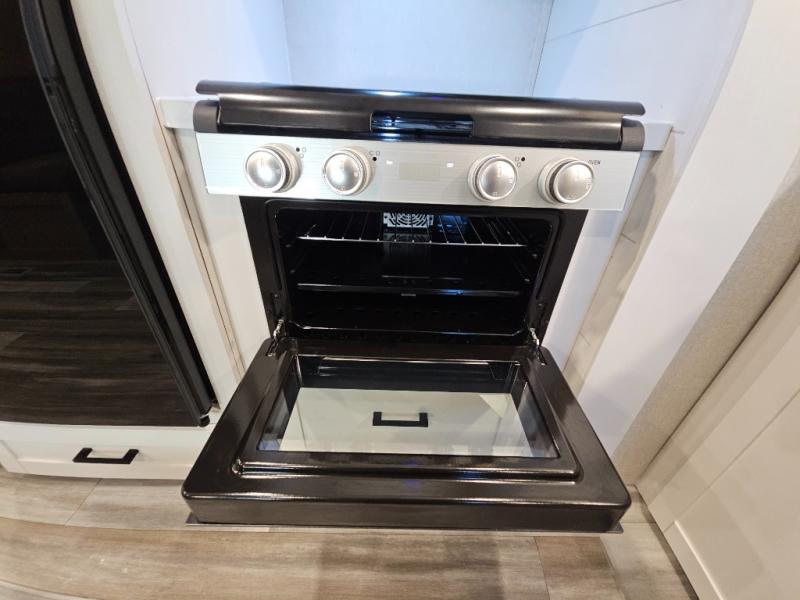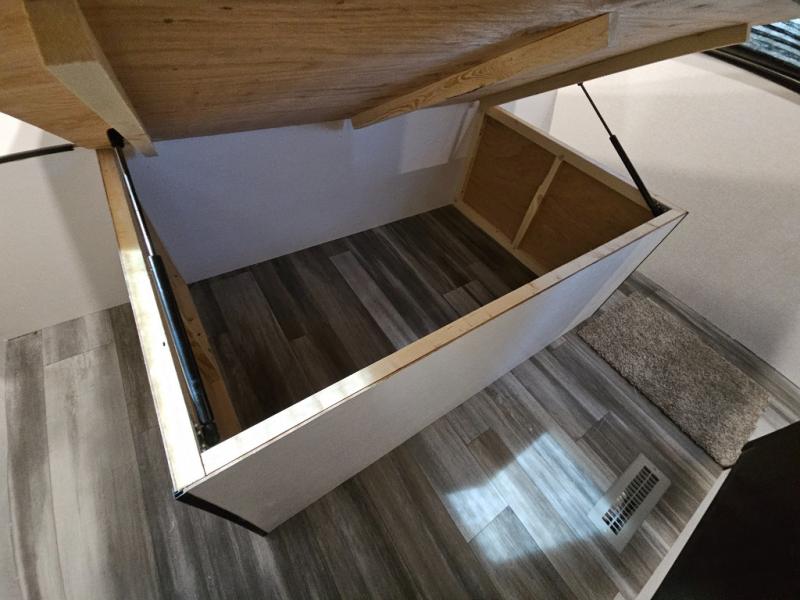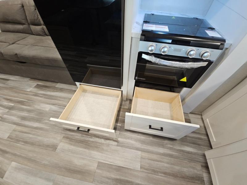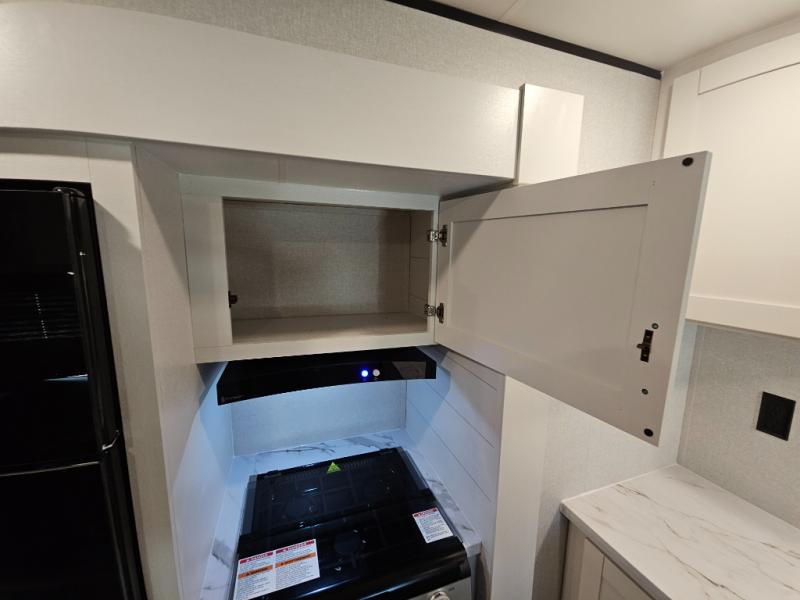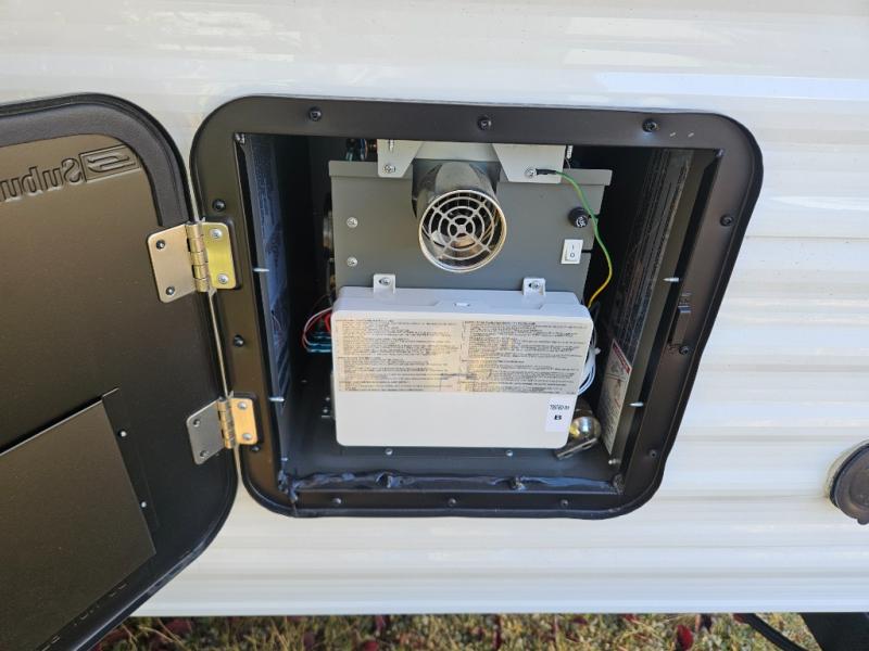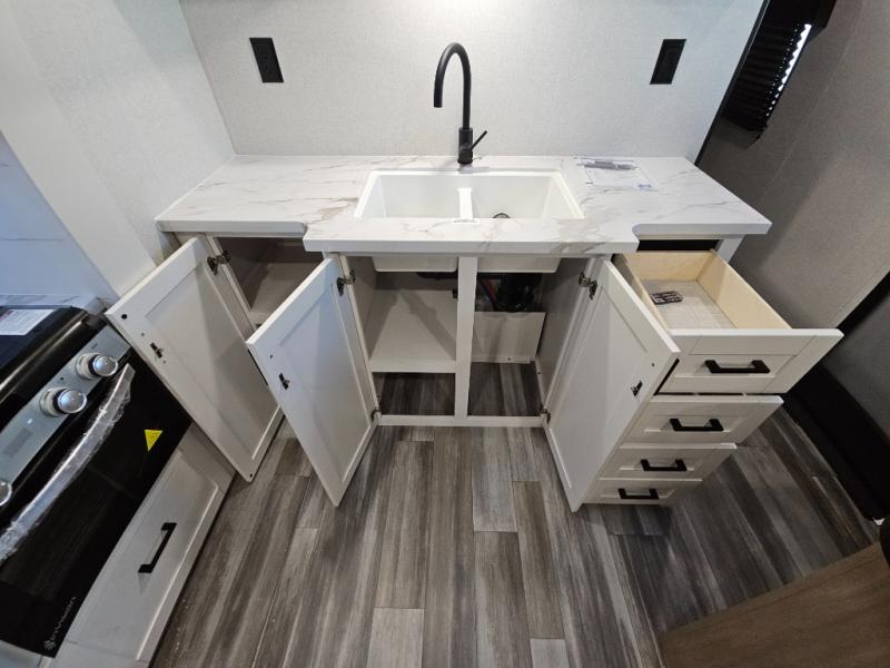 Wherever you decide to camp, you'll be met with comforts each day with this spacious travel trailer. There is a large slide out that will give the dog more space to nap on the floor. Your crew can relax on the jack-knife sofa, play a game at the booth dinette, or visit outdoors under the 16' power awning with LED lights. The outside kitchen is complete with an outdoor refrigerator for cold drinks, and there is an LP Quick Connect if you want to add your own grill. Head inside to clean up in the full bath, then head to bed in the front private bedroom. Here, you'll find a queen bed, dual wardrobes, plus a shelf for books. And your guests can sleep on the double-size bunks and living room furniture!