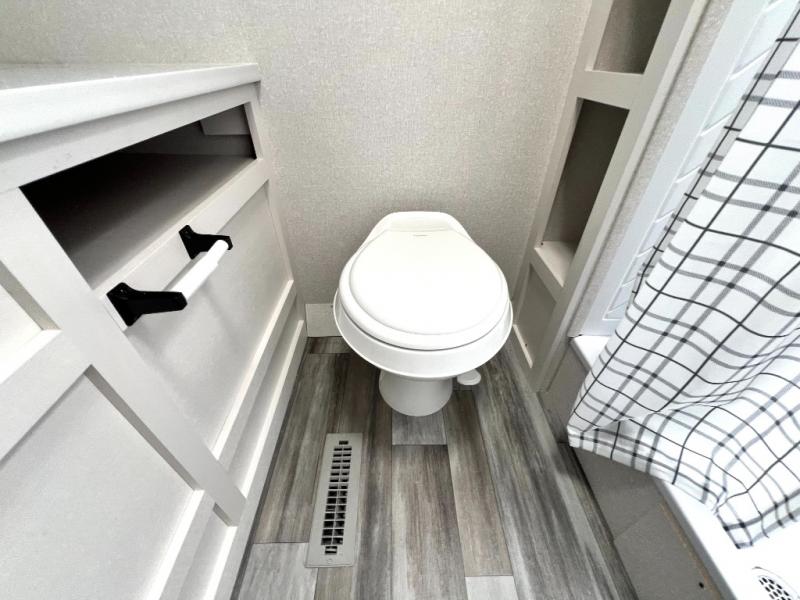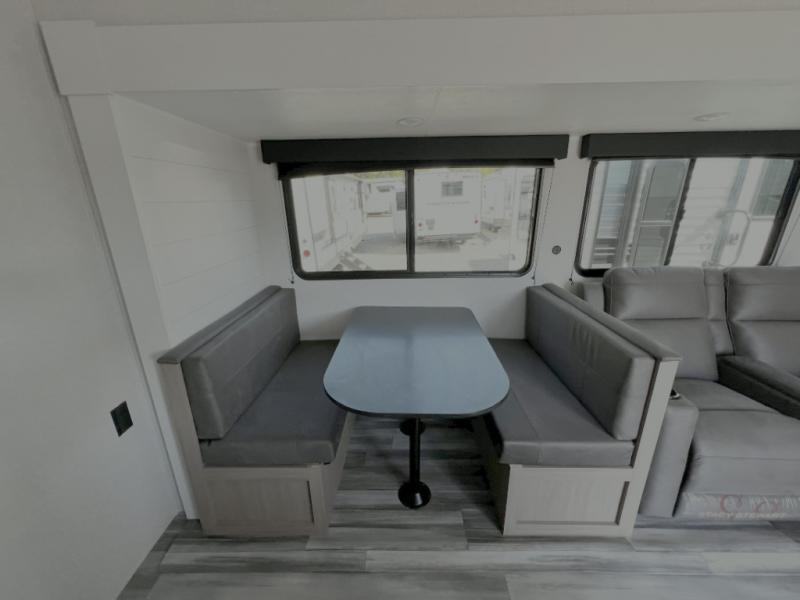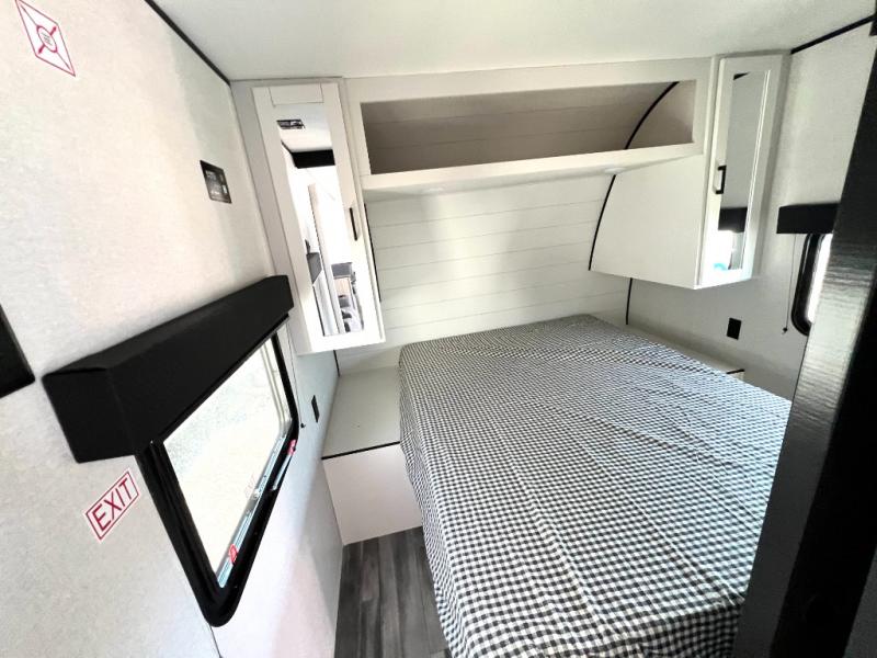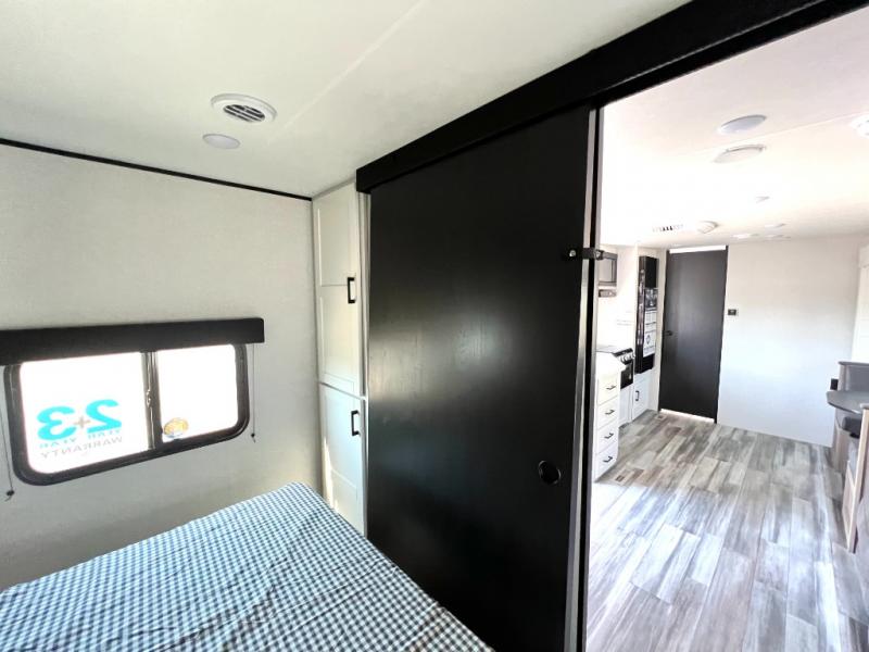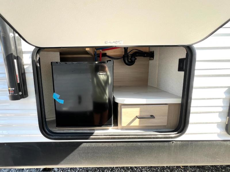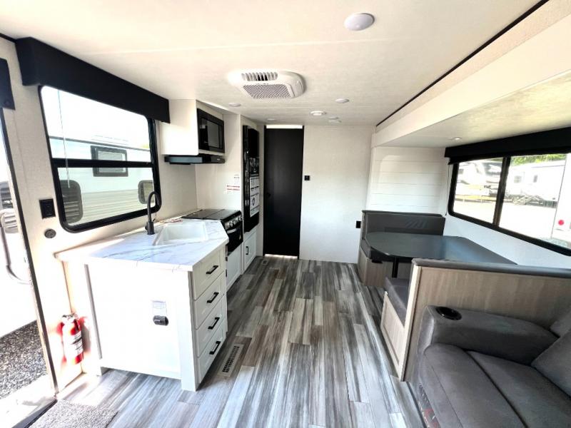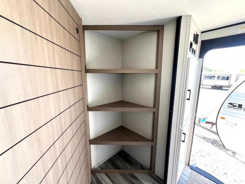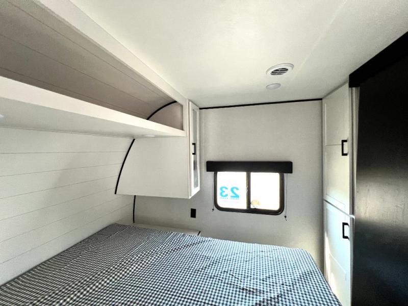 Camping trips just got a whole lot better in this spacious travel trailer for four! You'll love having a private bedroom up front with a queen bed and dual bedside wardrobes, while your guests sleep on the jack-knife sofa and booth dinette within the large slide out. There is a fully-equipped kitchen to make meals each day, plus a hidden pantry with shelves for games and a second pantry to keep snacks stocked. The full rear bath is both spacious and convenient since it's tuck away in the back. Start camping today!