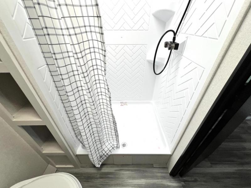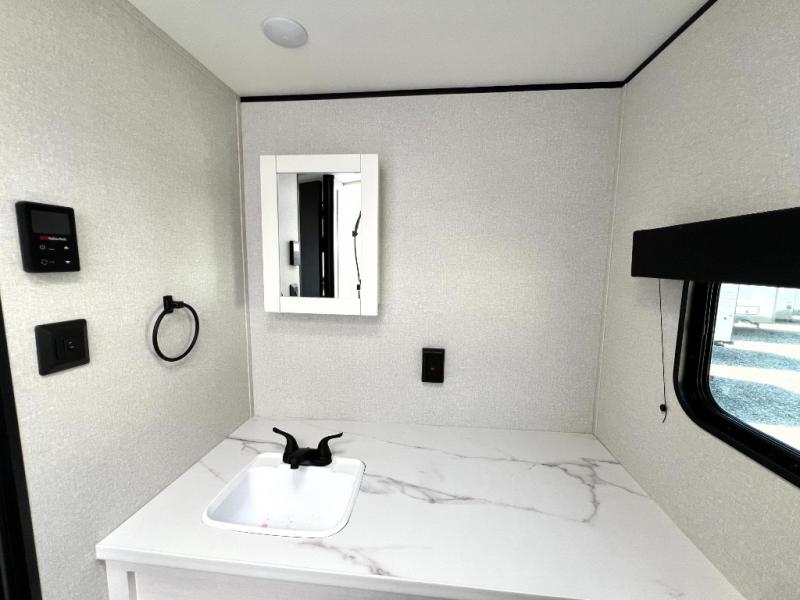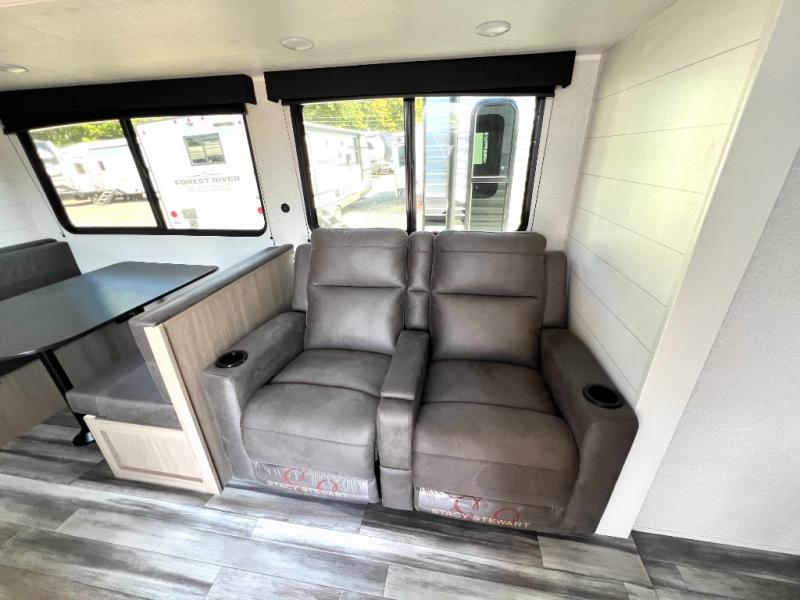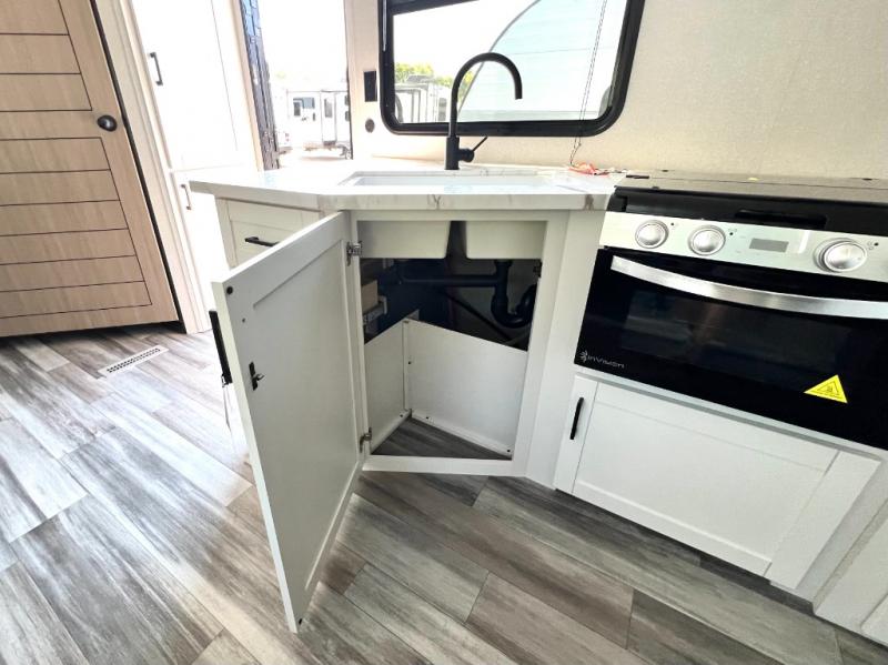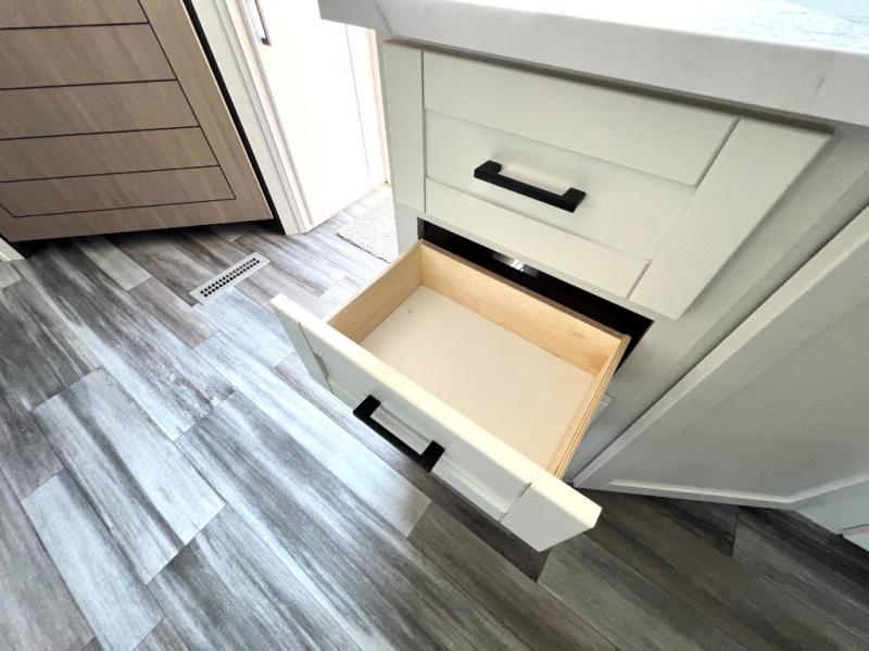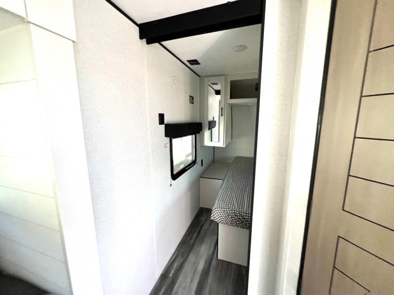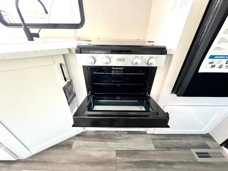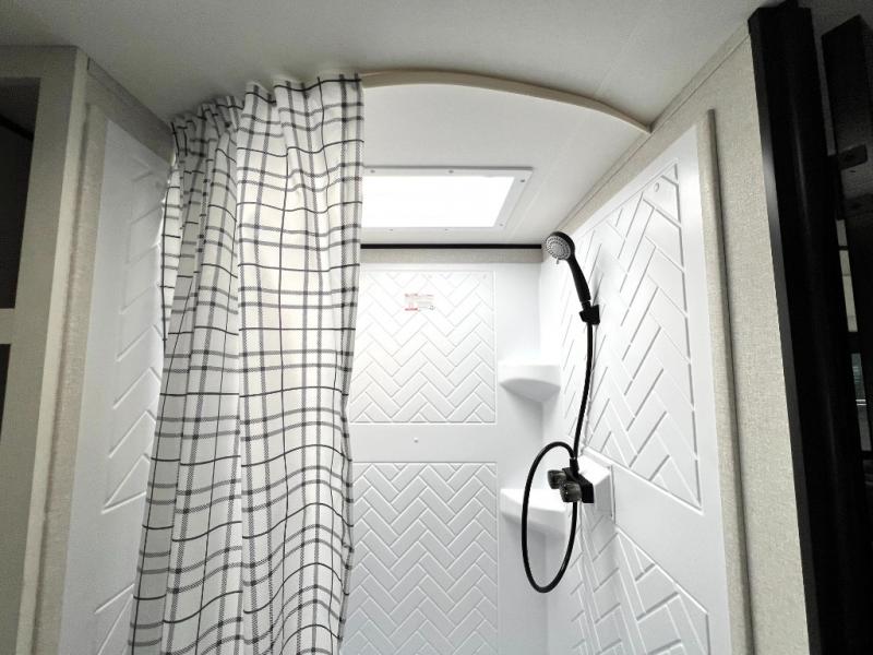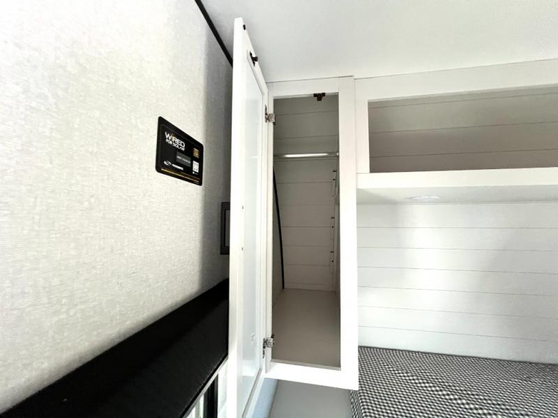 Camping trips just got a whole lot better in this spacious travel trailer for four! You'll love having a private bedroom up front with a queen bed and dual bedside wardrobes, while your guests sleep on the jack-knife sofa and booth dinette within the large slide out. There is a fully-equipped kitchen to make meals each day, plus a hidden pantry with shelves for games and a second pantry to keep snacks stocked. The full rear bath is both spacious and convenient since it's tuck away in the back. Start camping today!