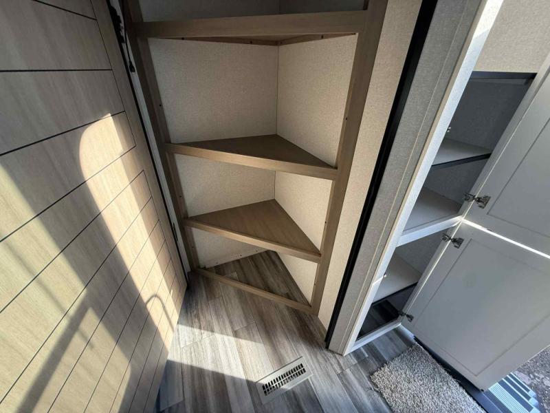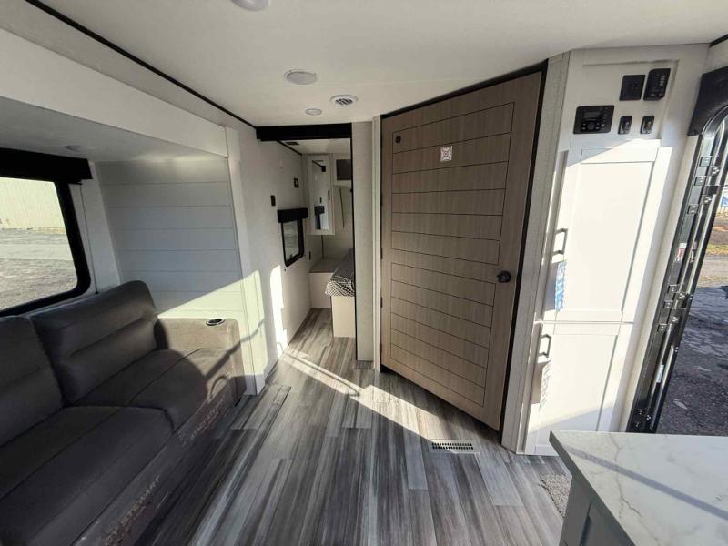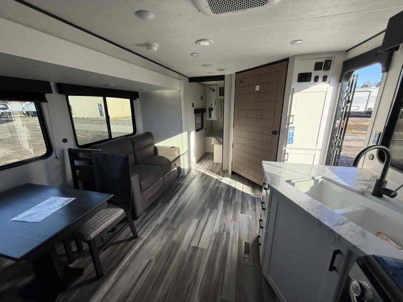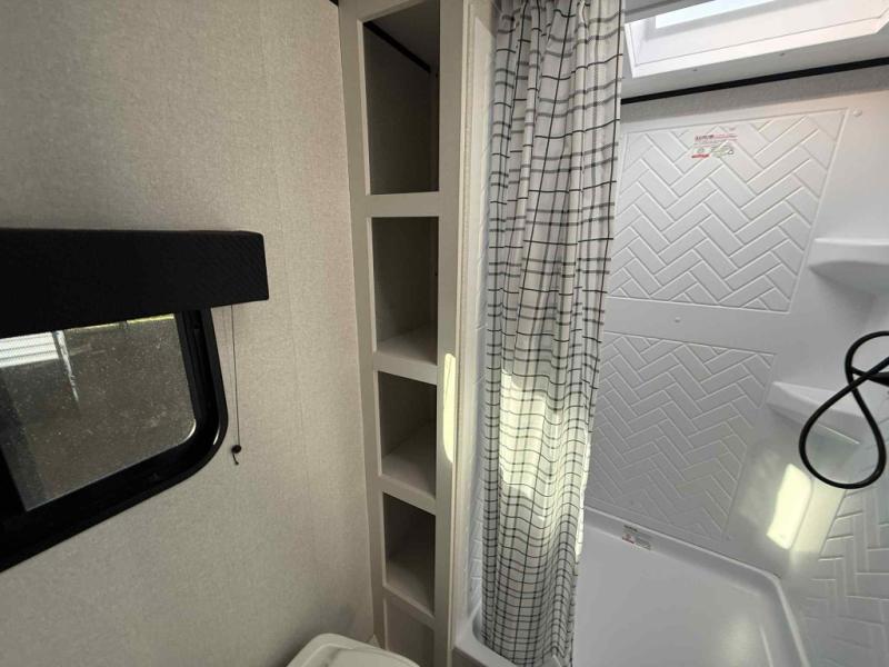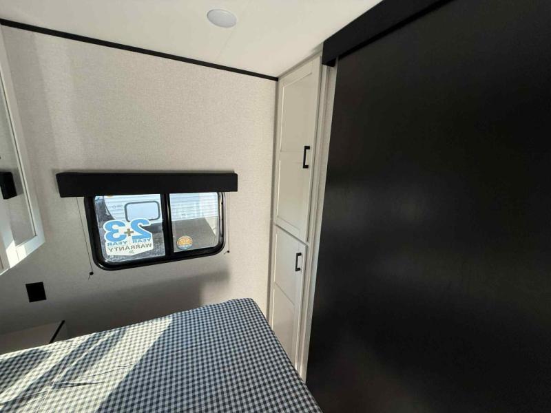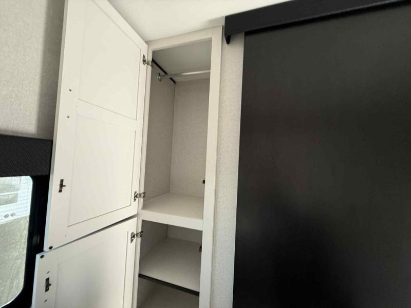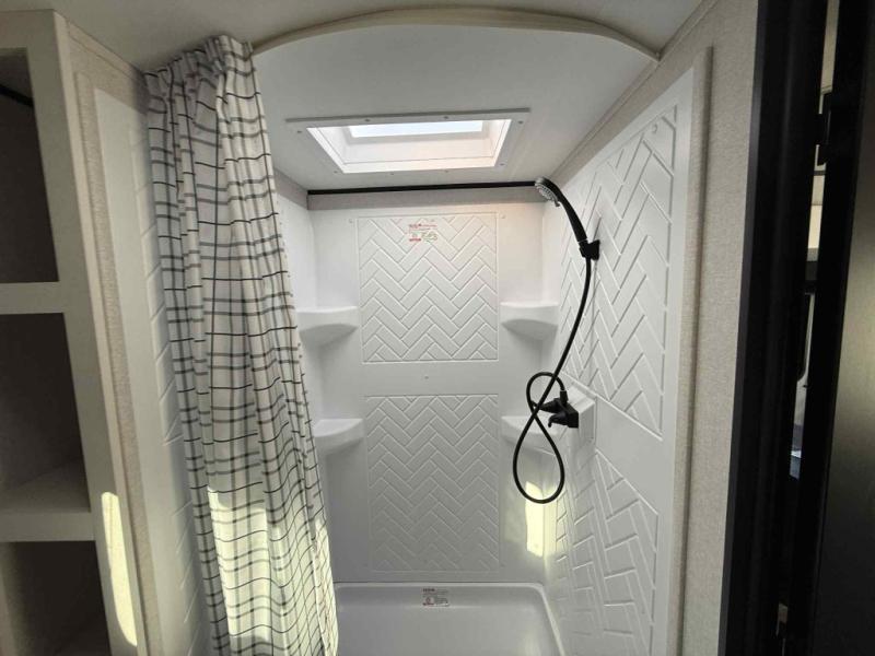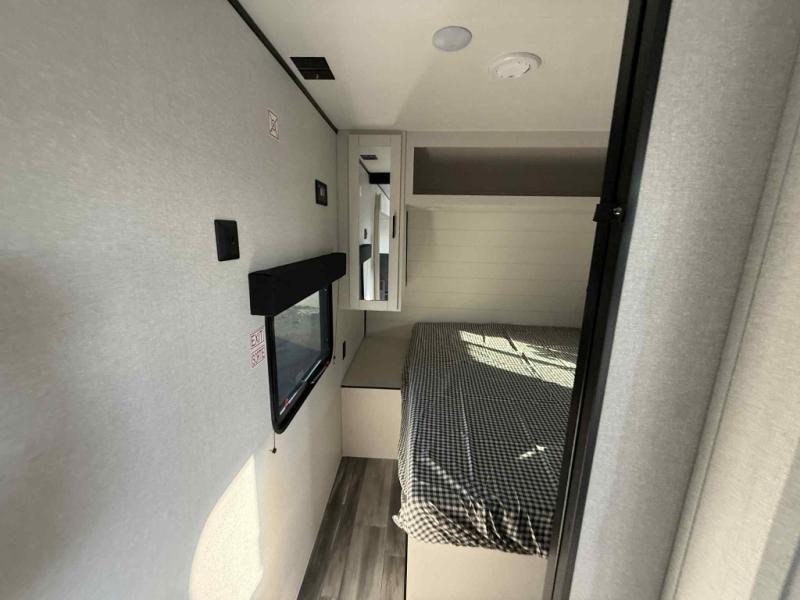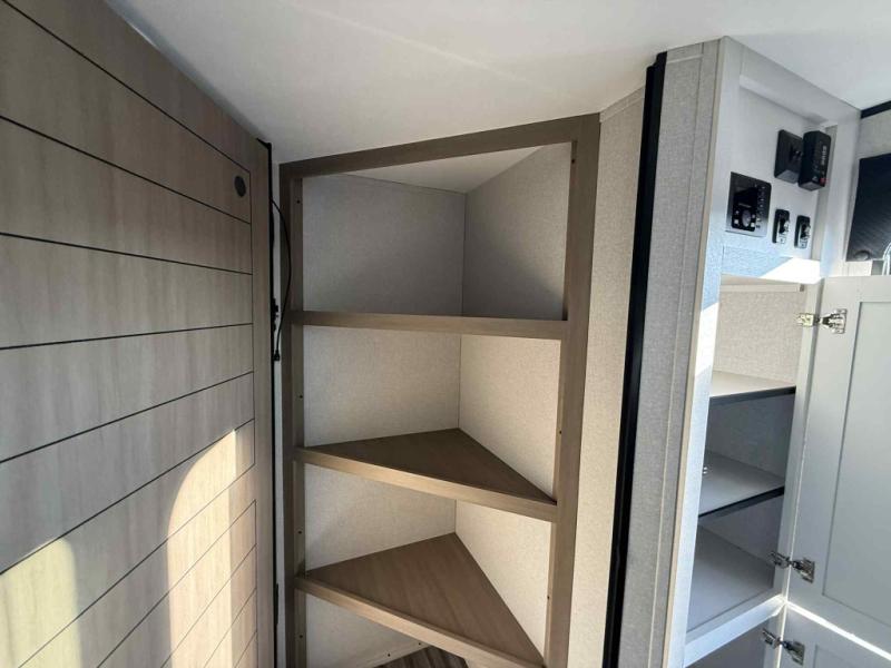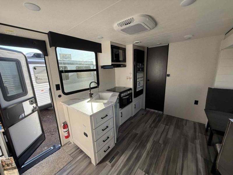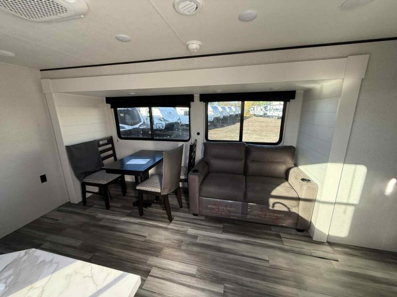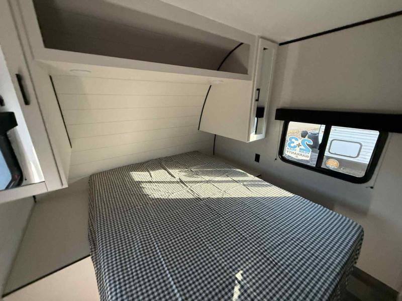 Camping trips just got a whole lot better in this spacious travel trailer for four! You'll love having a private bedroom up front with a queen bed and dual bedside wardrobes, while your guests sleep on the jack-knife sofa and booth dinette within the large slide out. There is a fully-equipped kitchen to make meals each day, plus a hidden pantry with shelves for games and a second pantry to keep snacks stocked. The full rear bath is both spacious and convenient since it's tuck away in the back. Start camping today!