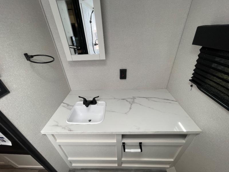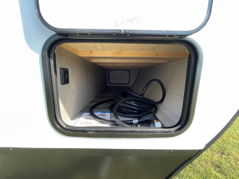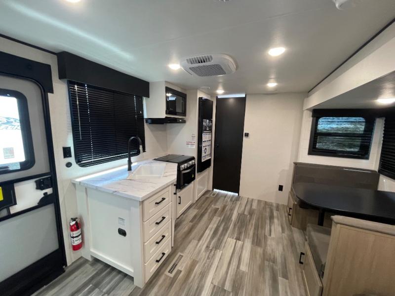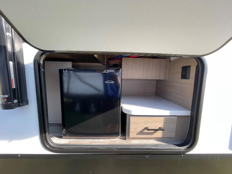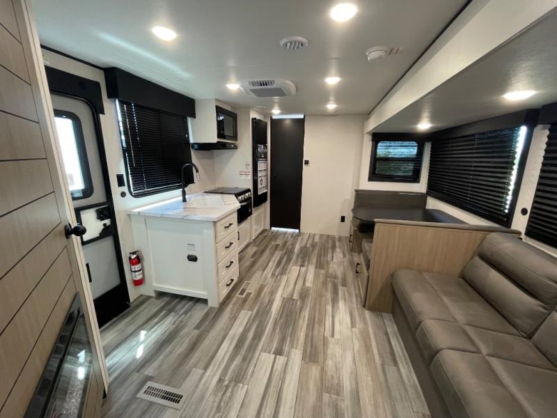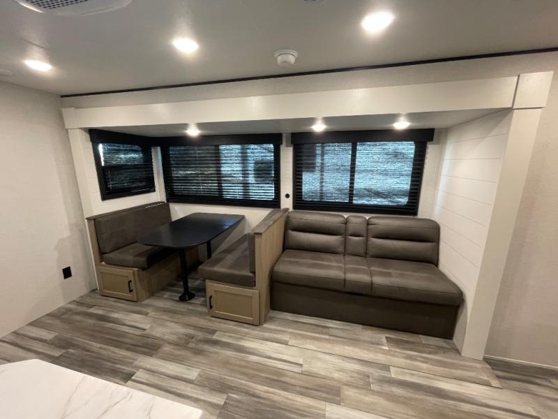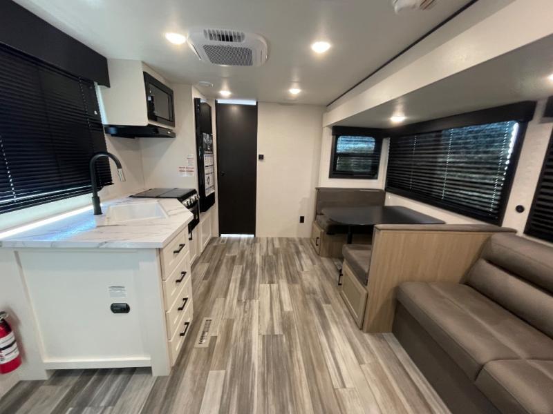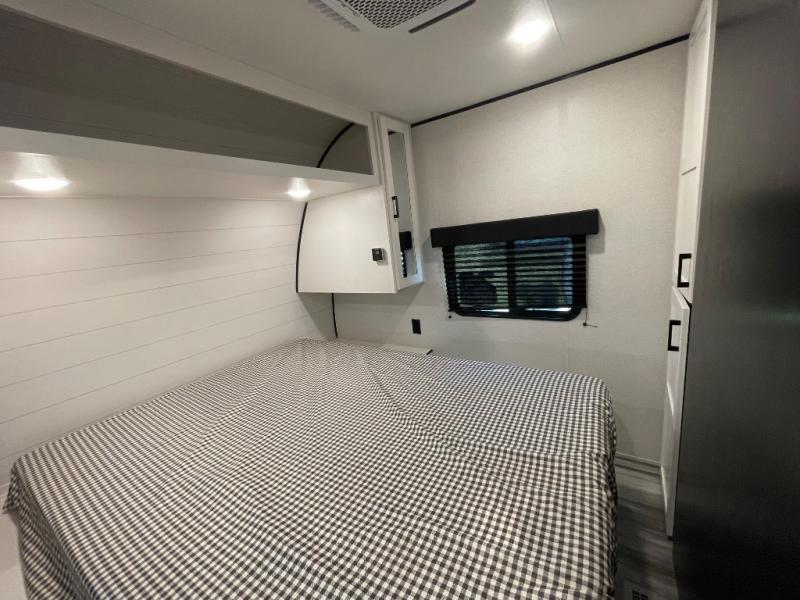 Camping trips just got a whole lot better in this spacious travel trailer for four! You'll love having a private bedroom up front with a queen bed and dual bedside wardrobes, while your guests sleep on the jack-knife sofa and booth dinette within the large slide out. There is a fully-equipped kitchen to make meals each day, plus a hidden pantry with shelves for games and a second pantry to keep snacks stocked. The full rear bath is both spacious and convenient since it's tuck away in the back. Start camping today!
