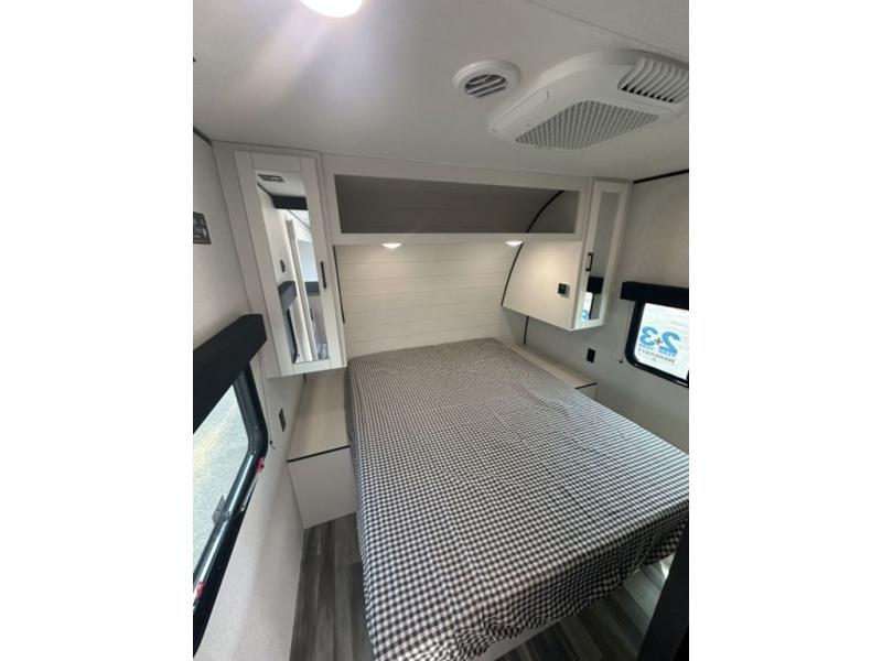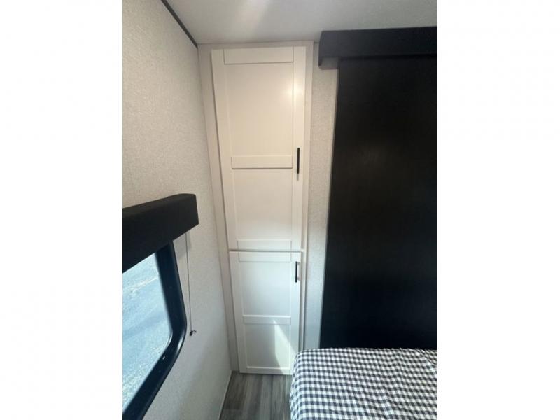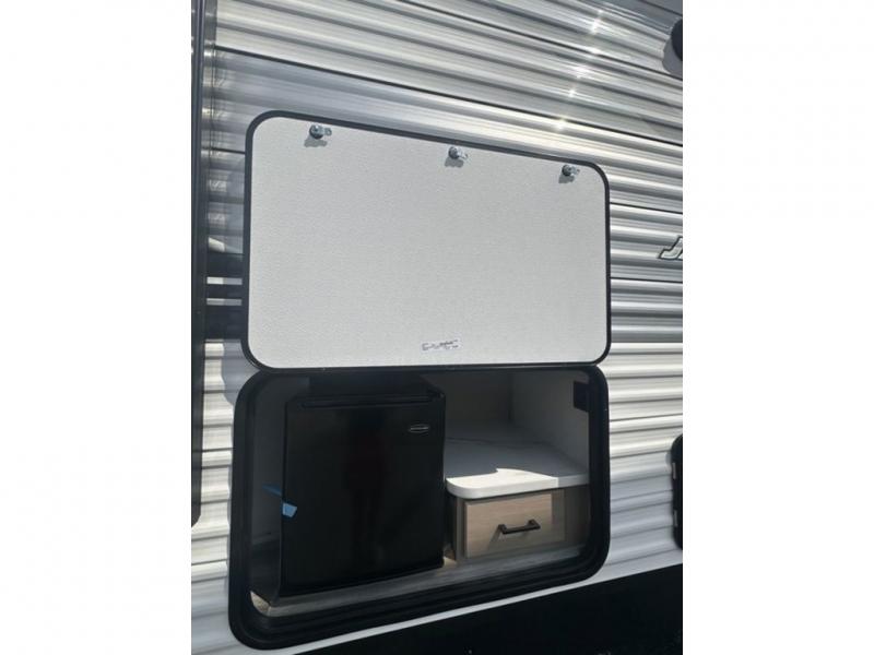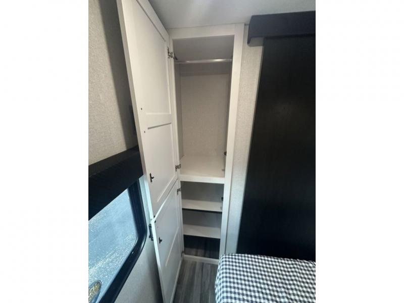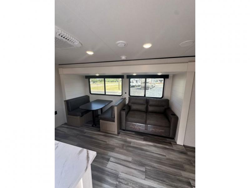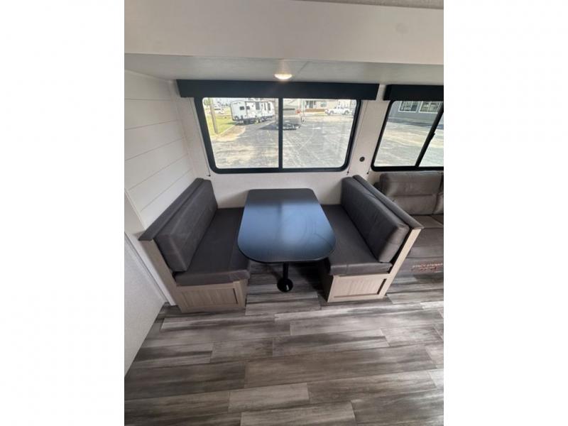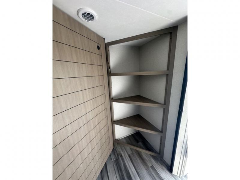 Camping trips just got a whole lot better in this spacious travel trailer for four! You'll love having a private bedroom up front with a queen bed and dual bedside wardrobes, while your guests sleep on the jack-knife sofa and booth dinette within the large slide out. There is a fully-equipped kitchen to make meals each day, plus a hidden pantry with shelves for games and a second pantry to keep snacks stocked. The full rear bath is both spacious and convenient since it's tuck away in the back. Start camping today!
